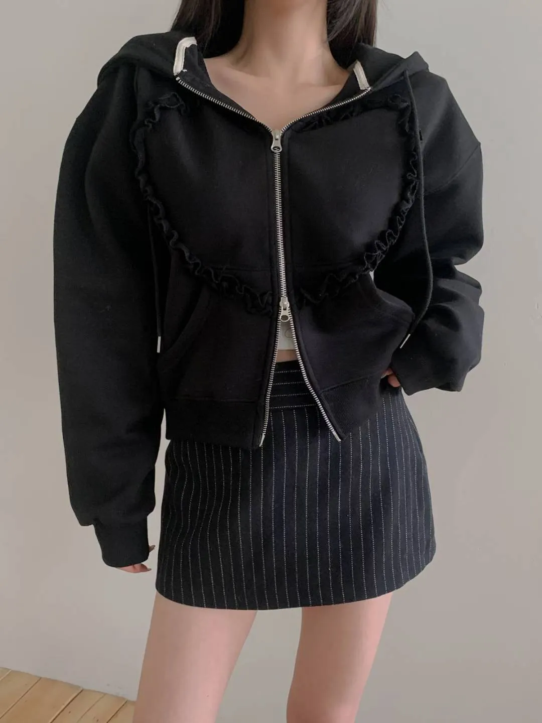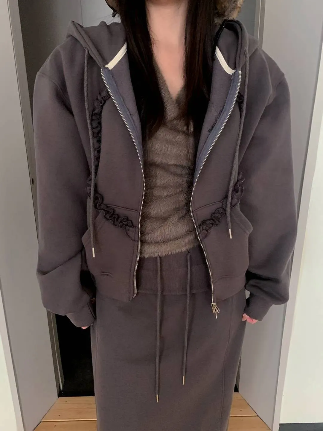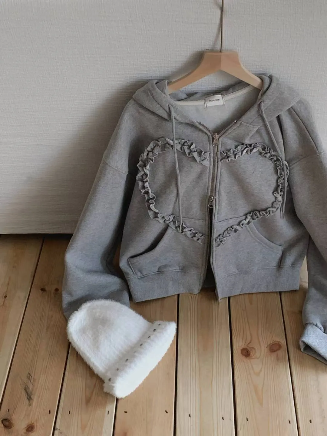 25LA13 奶油擠花愛心雙拉鏈加絨連帽外套 3色
