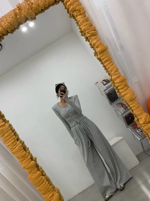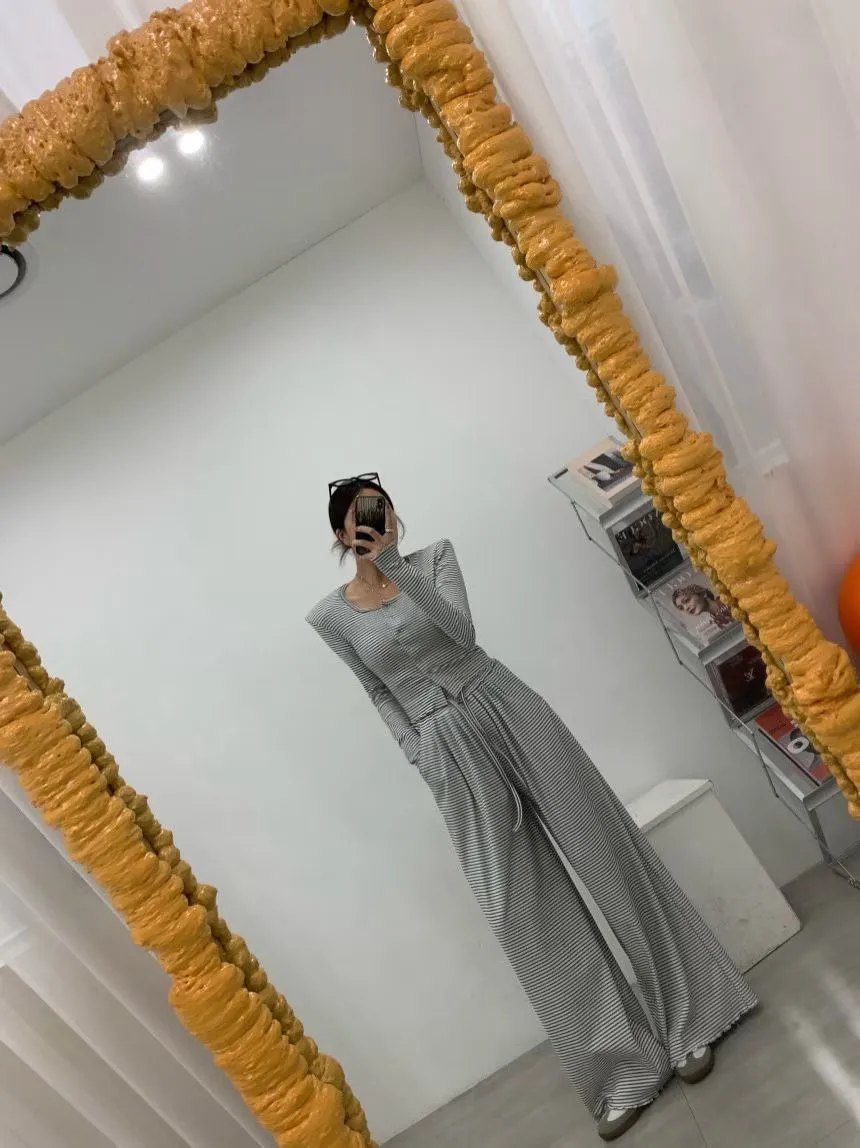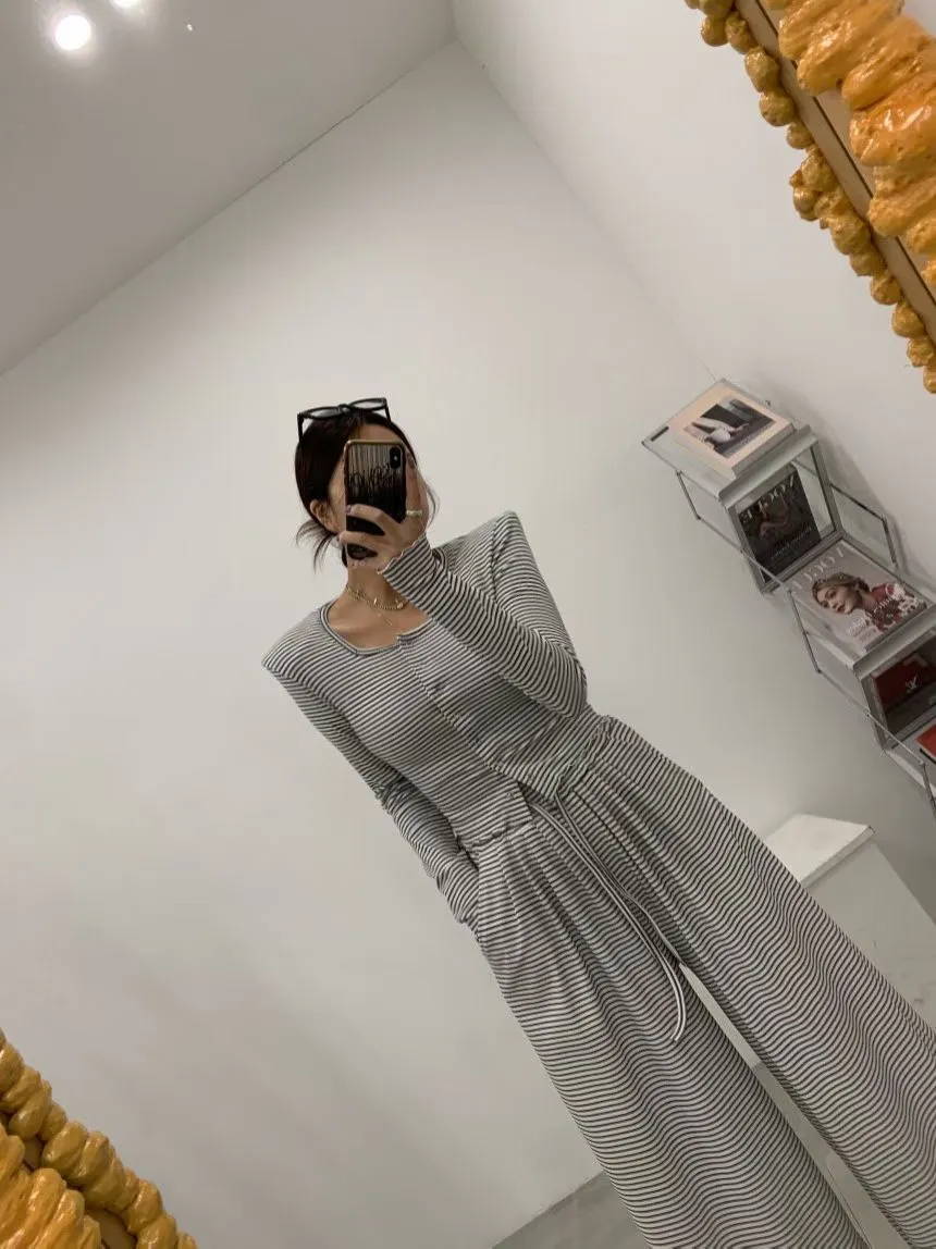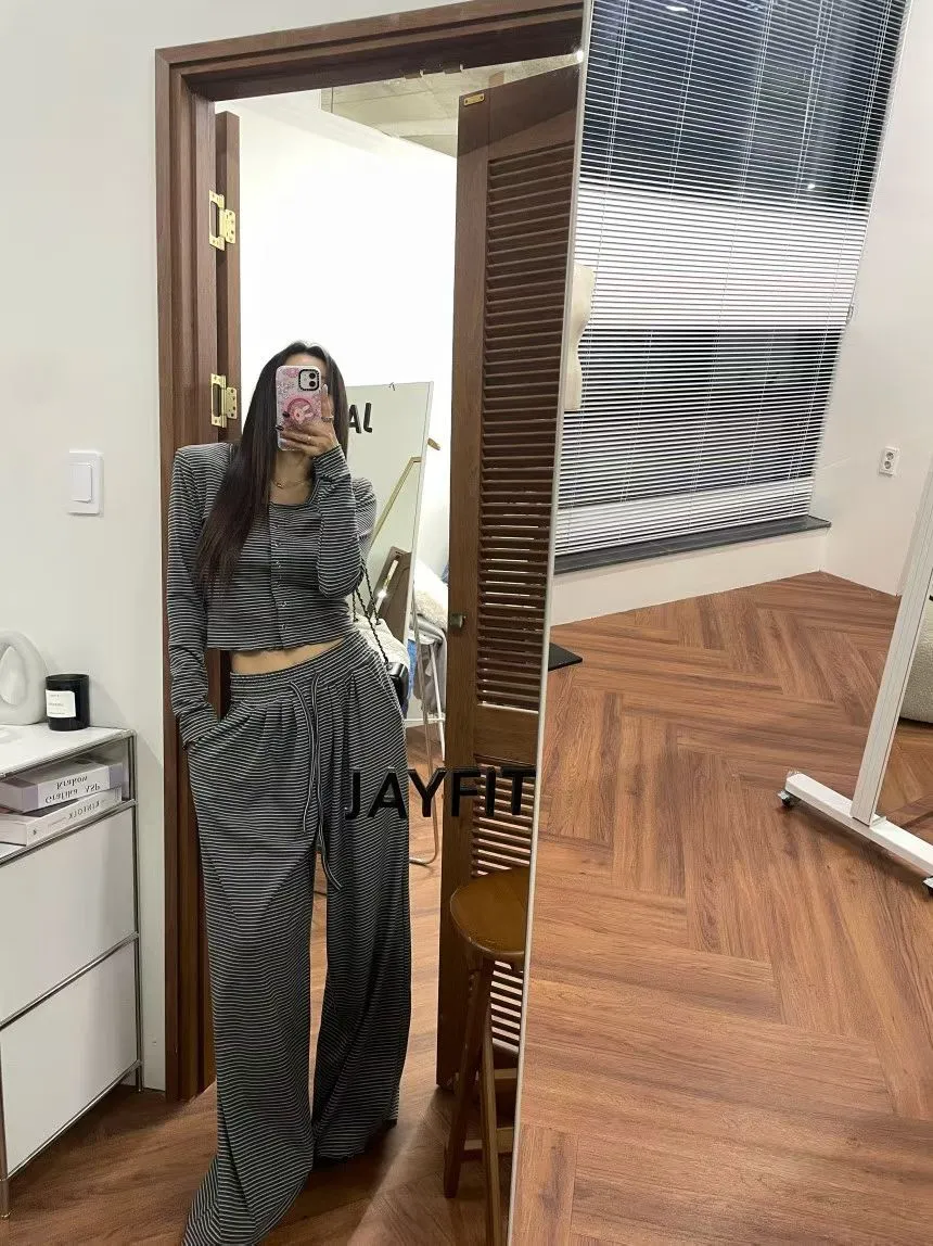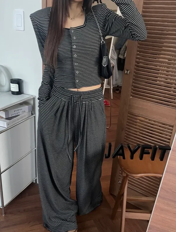 25LB19 蜜桃絨條紋木耳滾邊長褲 3色