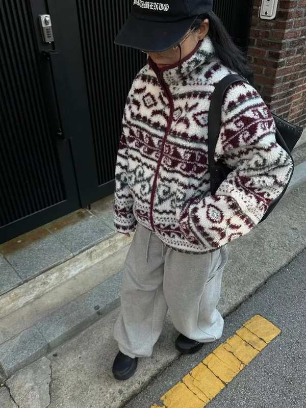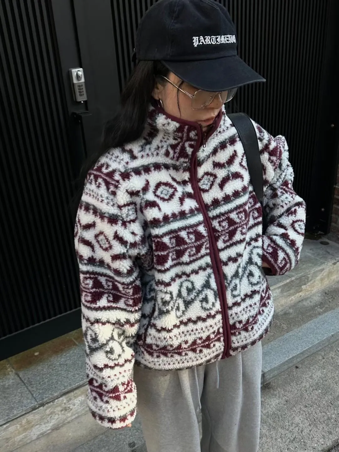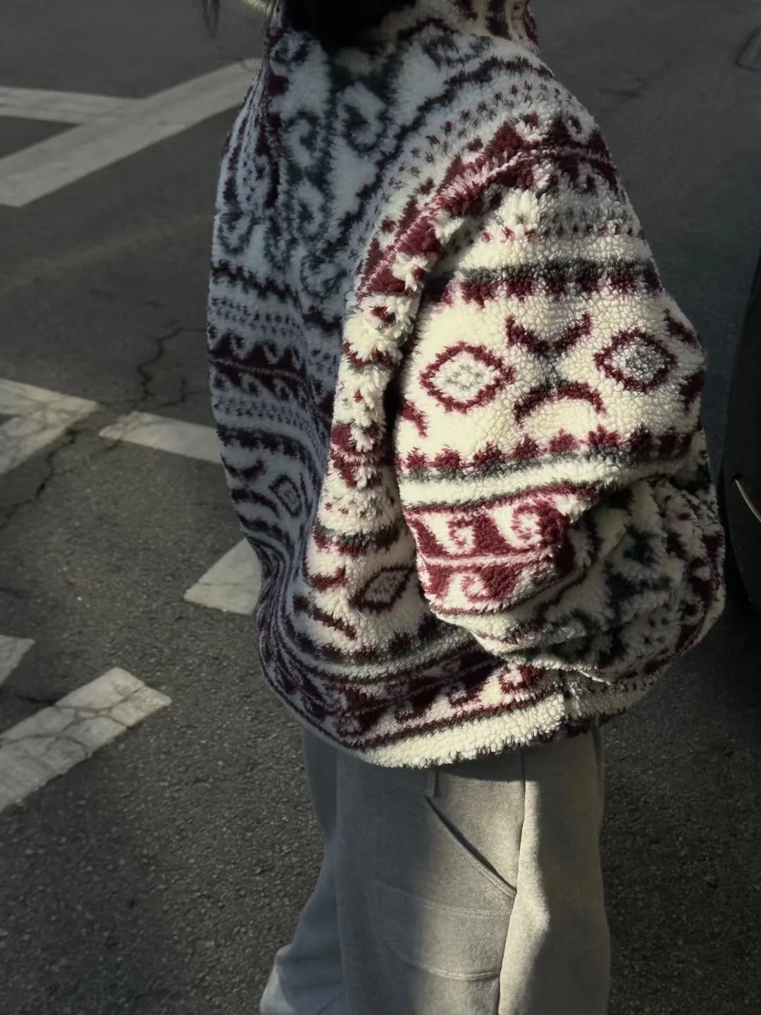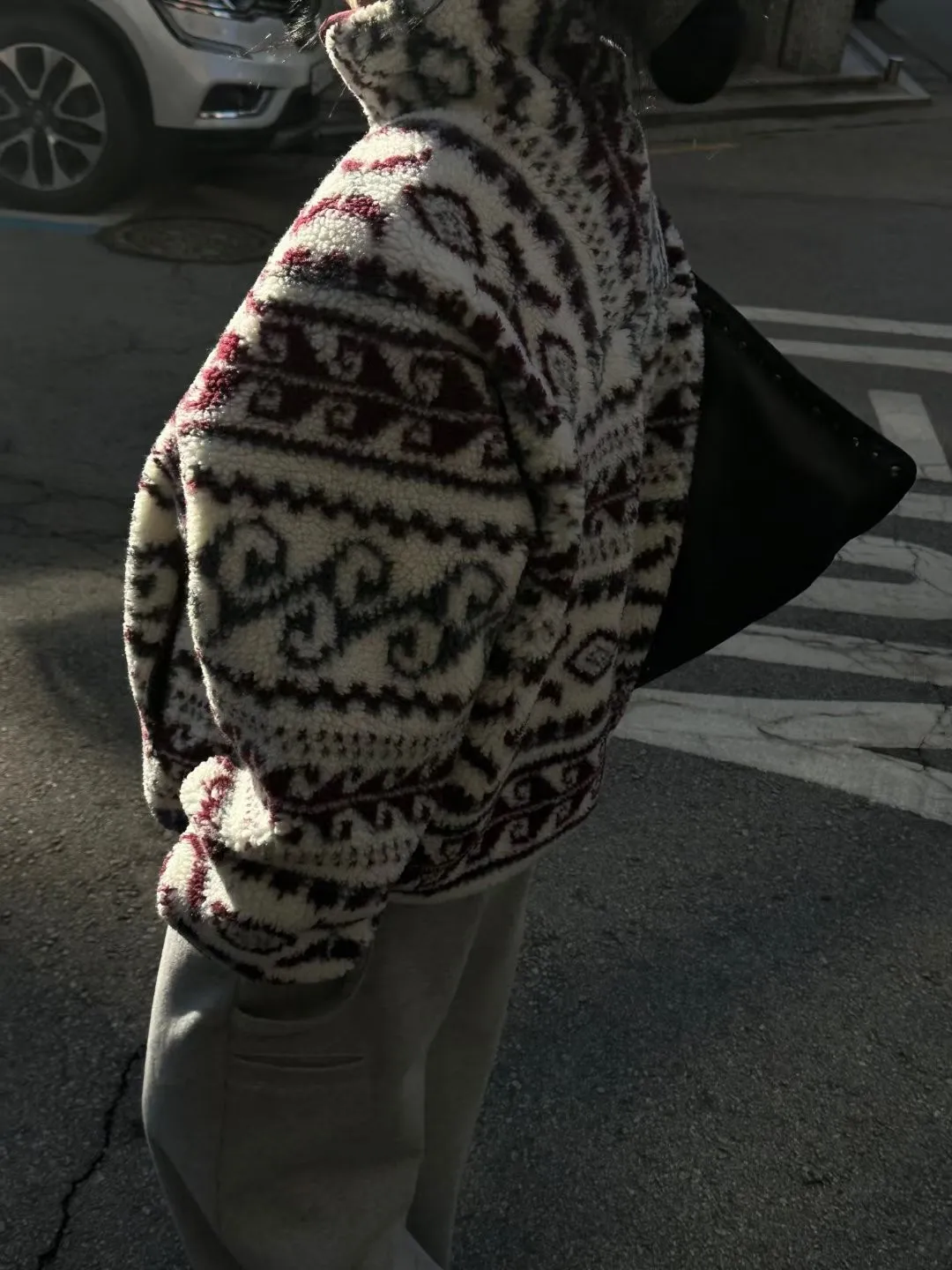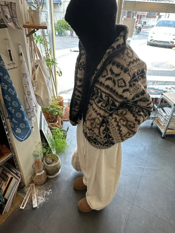 25LD04 民族圖騰搖粒絨立領下縮腰繩外套 2色