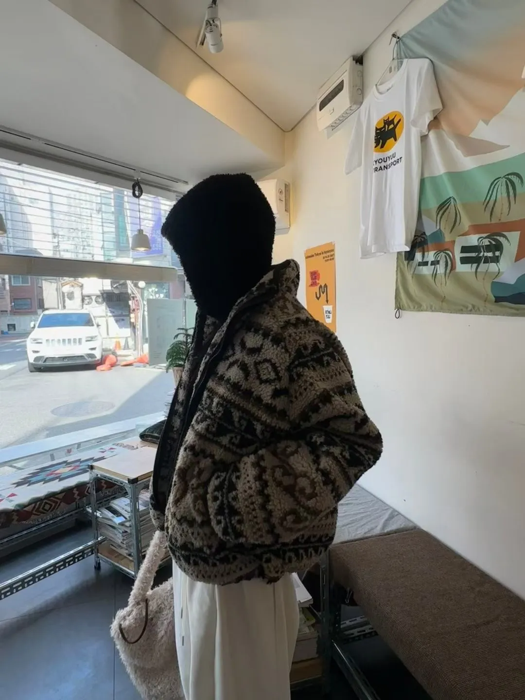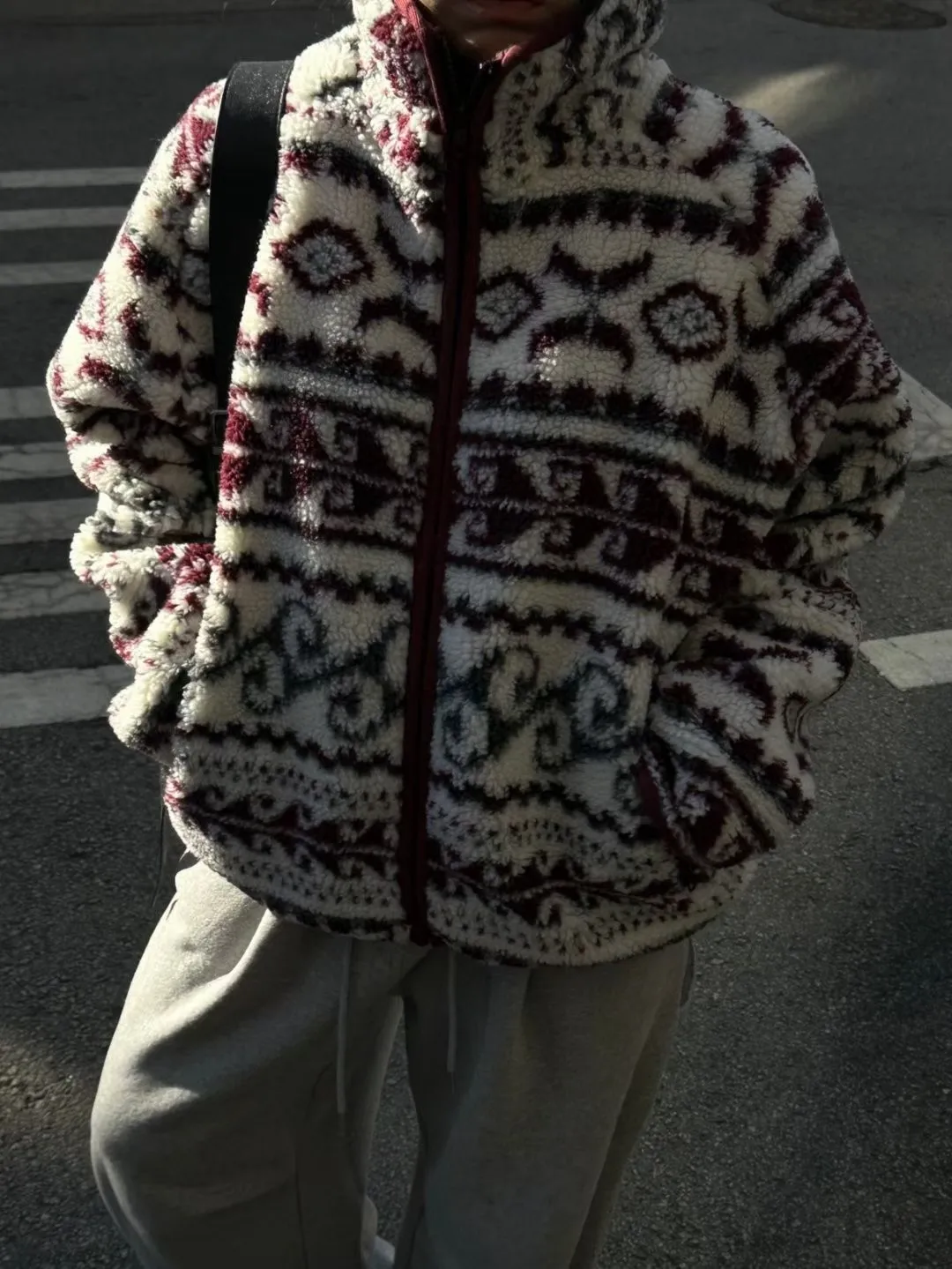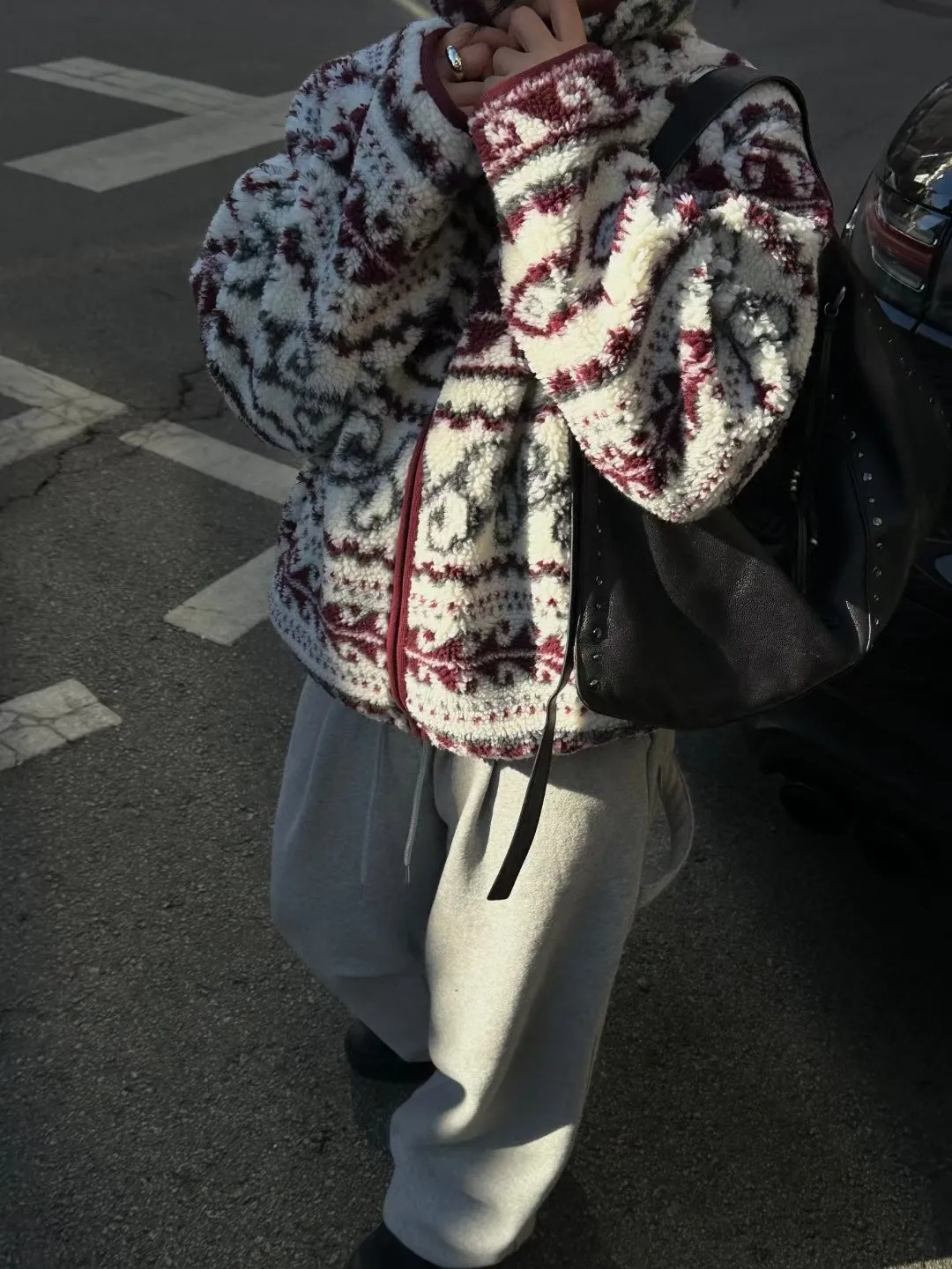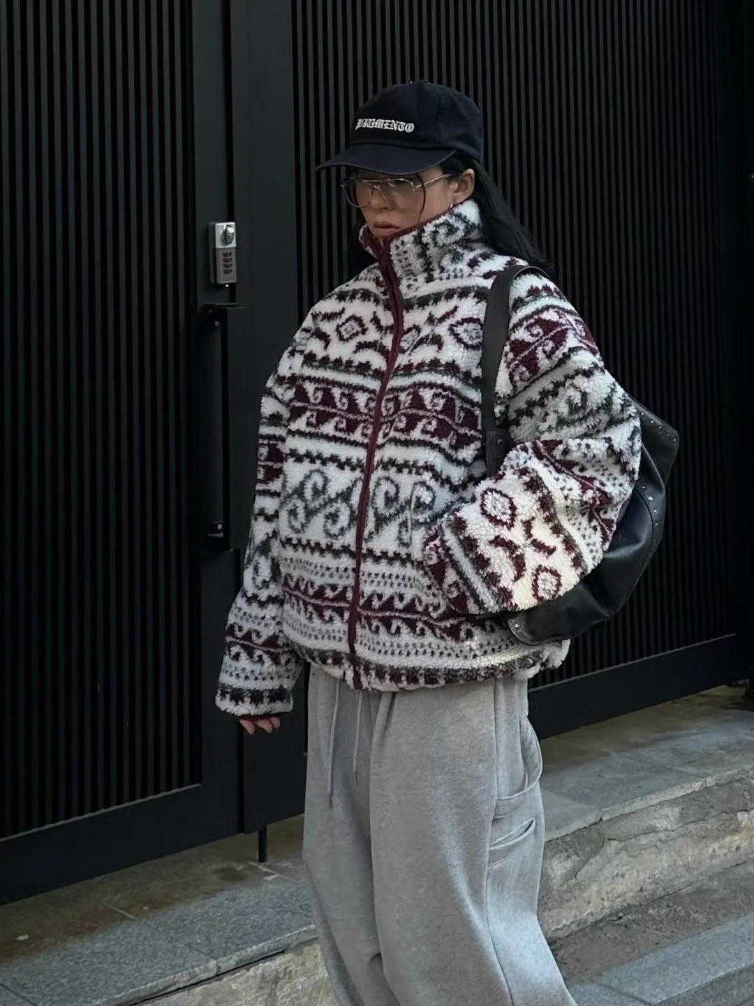 25LD04 民族圖騰搖粒絨立領下縮腰繩外套 2色