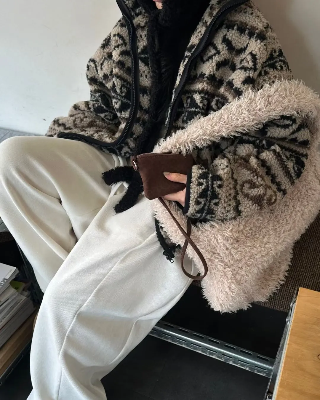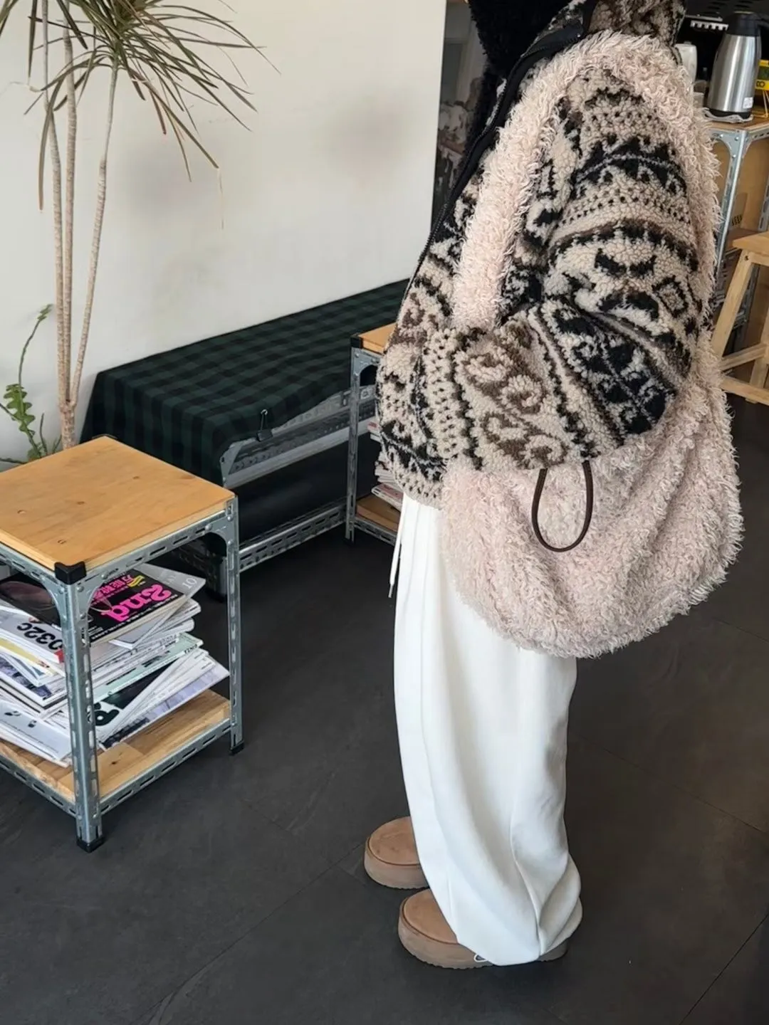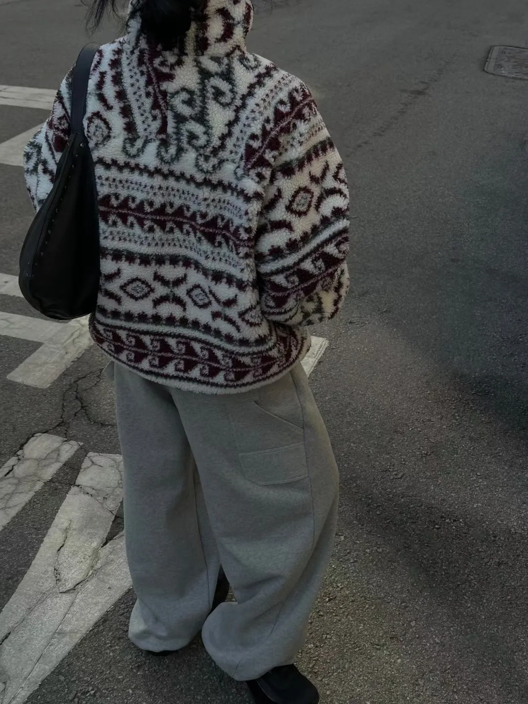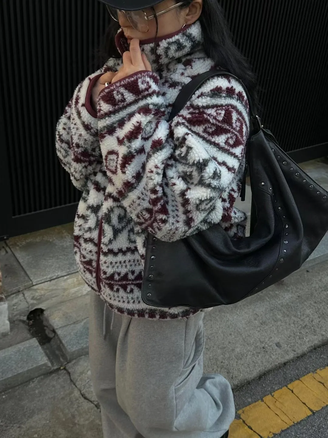 25LD04 民族圖騰搖粒絨立領下縮腰繩外套 2色