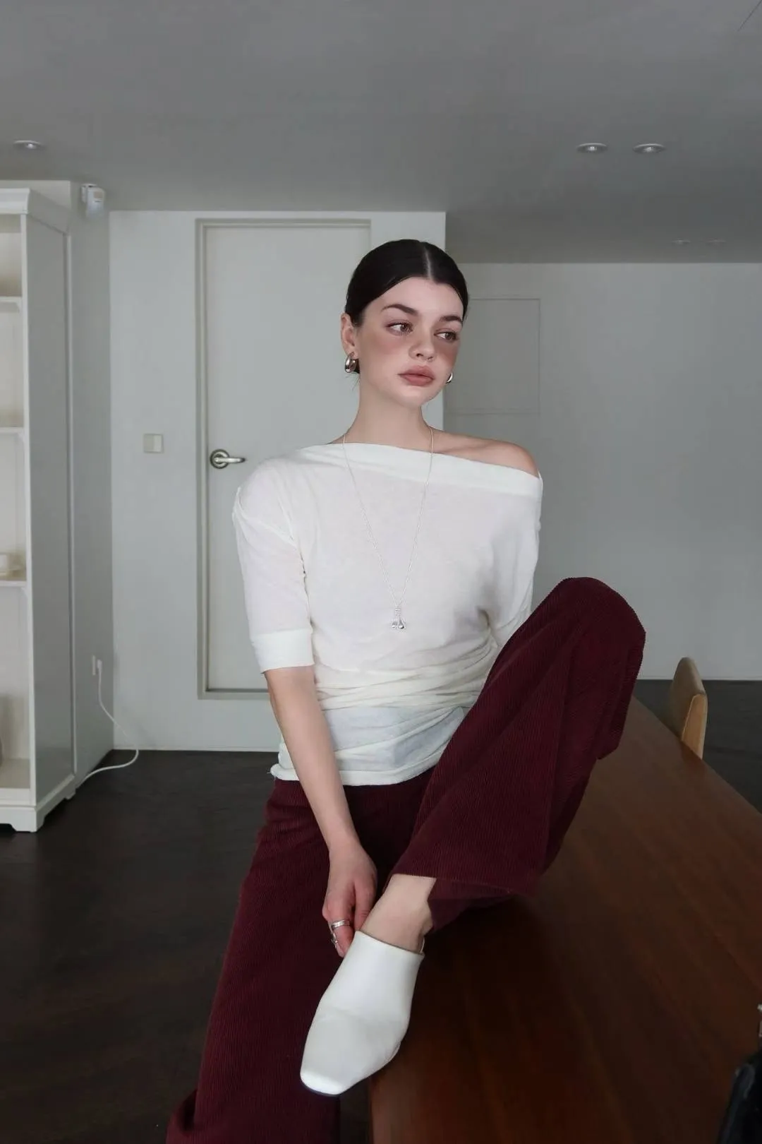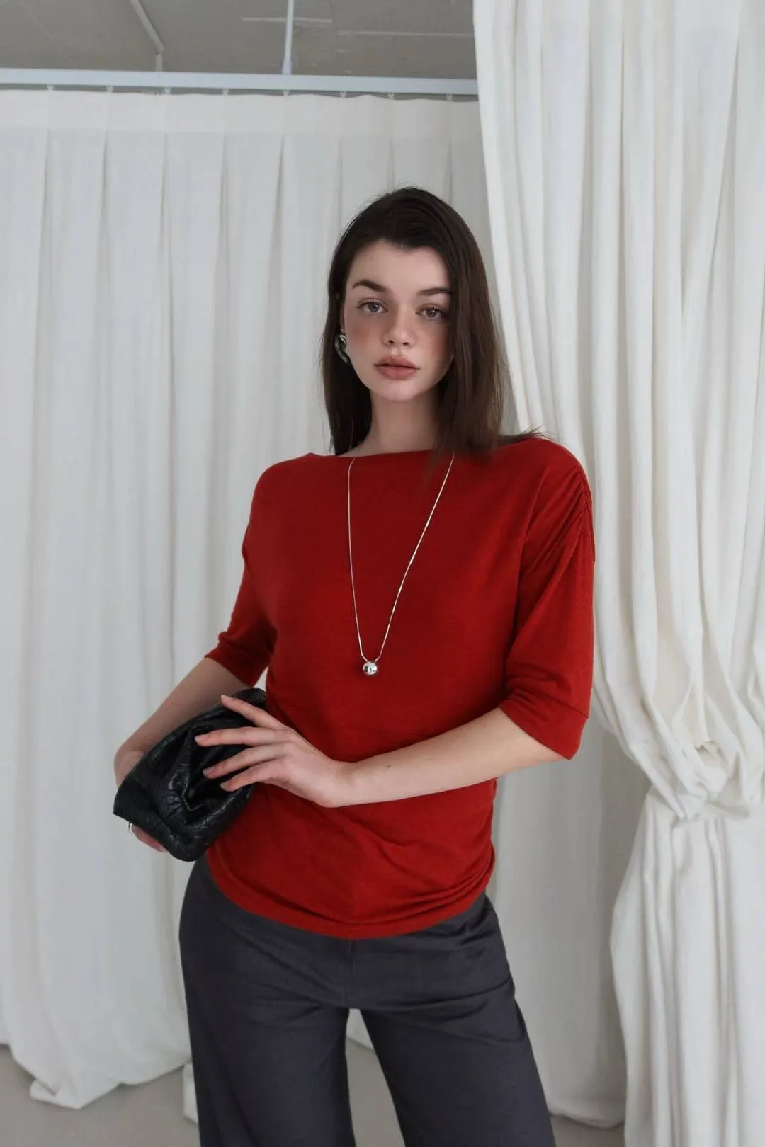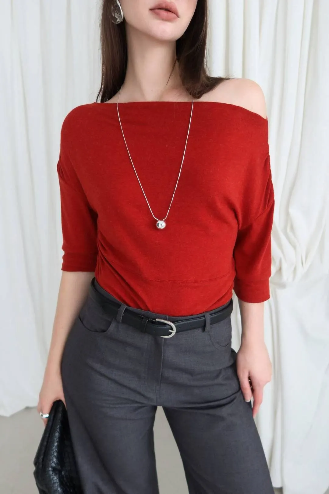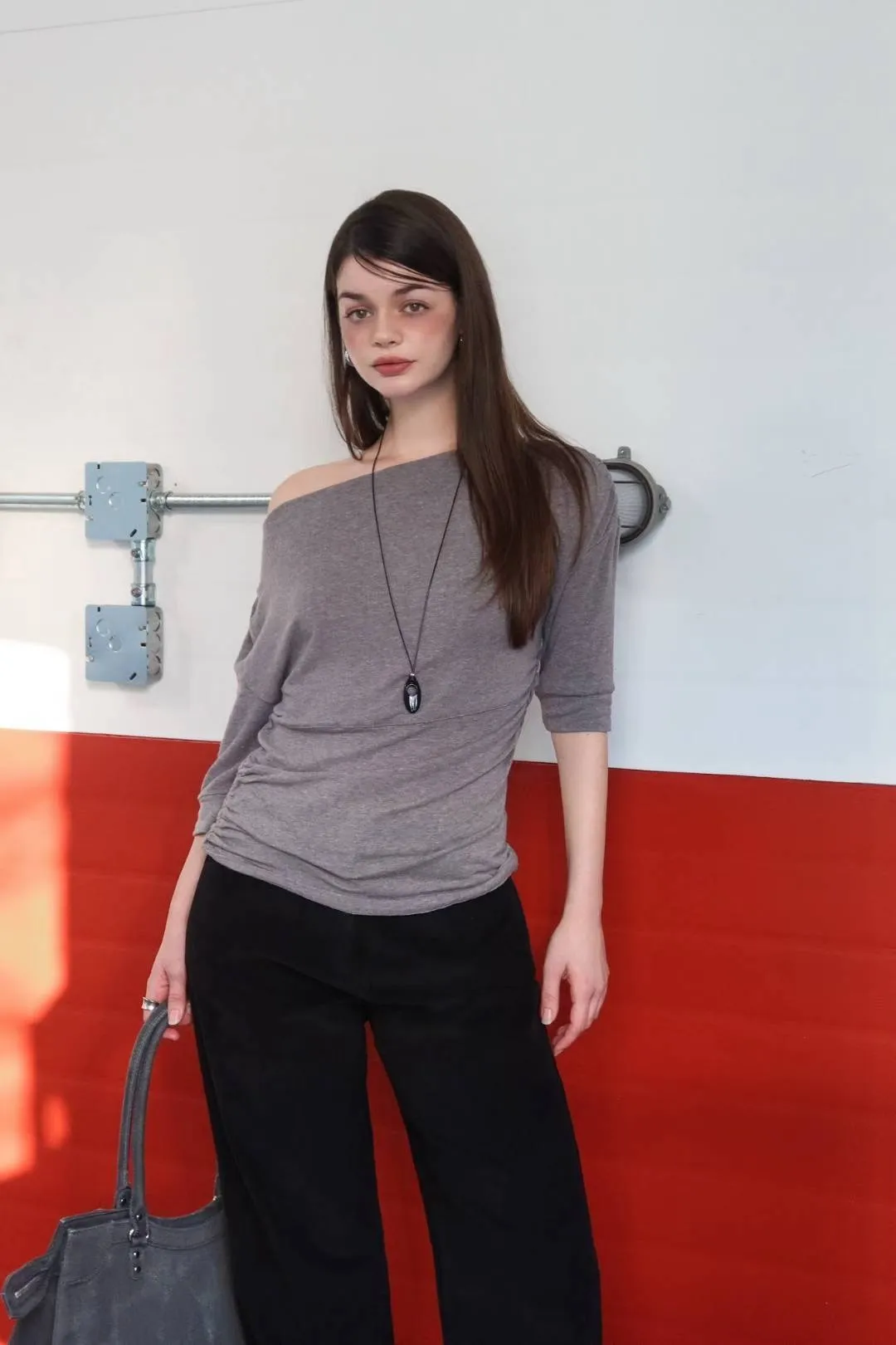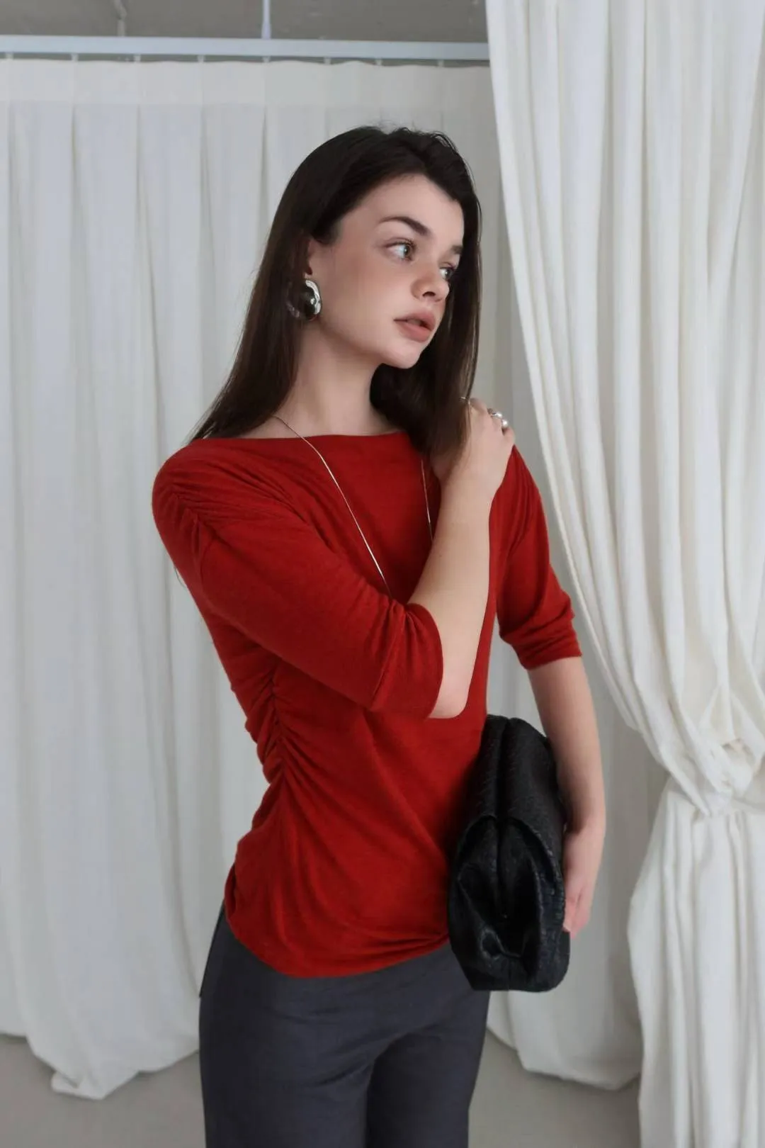 25LF09 羊絨五分袖不對稱抓褶船領T 4色