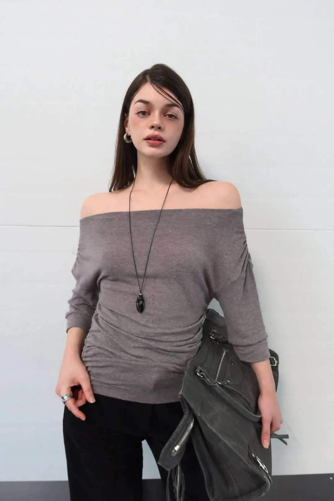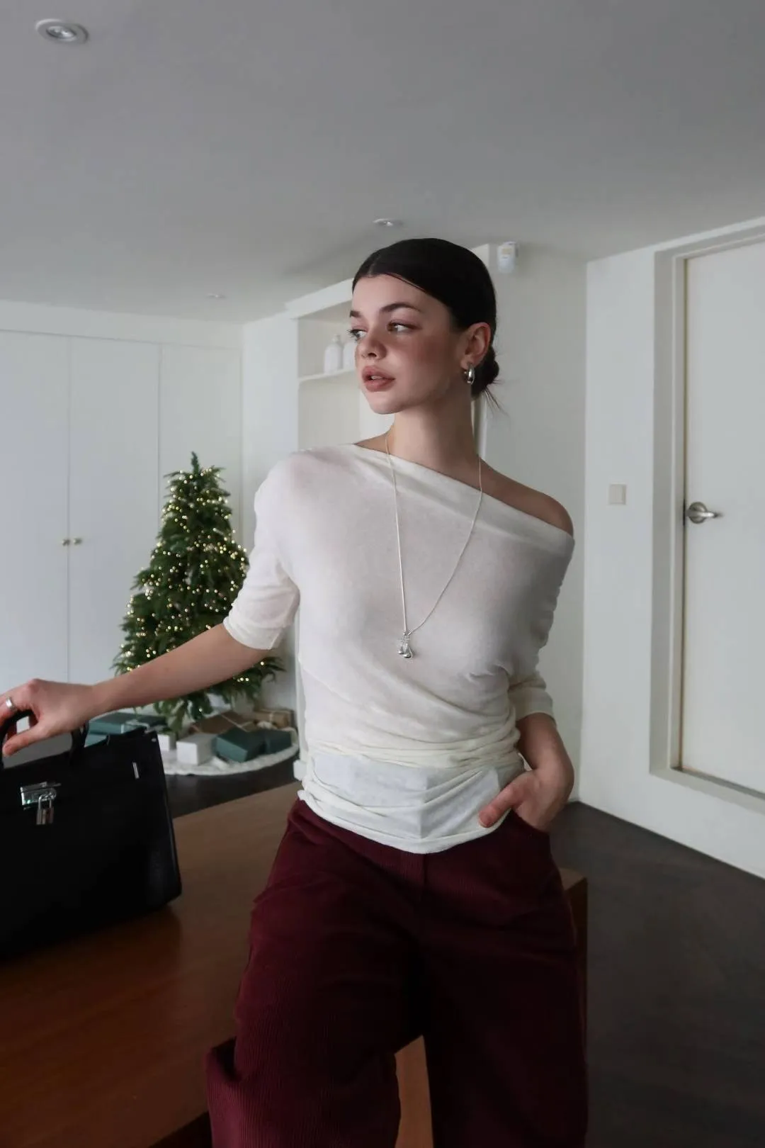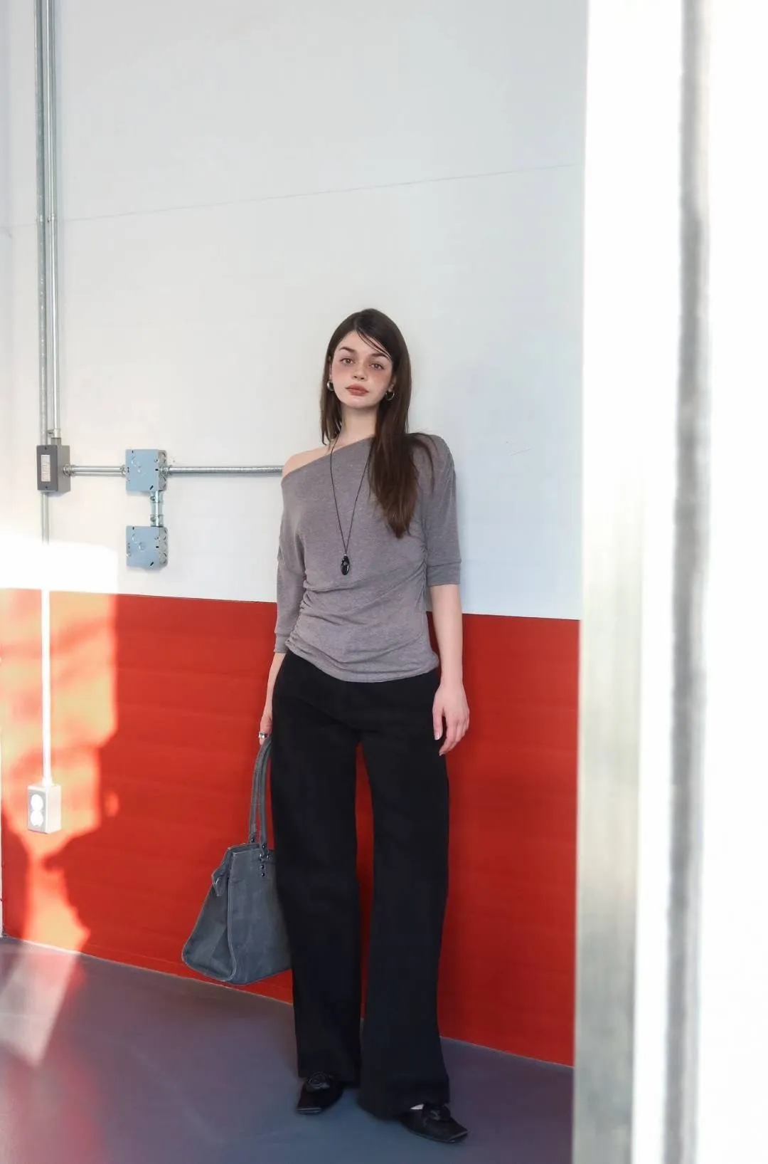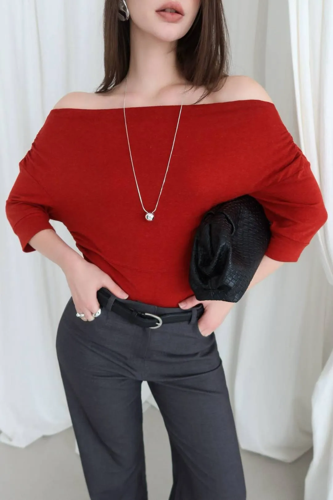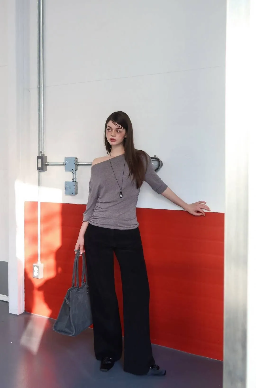 25LF09 羊絨五分袖不對稱抓褶船領T 4色