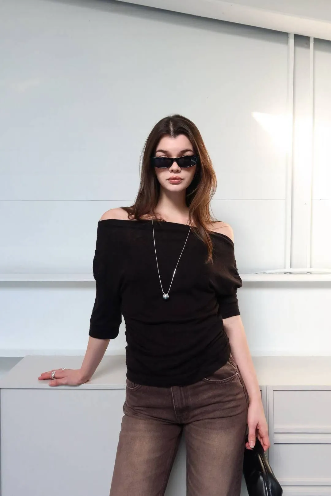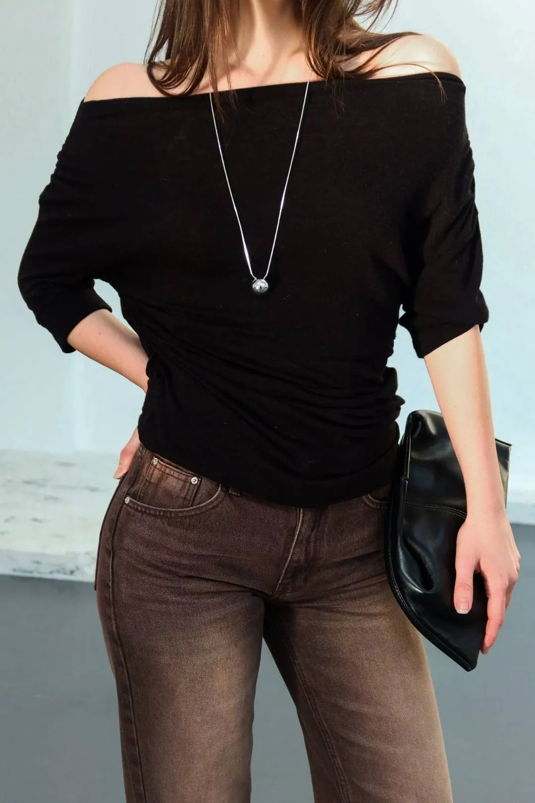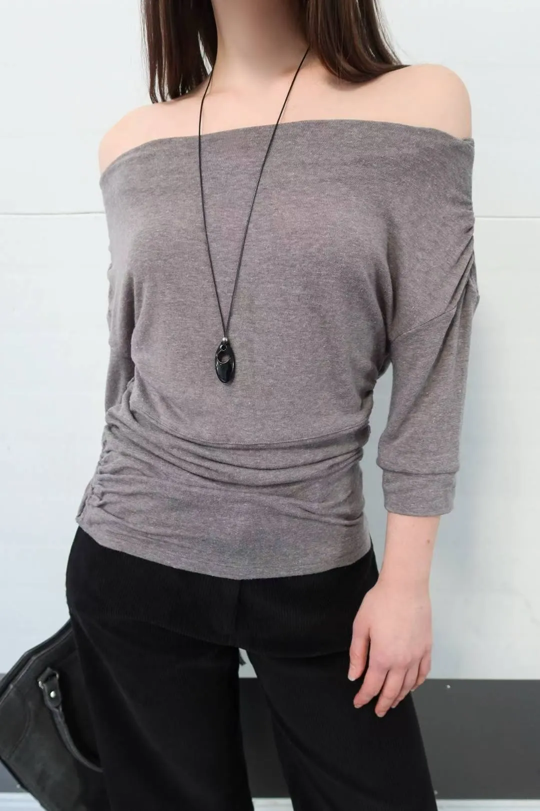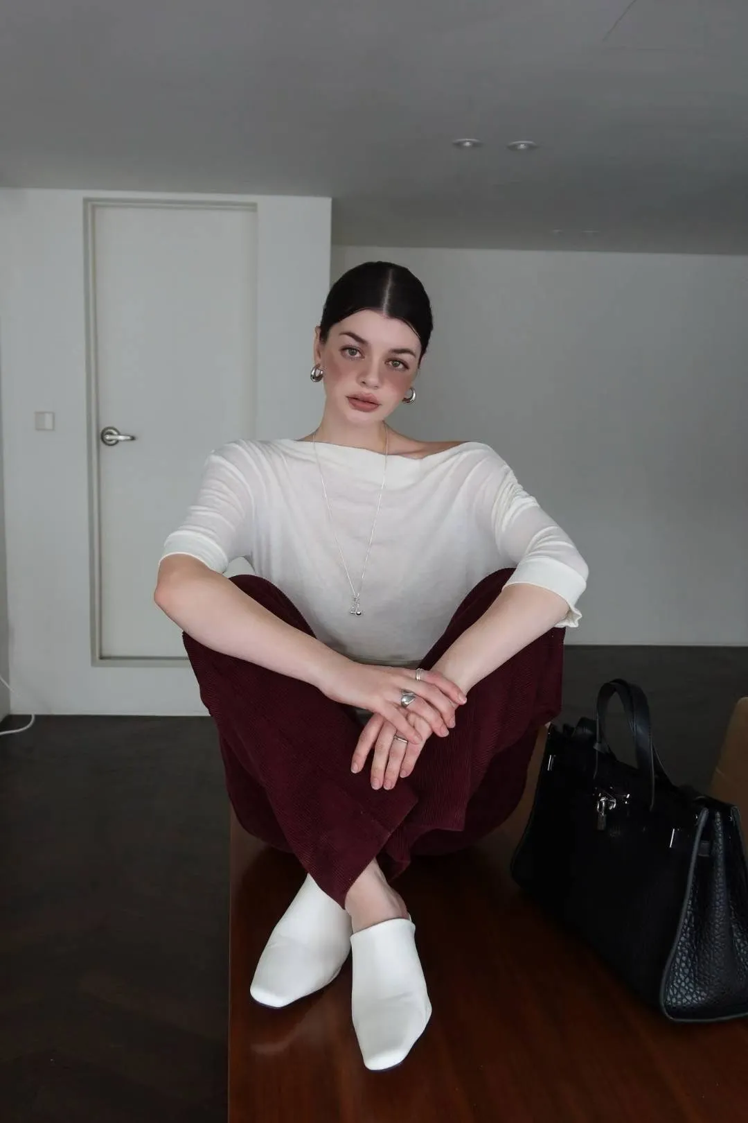 25LF09 羊絨五分袖不對稱抓褶船領T 4色