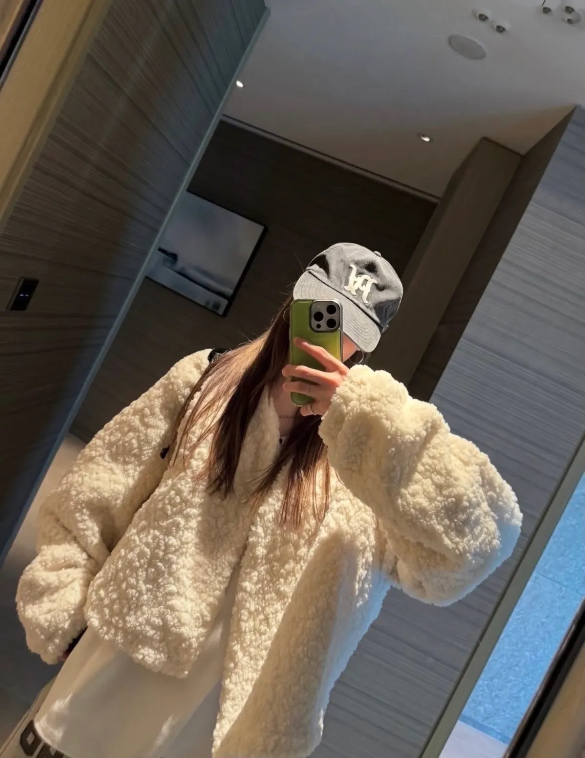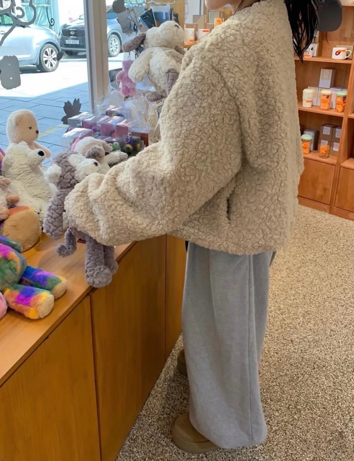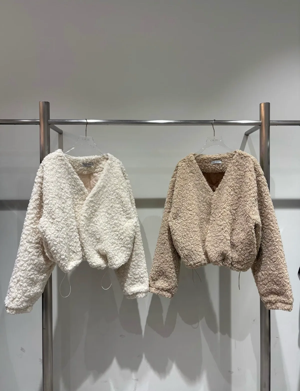 25LG11 QQ毛毛無領開襟菱紋夾棉下縮繩外套 2色