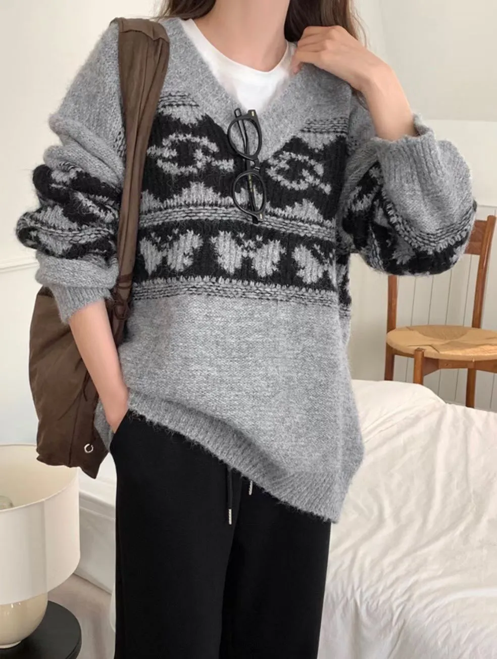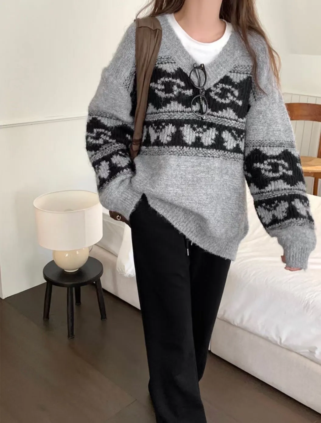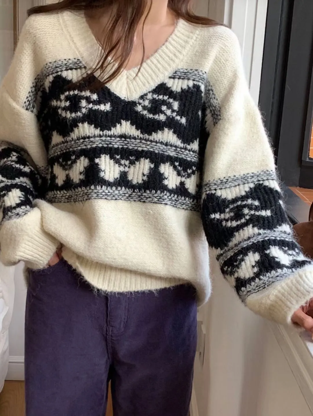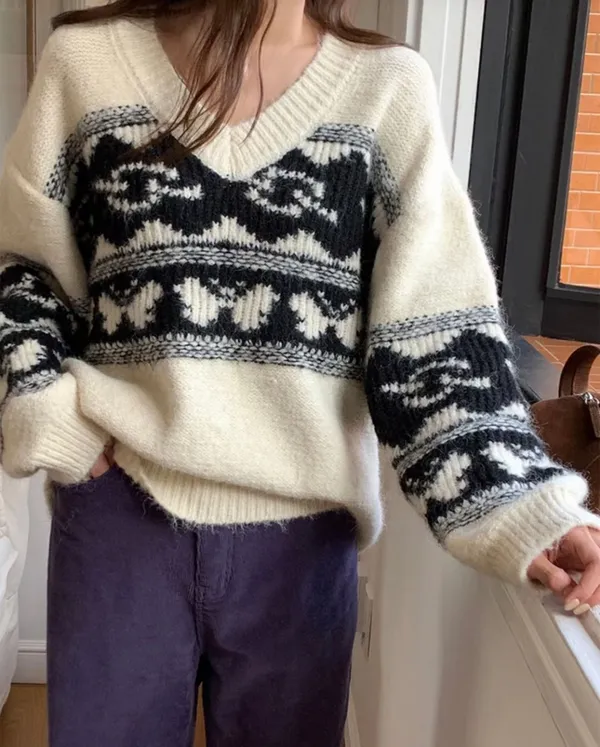 25LS27 V領羊毛圖騰花紋毛衣 2色