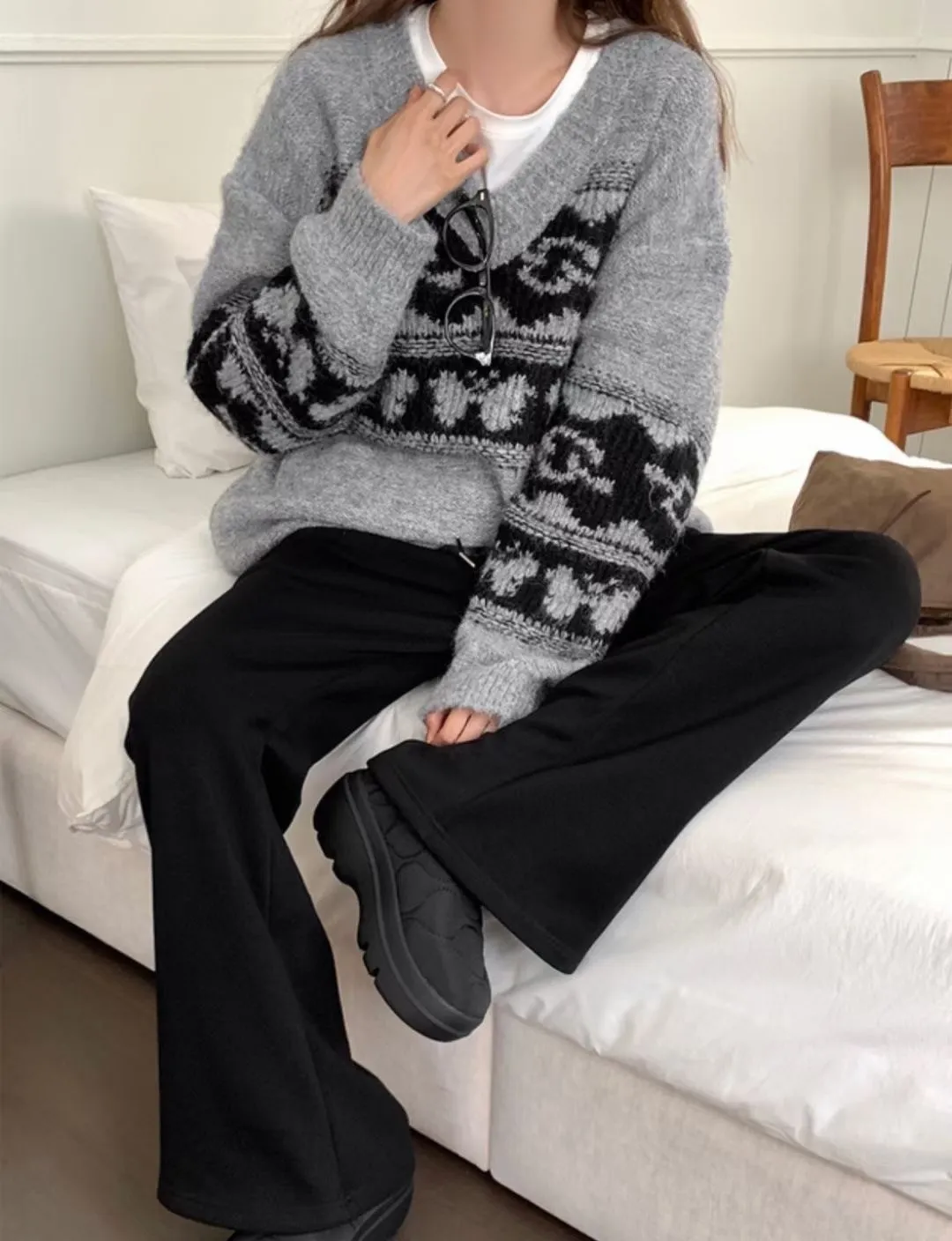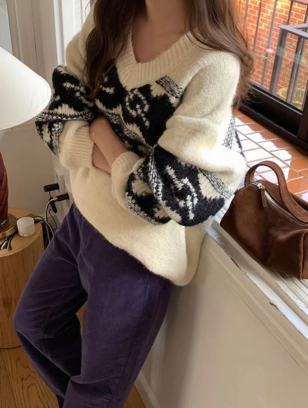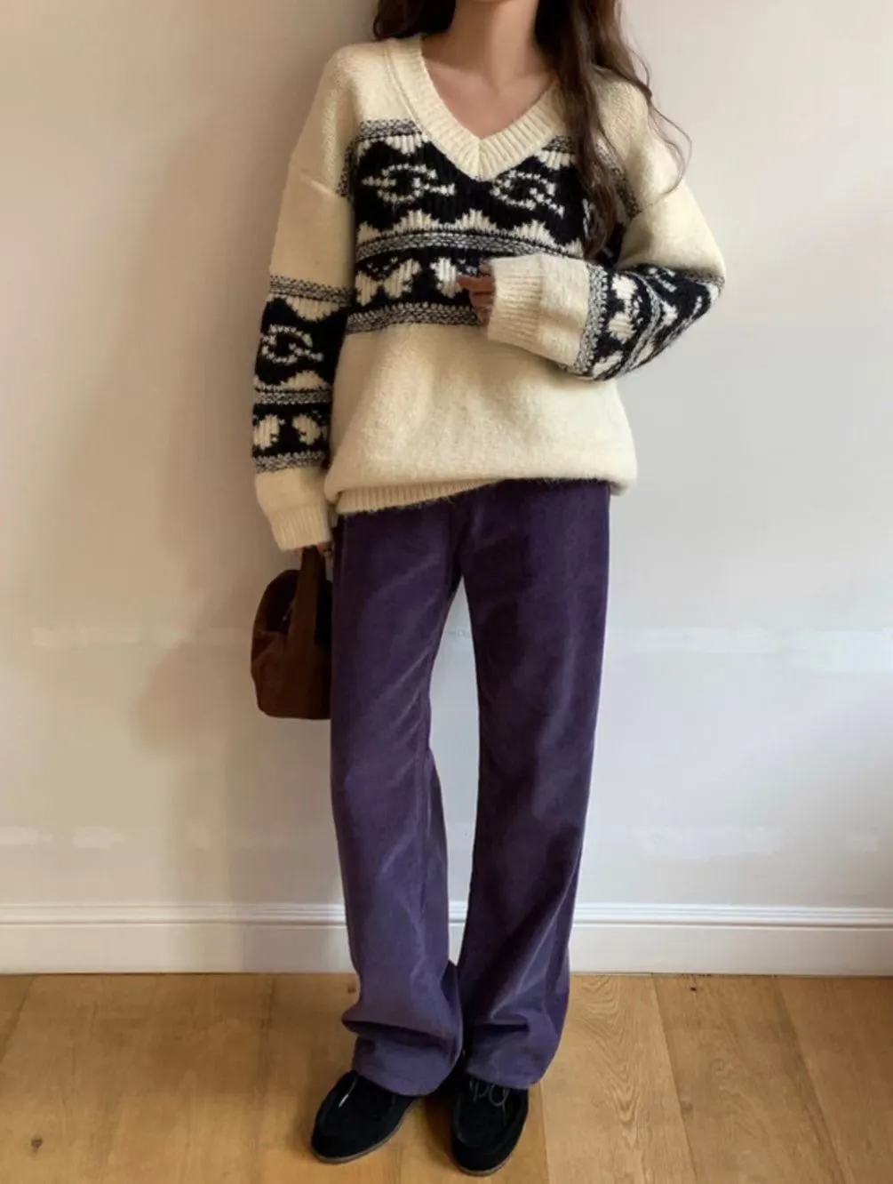 25LS27 V領羊毛圖騰花紋毛衣 2色