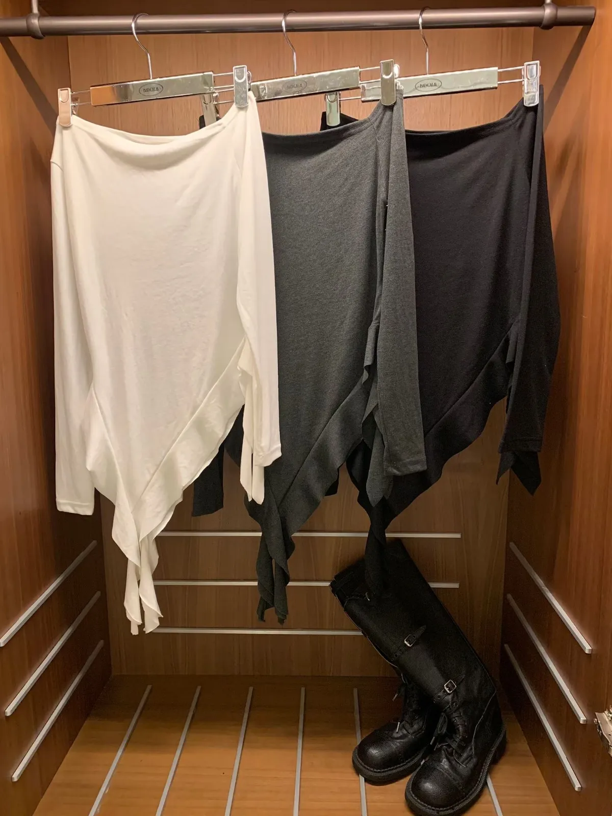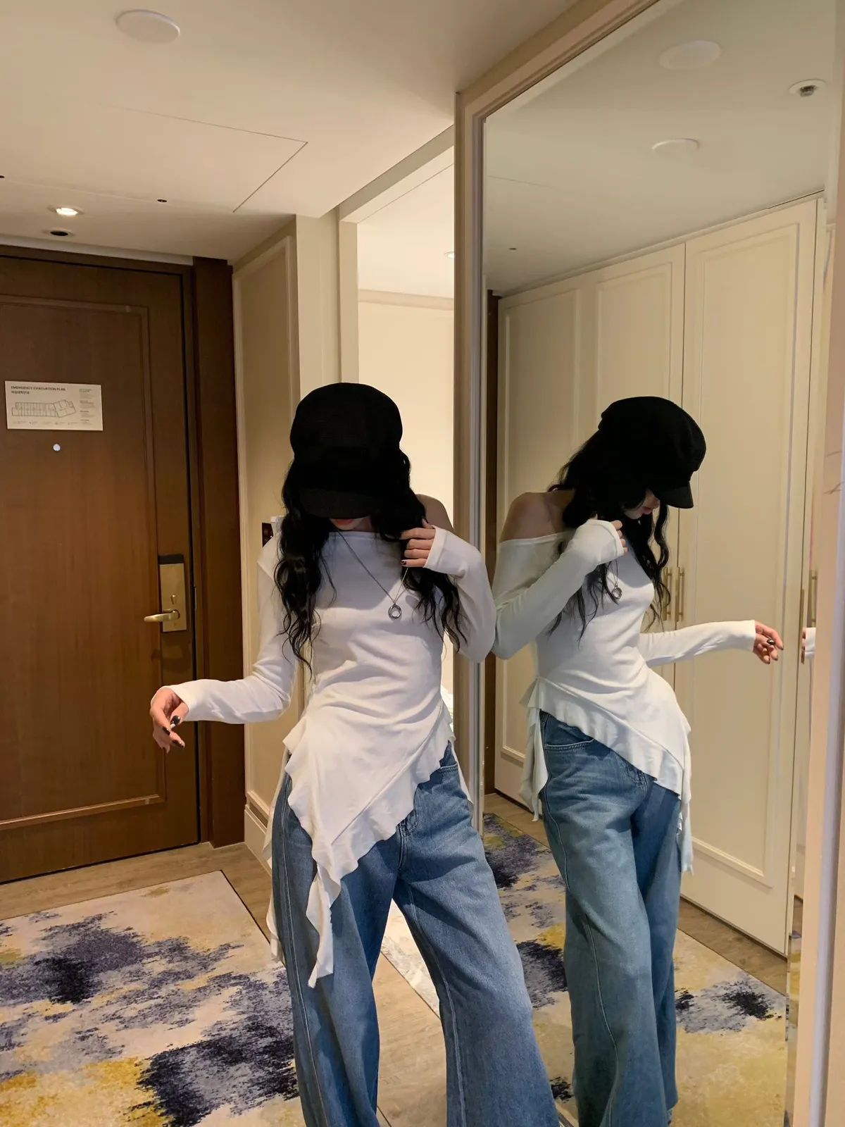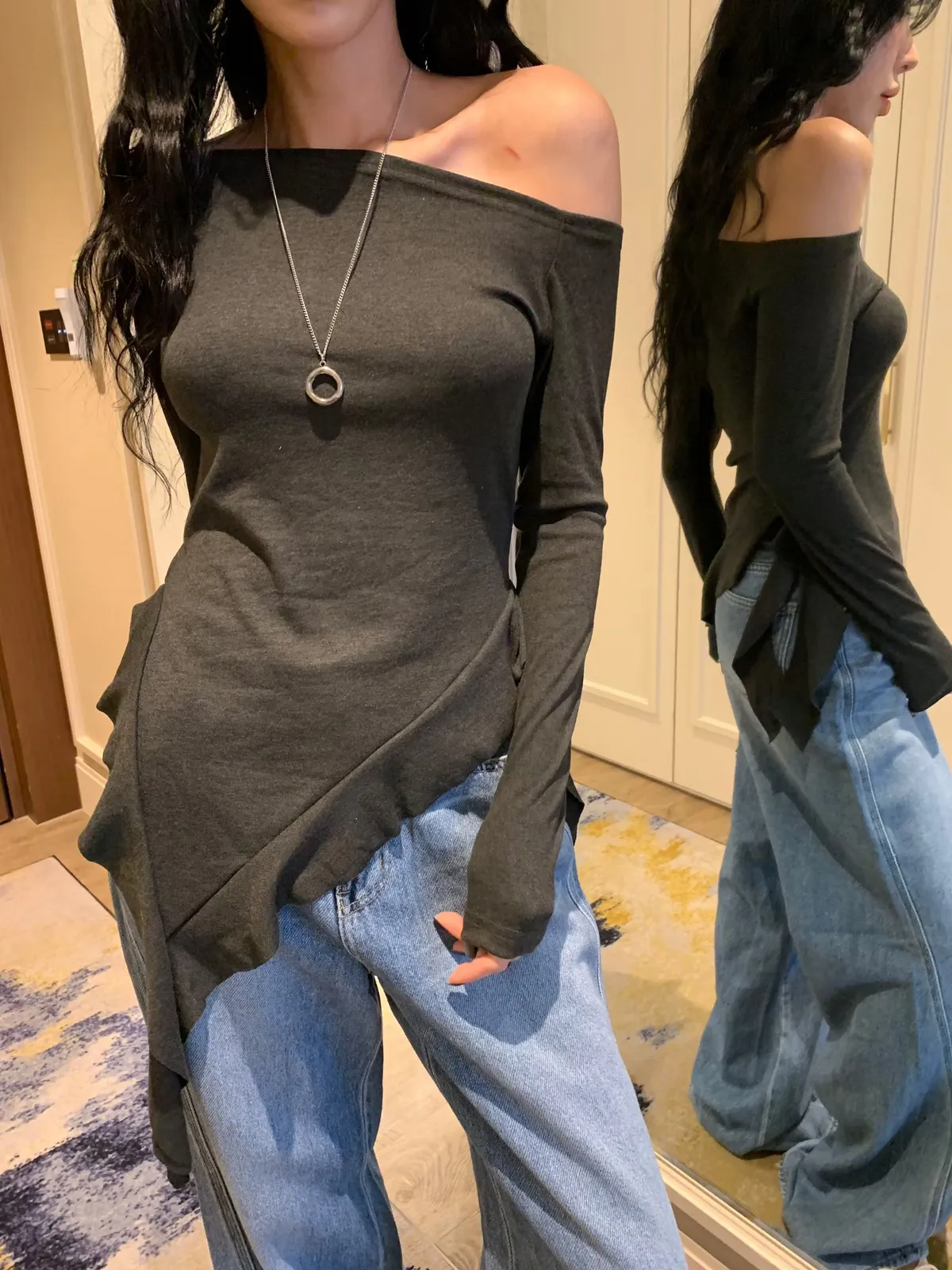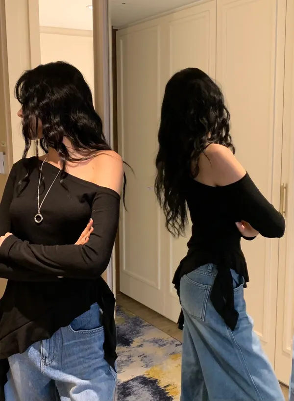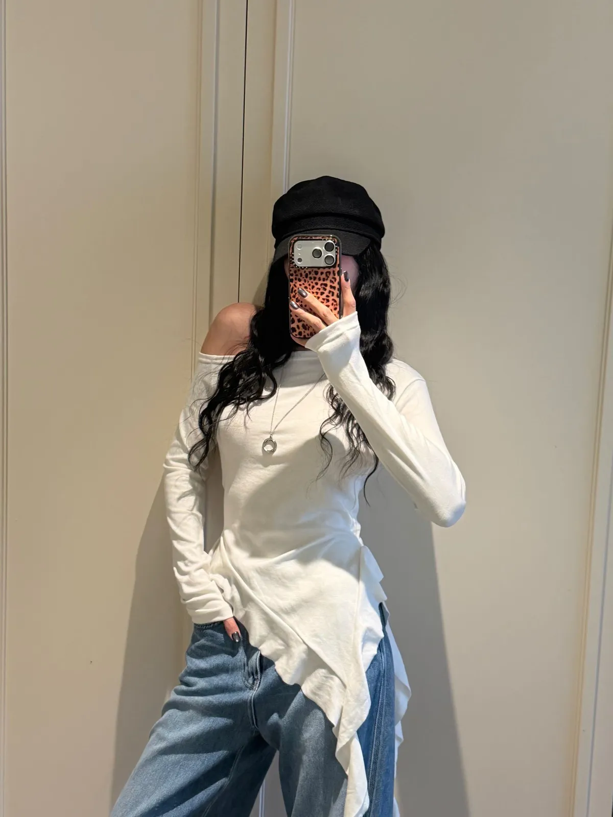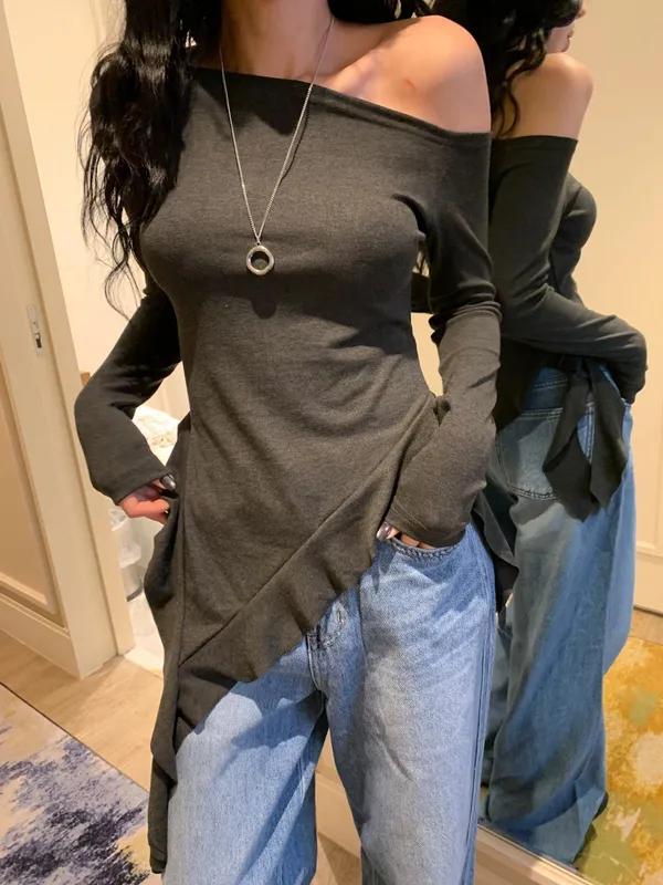 26BC07 斜肩荷葉下擺彈力造型長T 3色