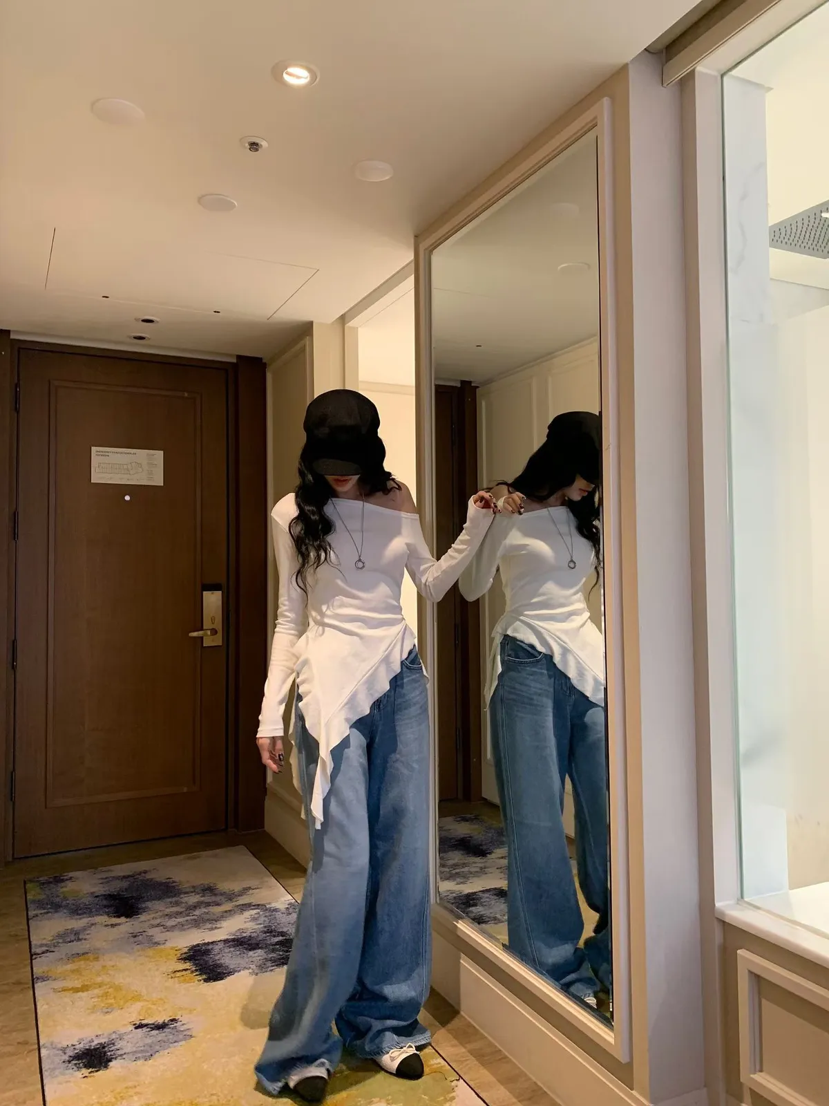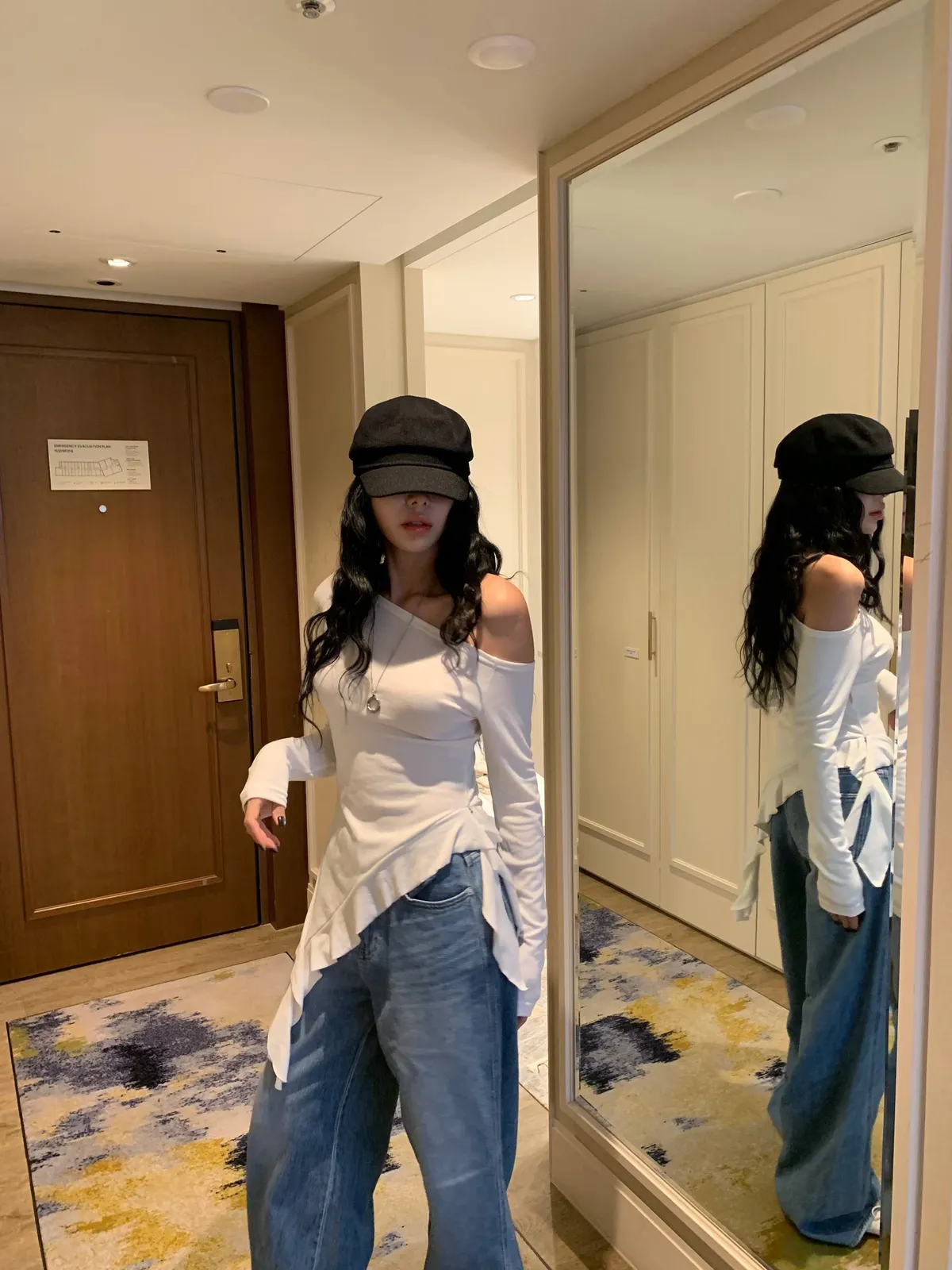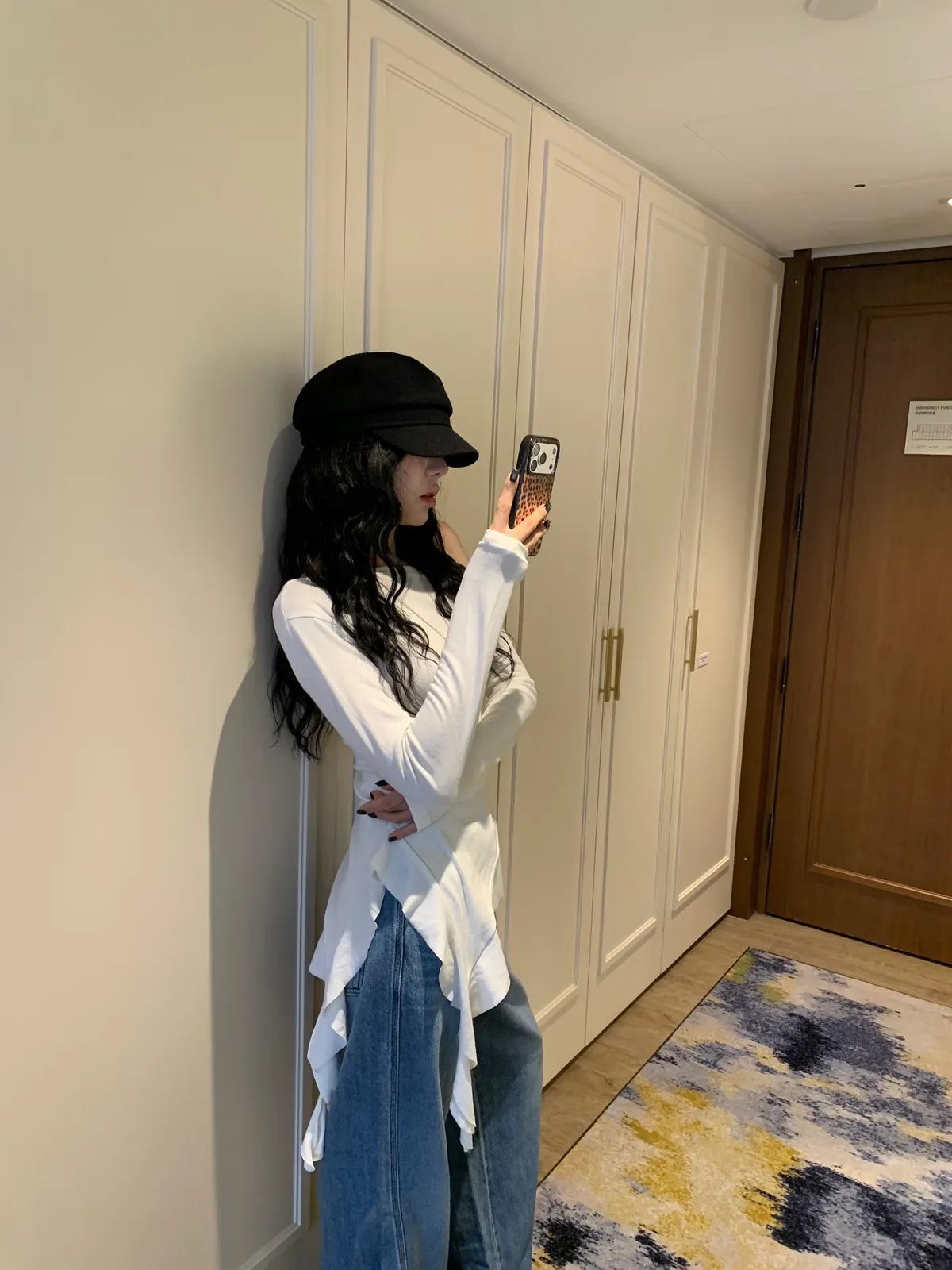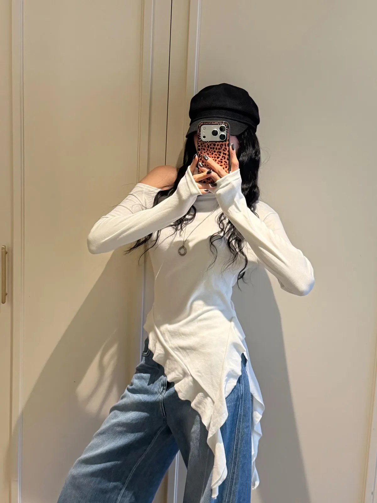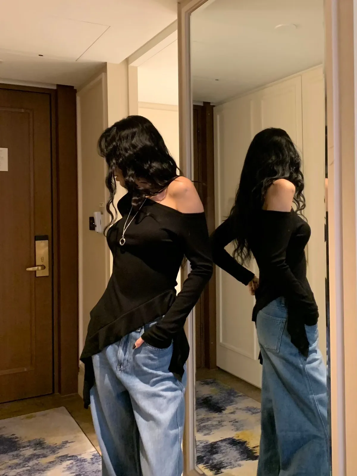 26BC07 斜肩荷葉下擺彈力造型長T 3色