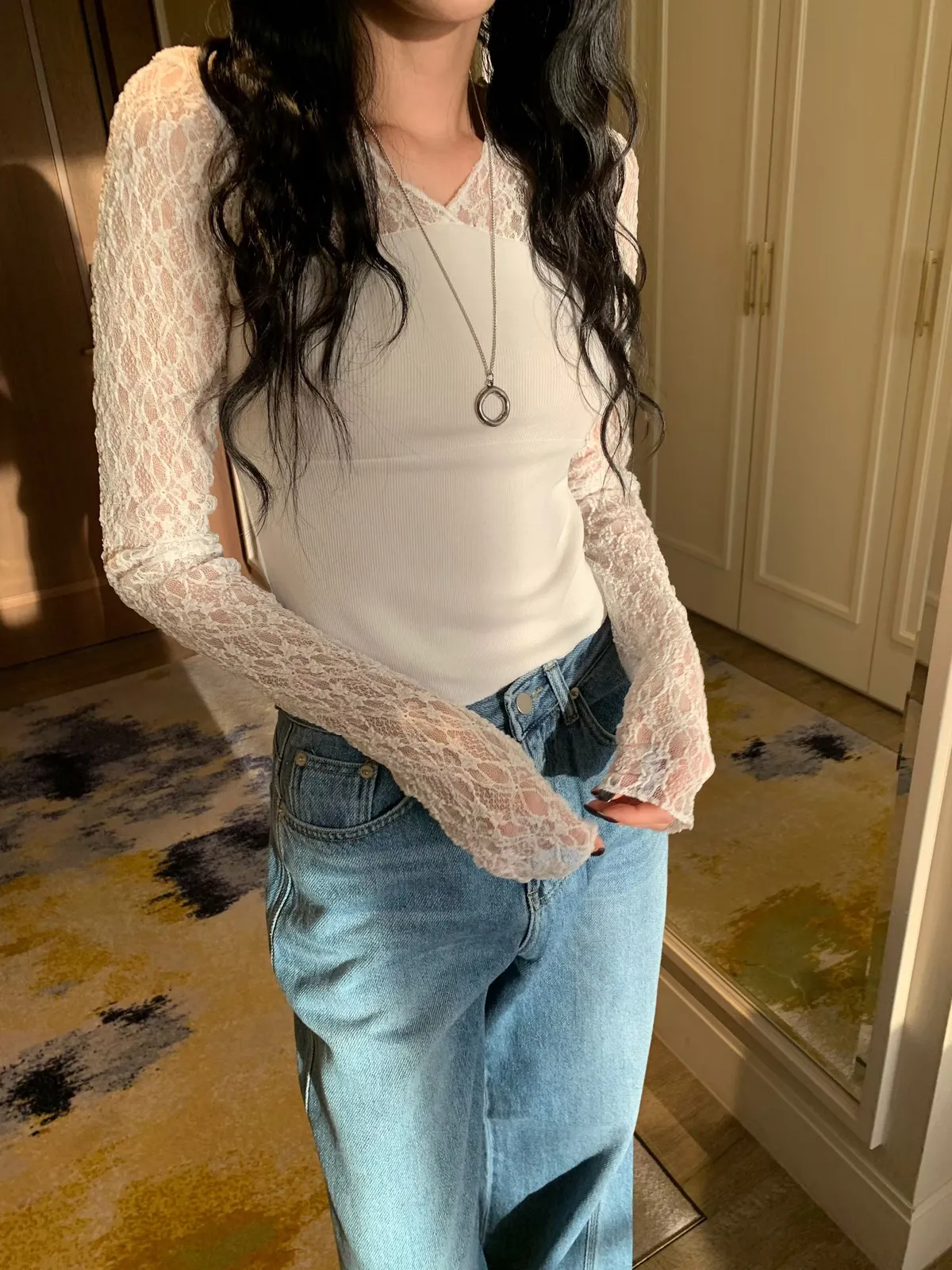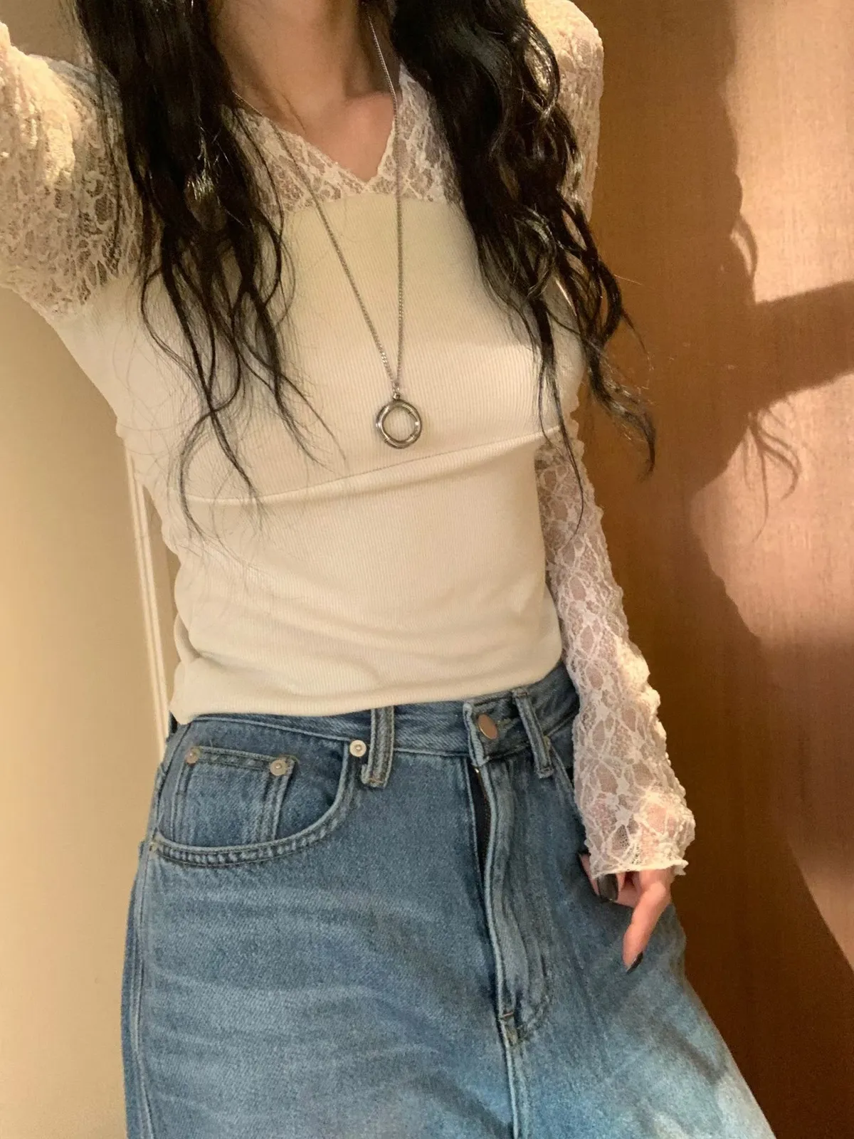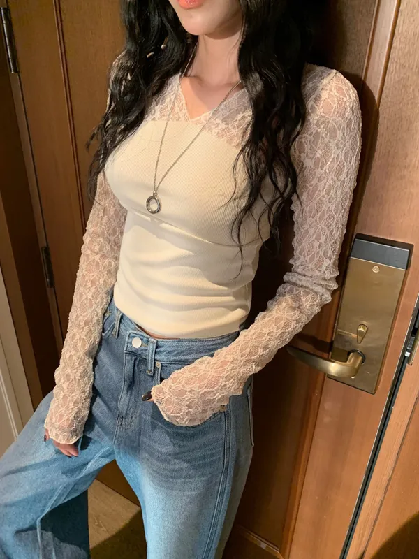 26BC09 透透蕾絲拼接螺紋棉長T 3色