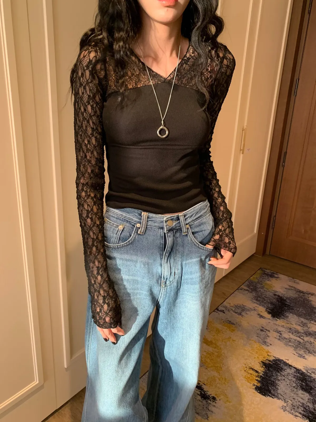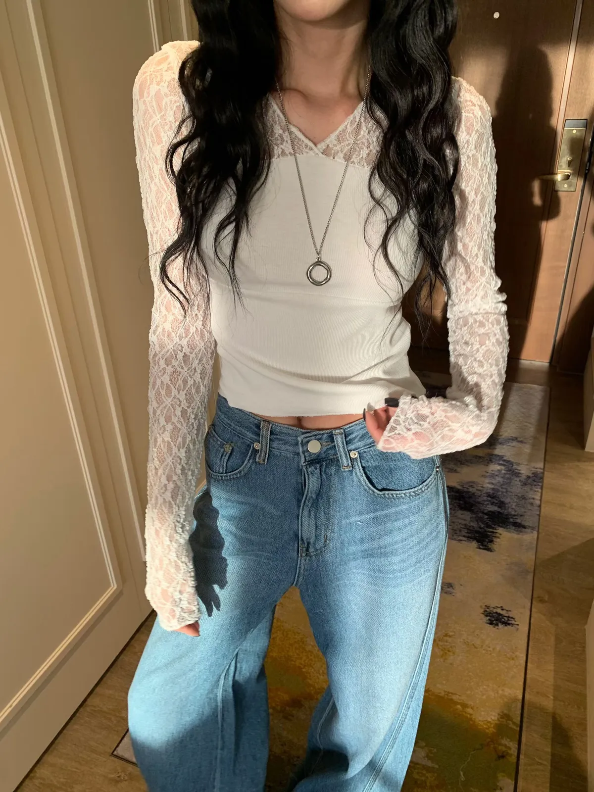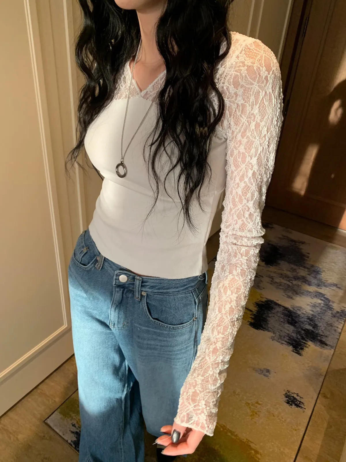 26BC09 透透蕾絲拼接螺紋棉長T 3色