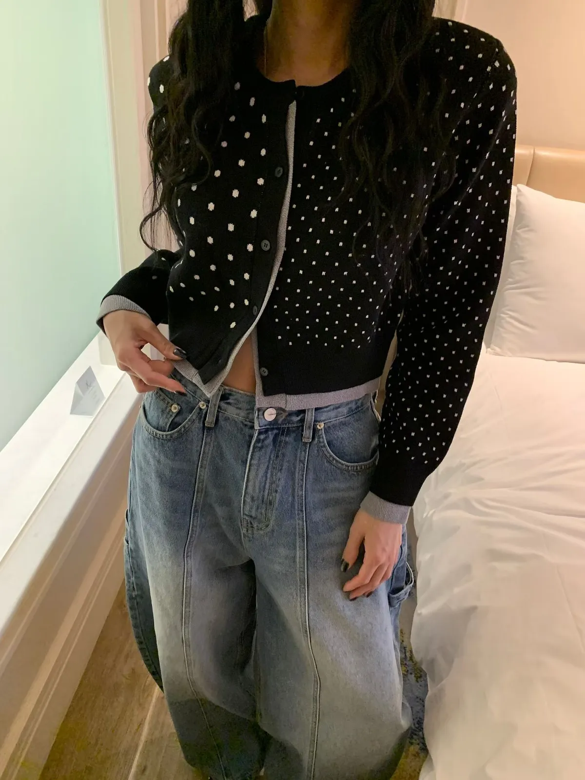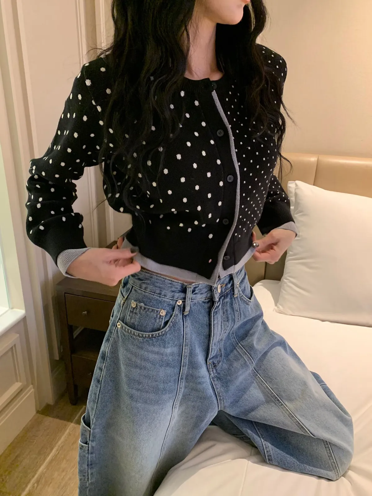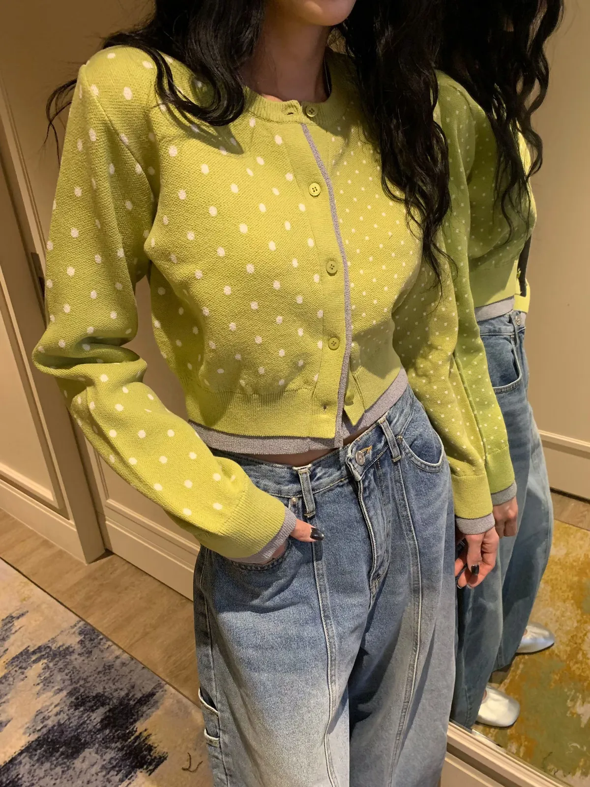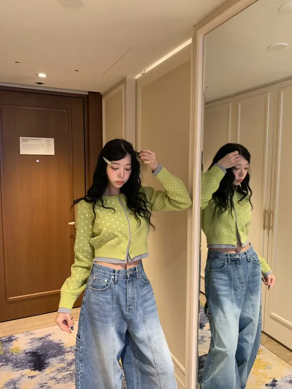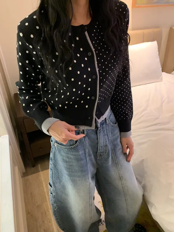 26BC13 點點針織織線排扣撞色邊短版罩衫 3色