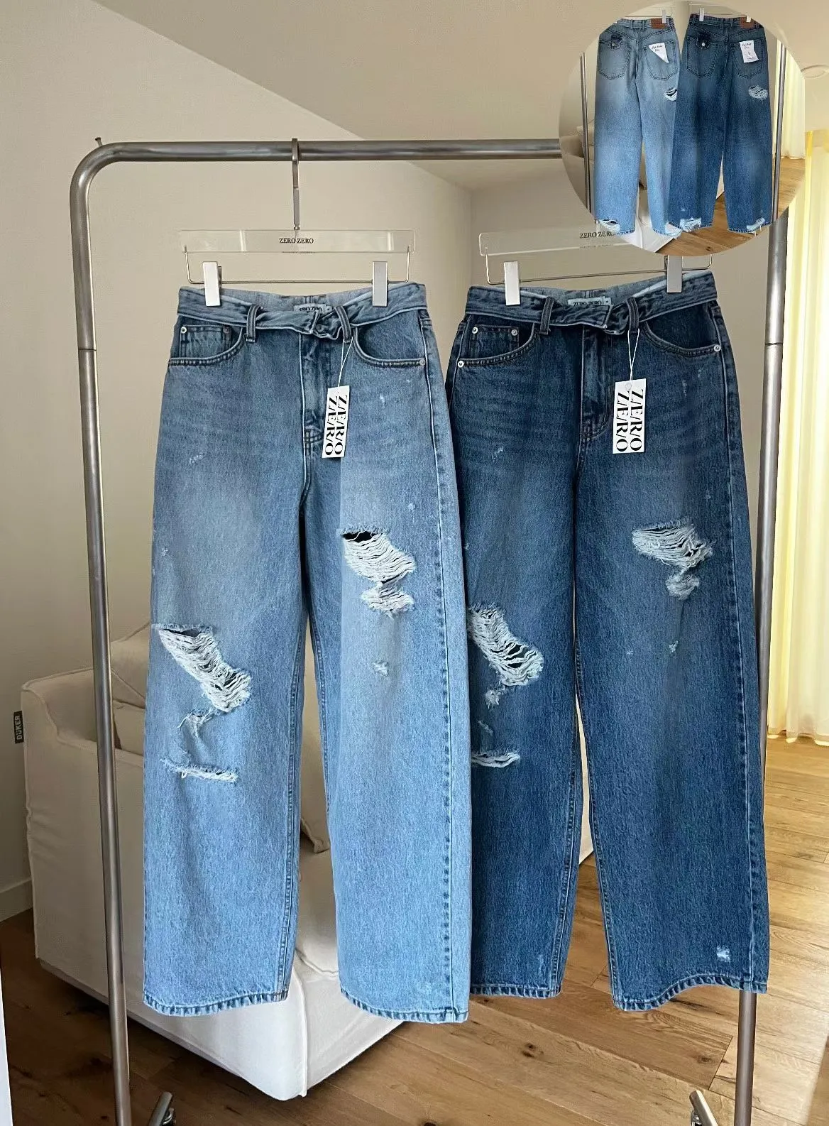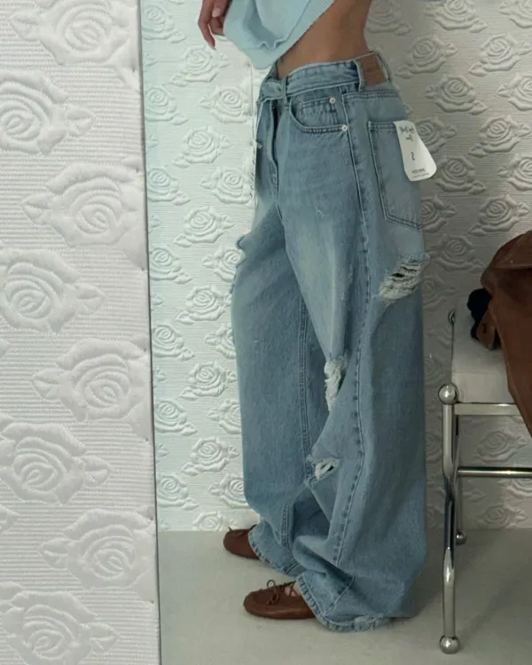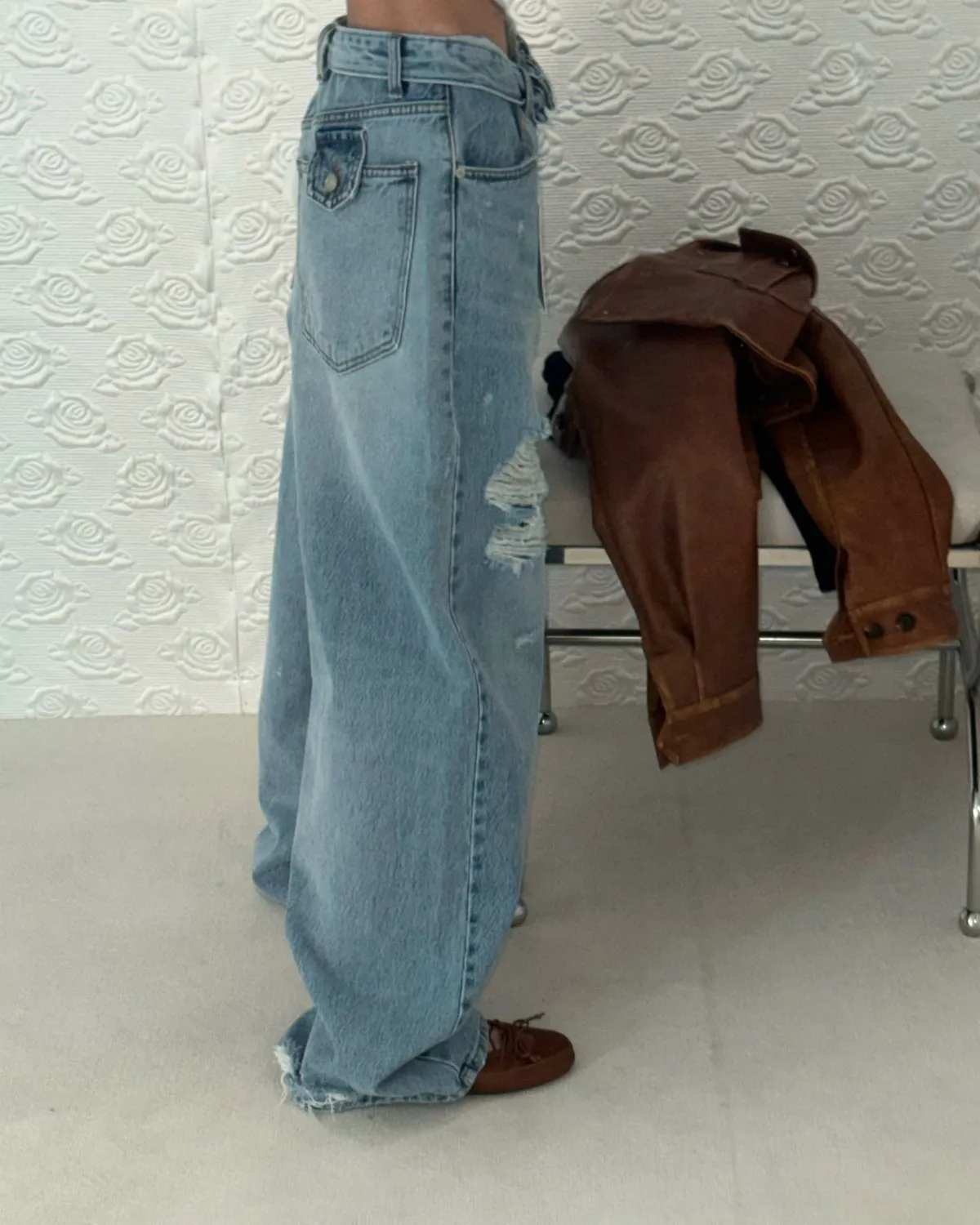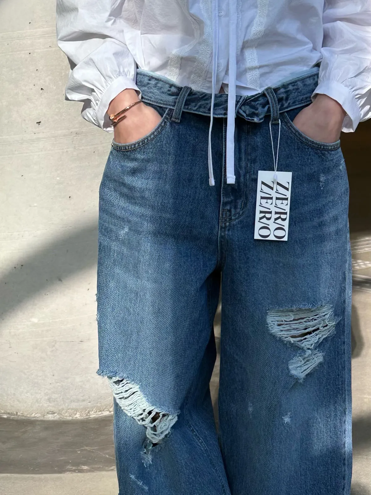 26CB08 反摺腰頭割破壞中低腰牛仔長褲 2色 SML