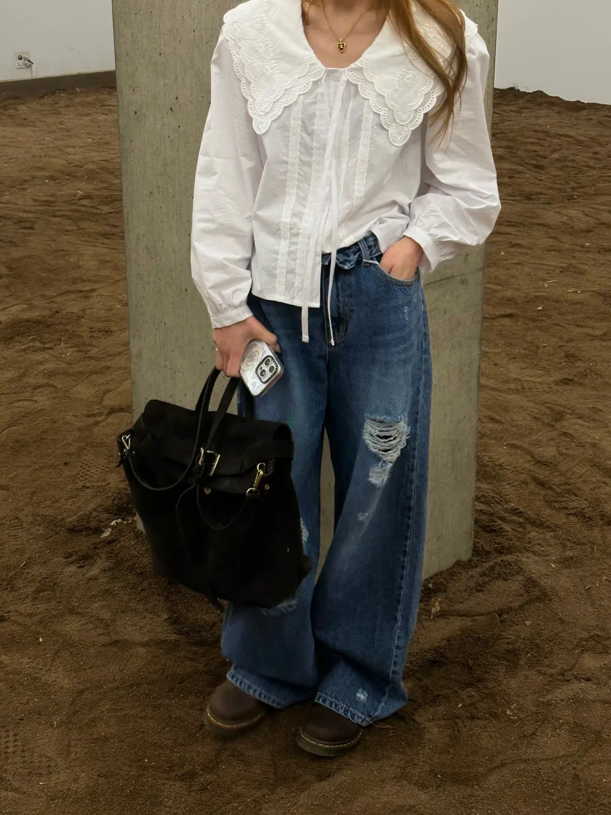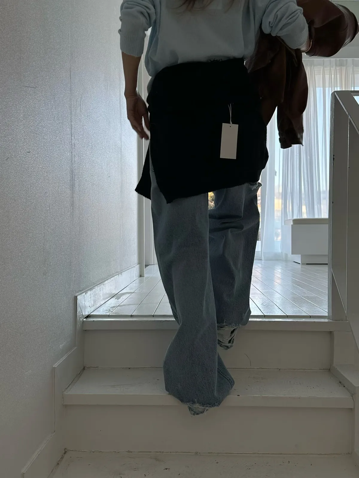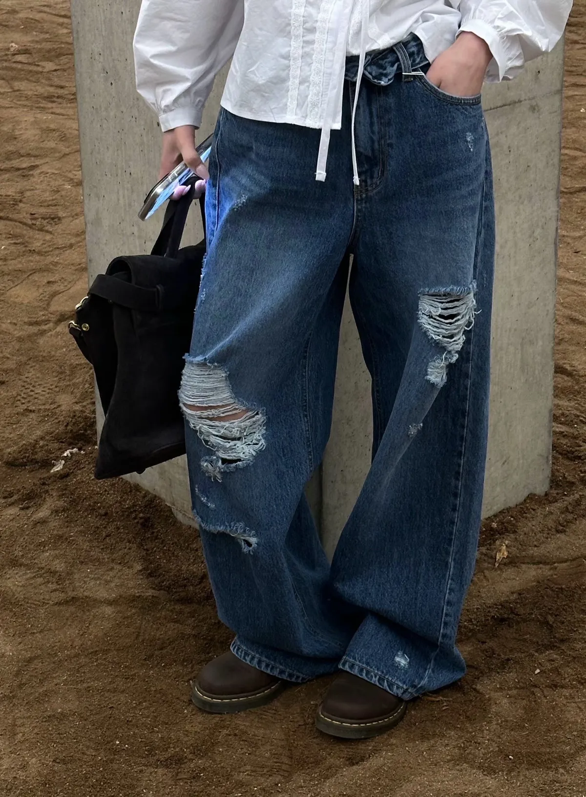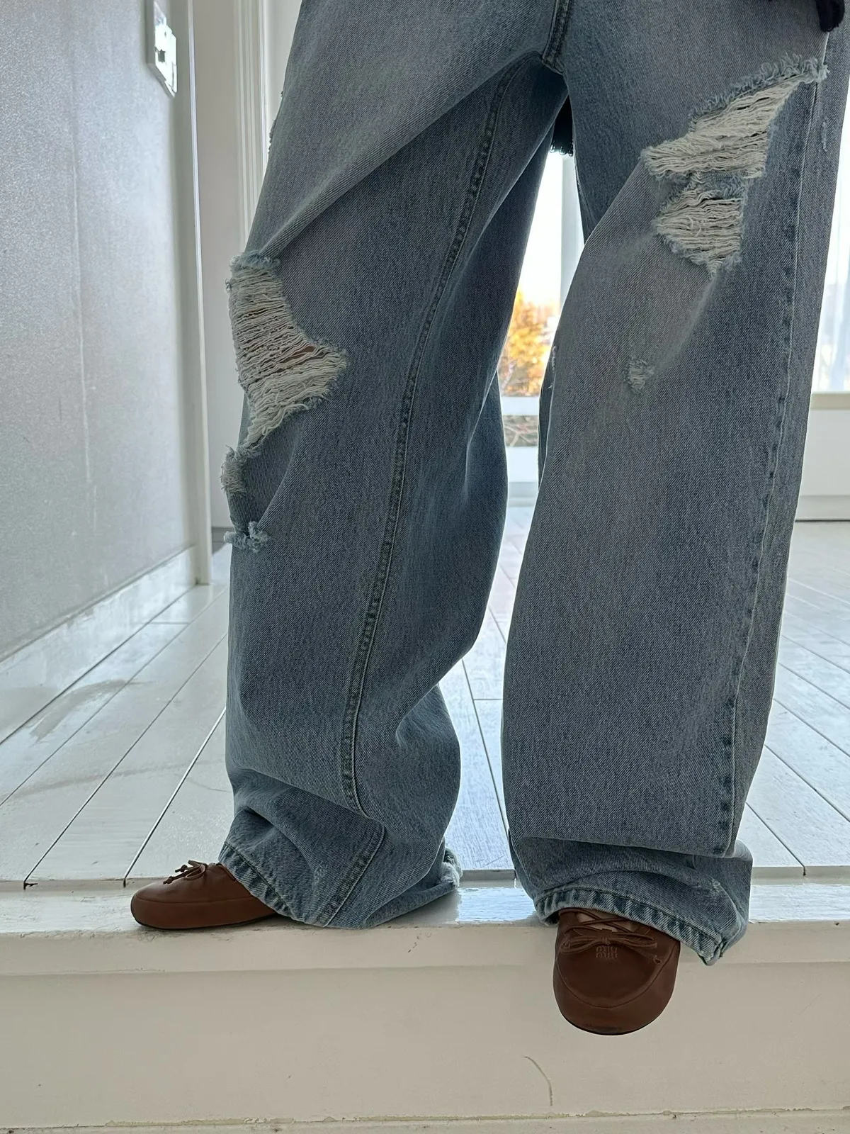 26CB08 反摺腰頭割破壞中低腰牛仔長褲 2色 SML