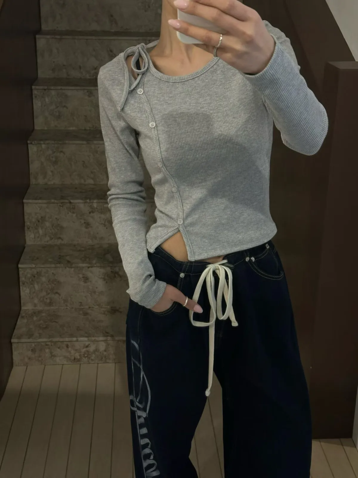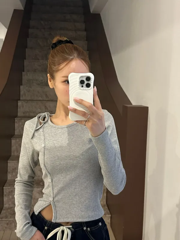 26CB22 綁繩造型坑條斜排扣長T 3ㄙㄜ