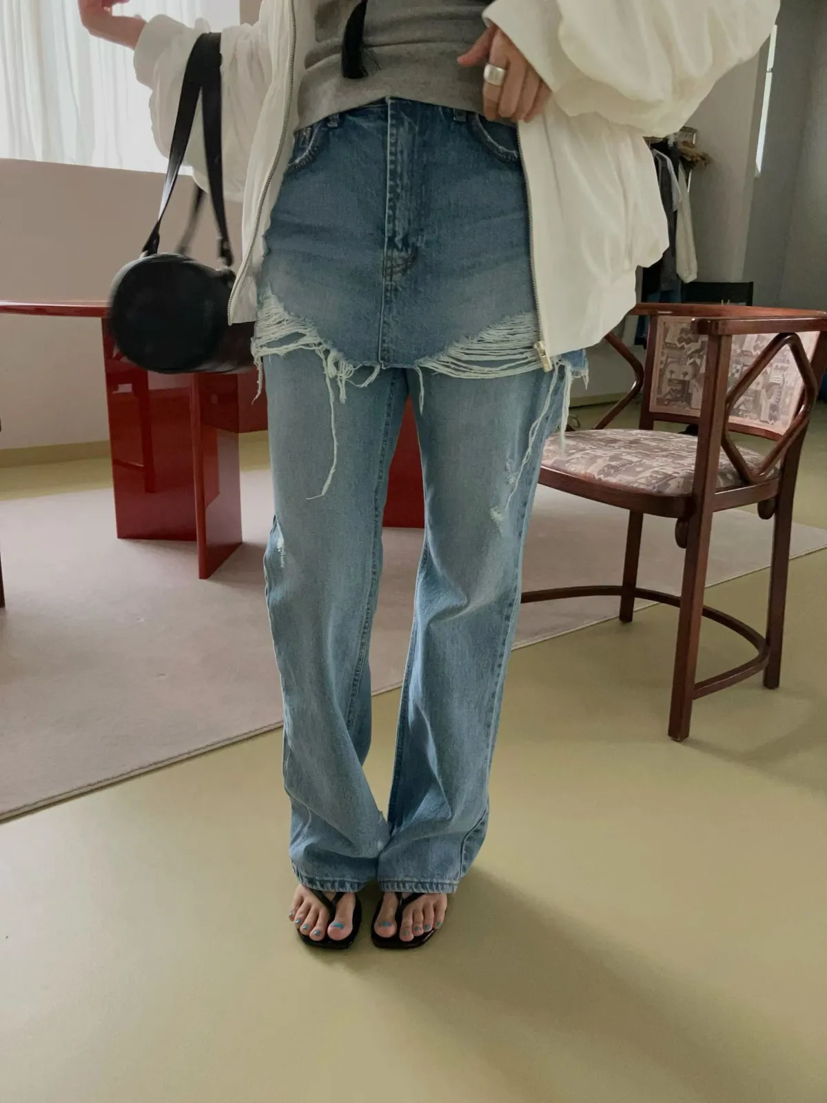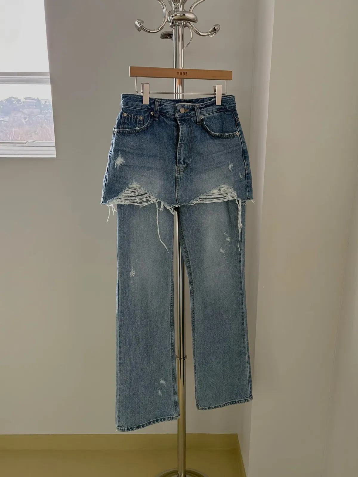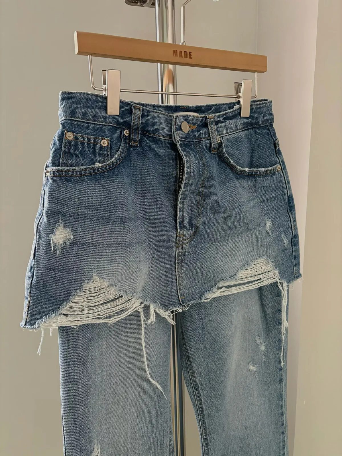 26CD22 假兩件洗色牛仔裙拼長褲 SML