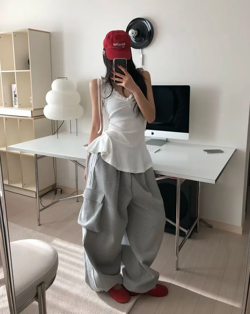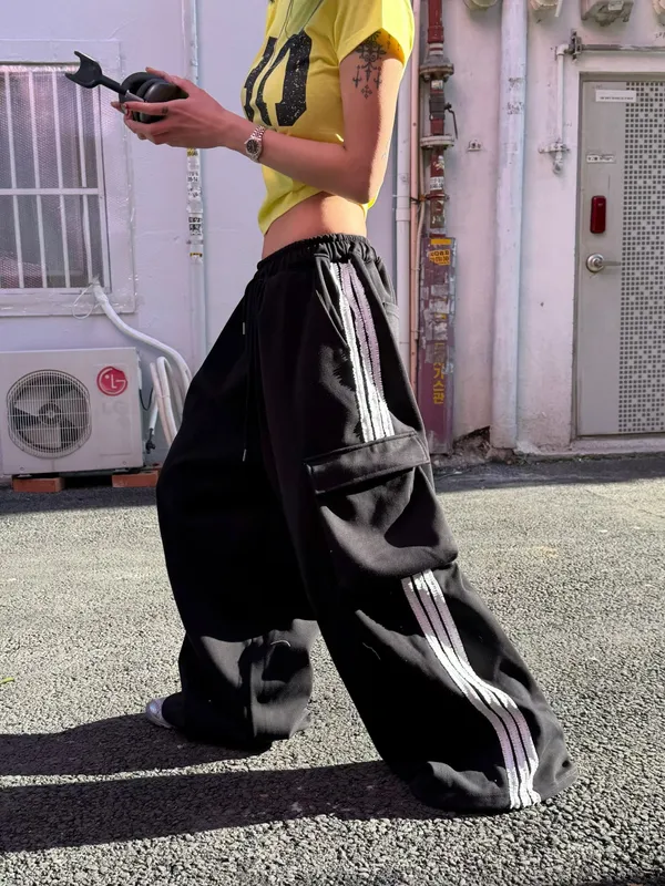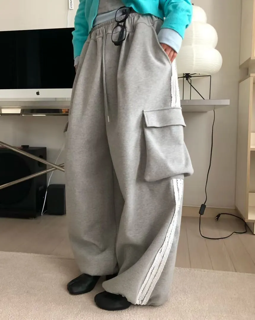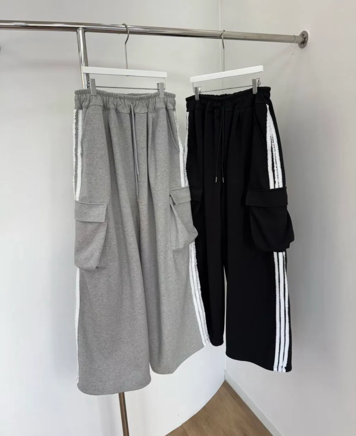 26CE24 奶油擠花邊條工裝兩穿縮腳長褲 2色