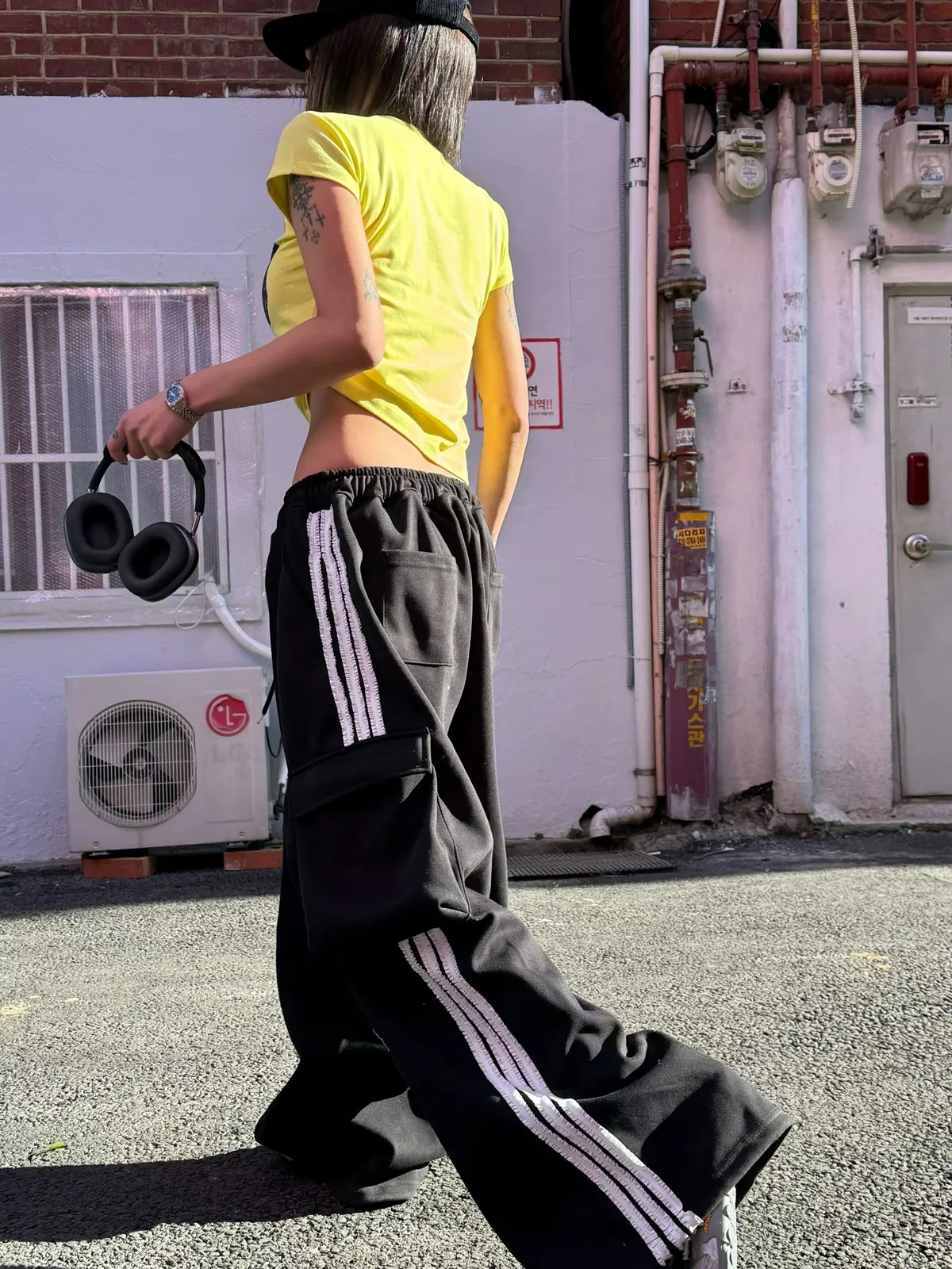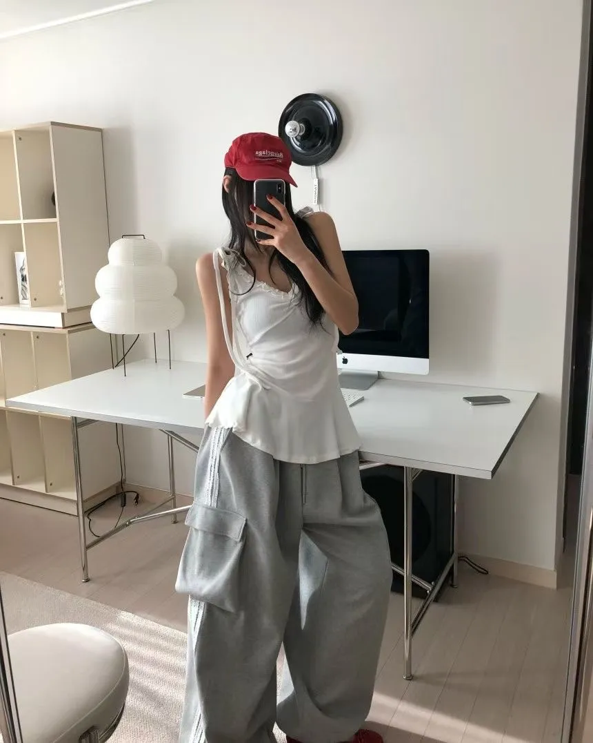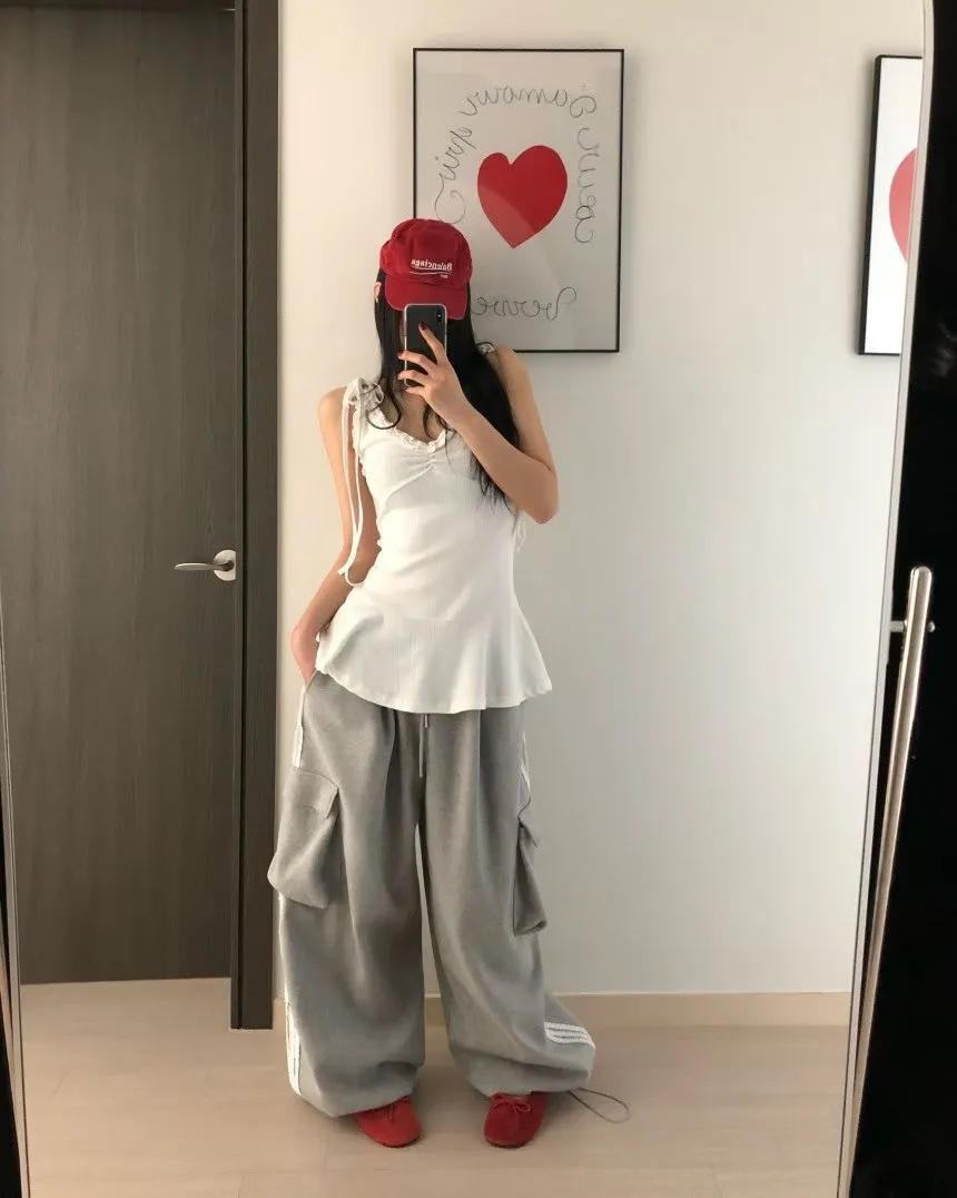 26CE24 奶油擠花邊條工裝兩穿縮腳長褲 2色