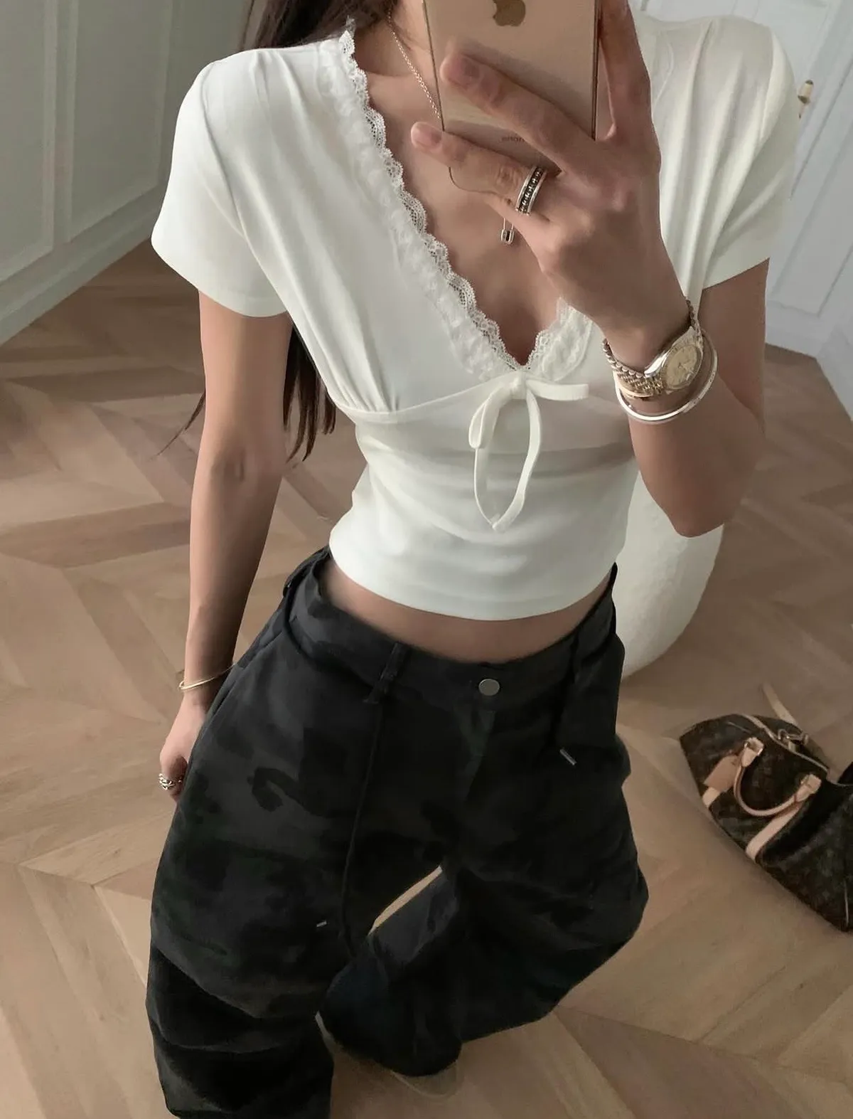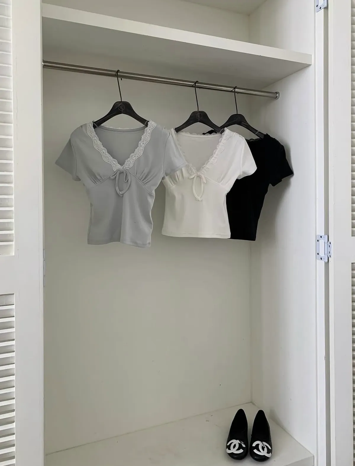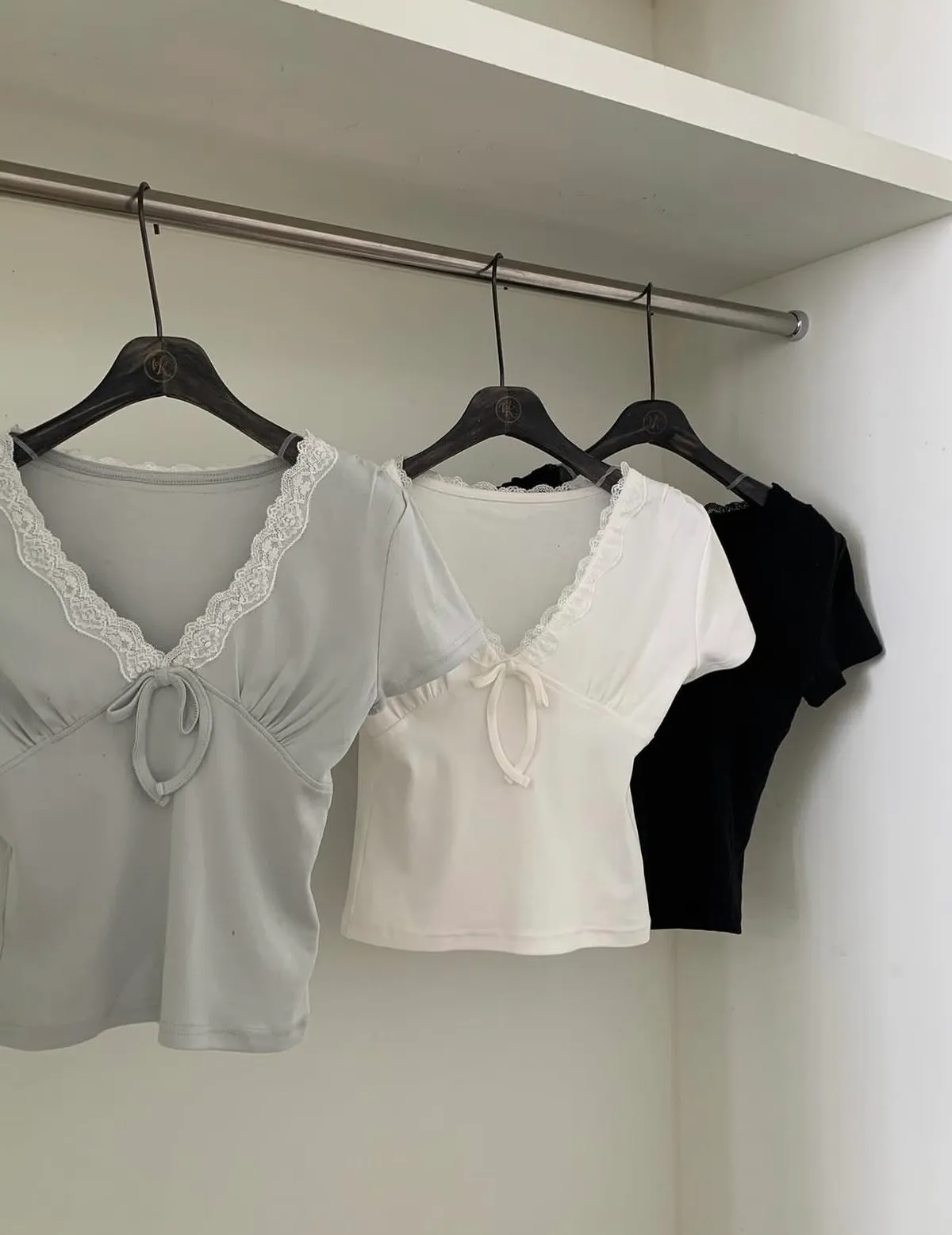 26CG12 蕾絲V領小蝴蝶結短T 3色