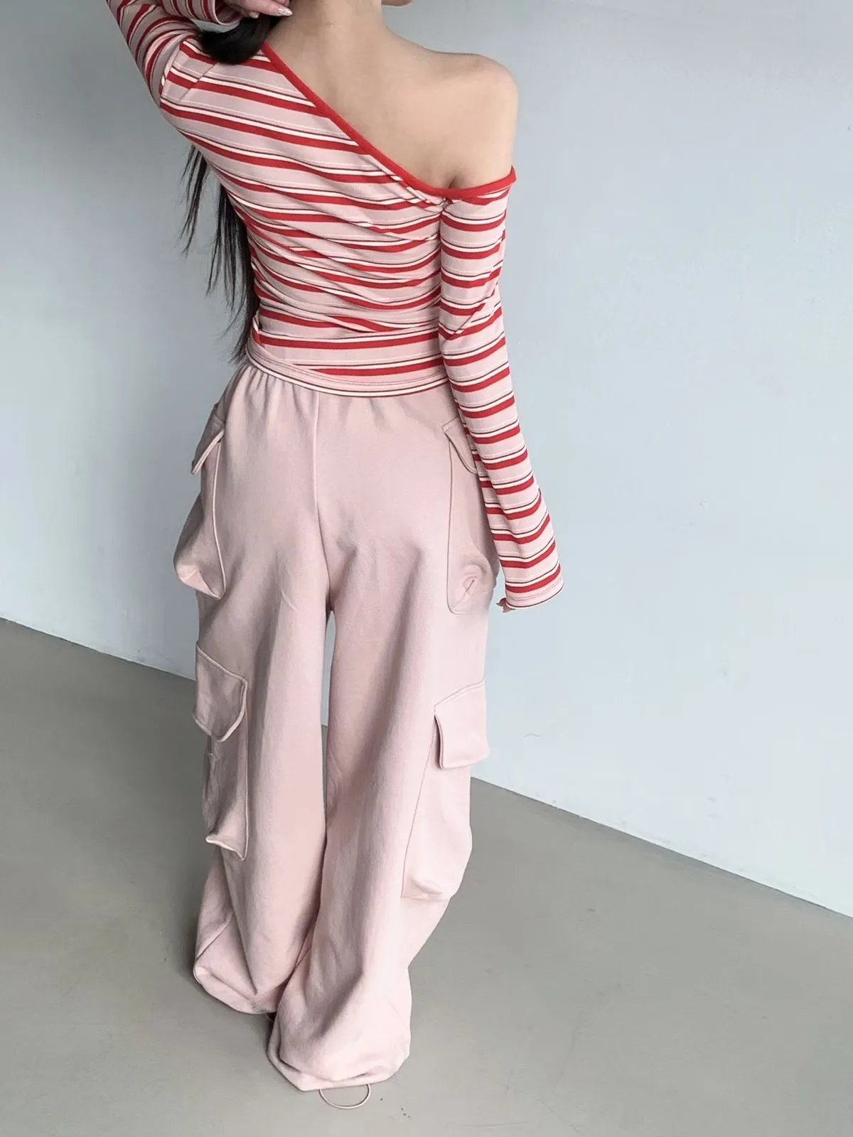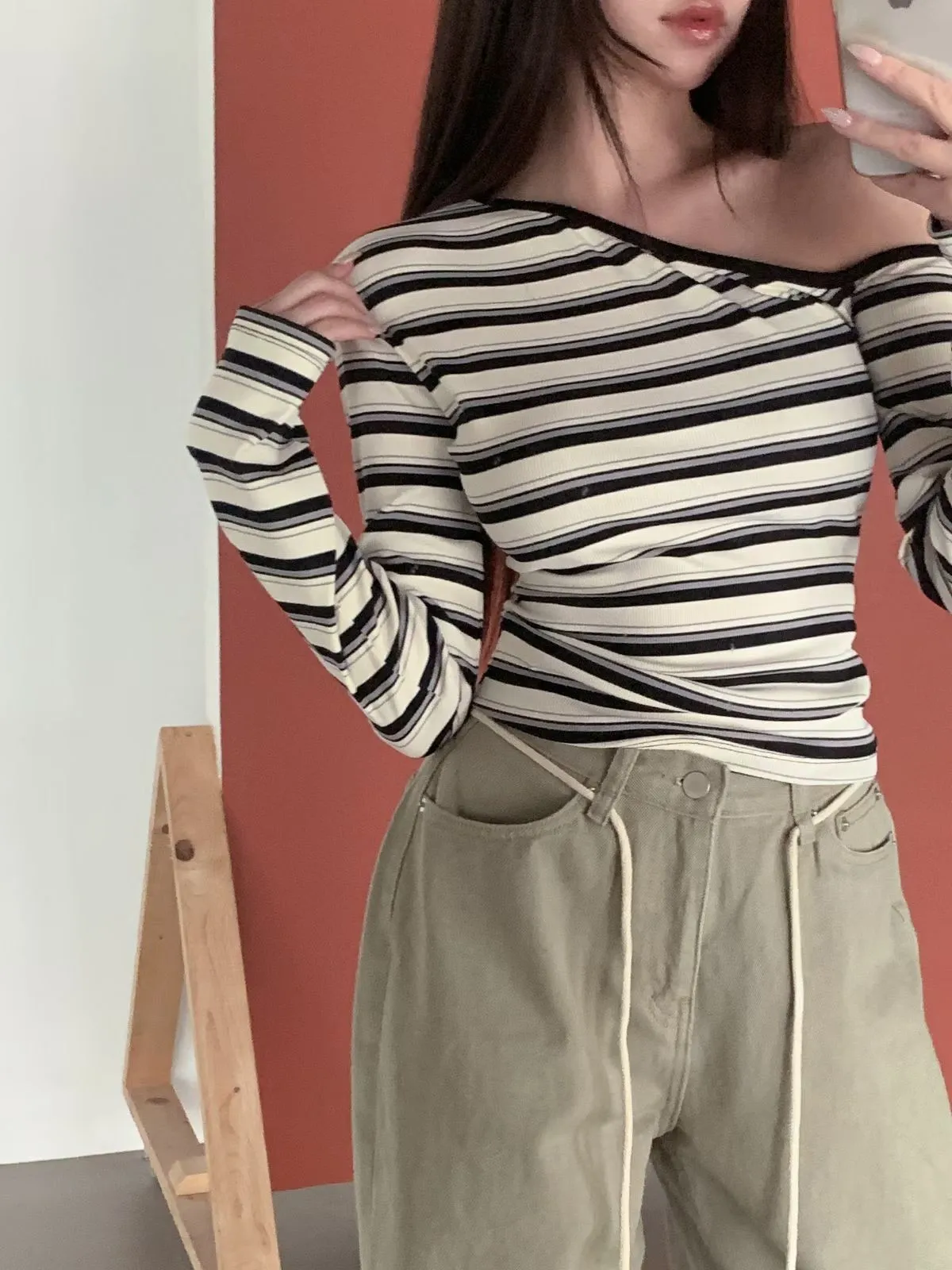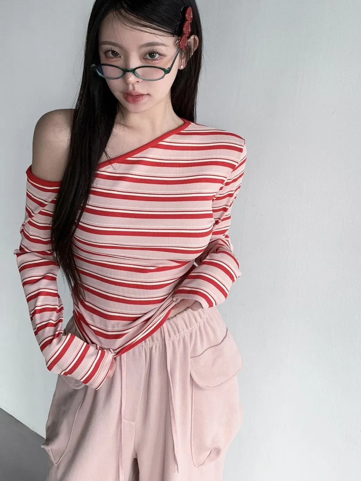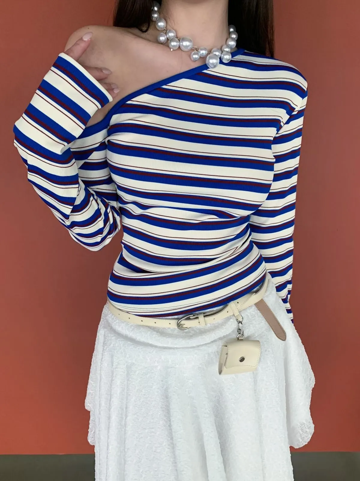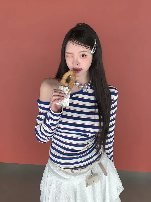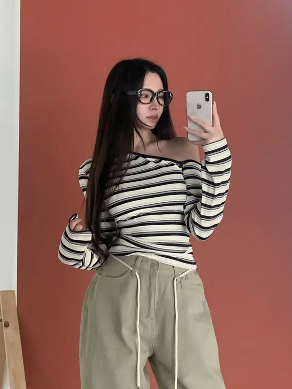 26CH01 撞色條紋斜肩羅紋長T 4色