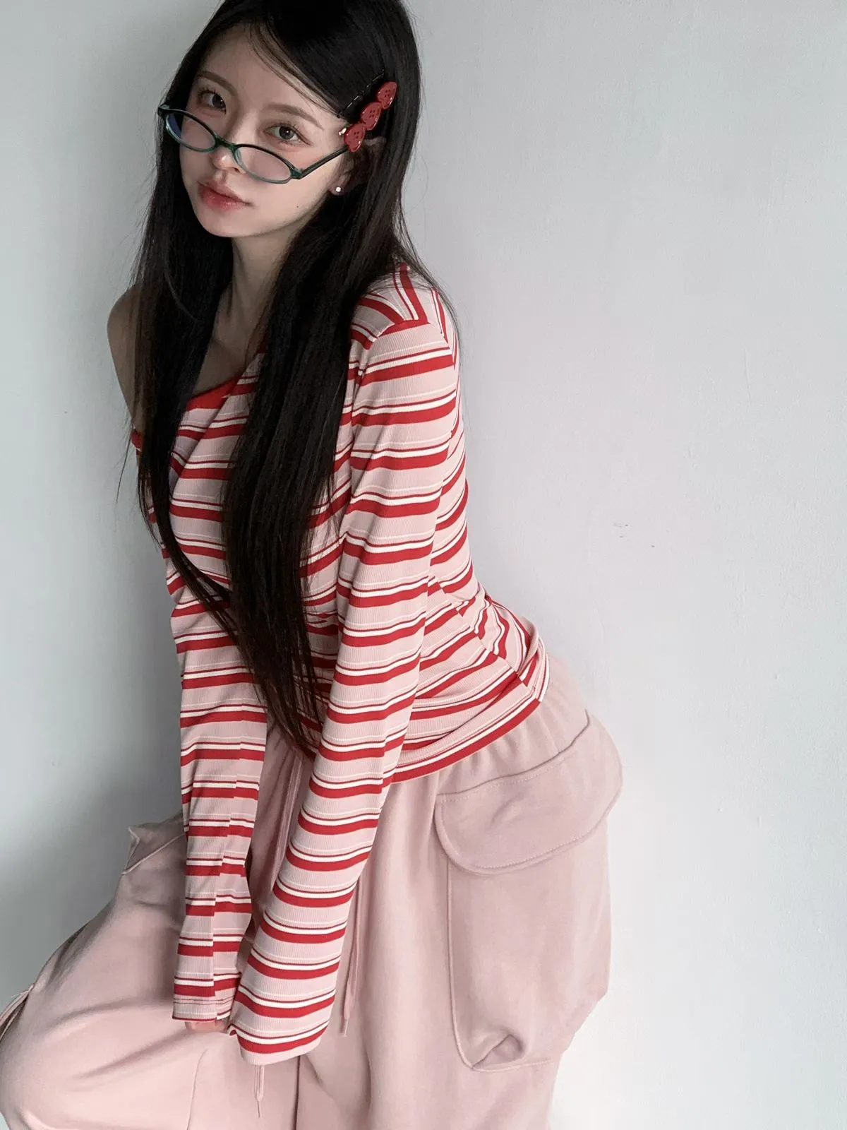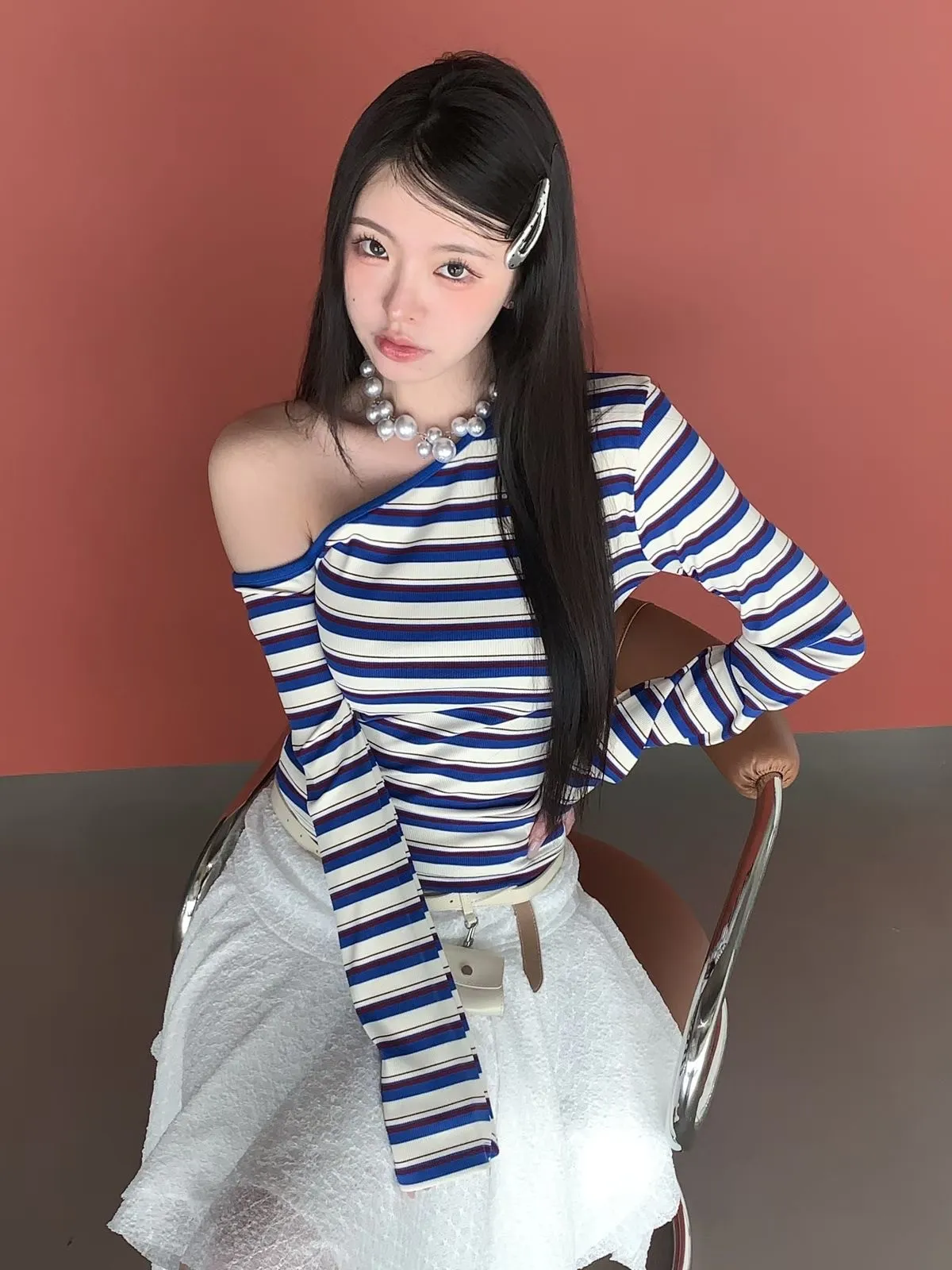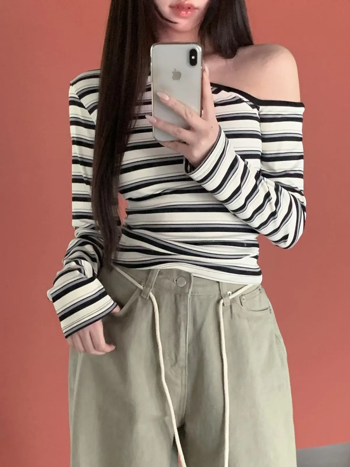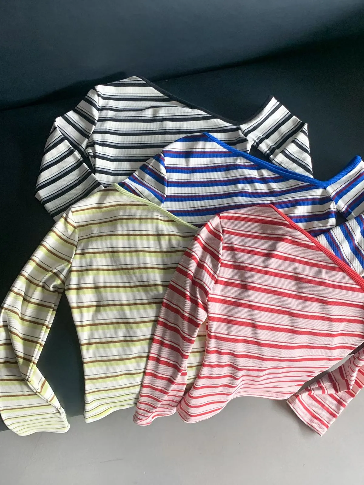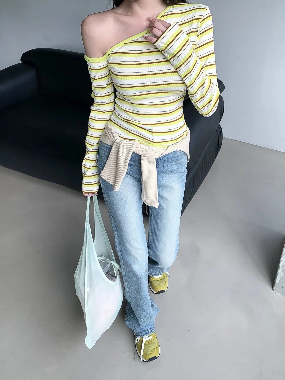 26CH01 撞色條紋斜肩羅紋長T 4色