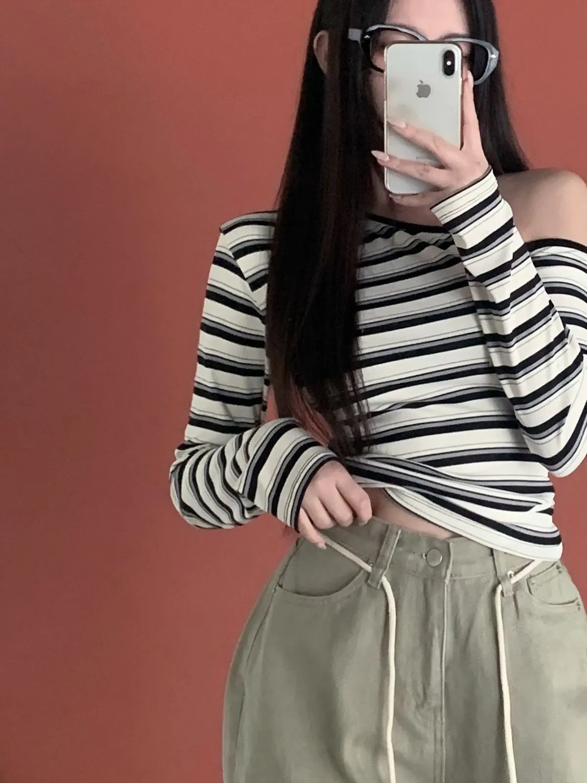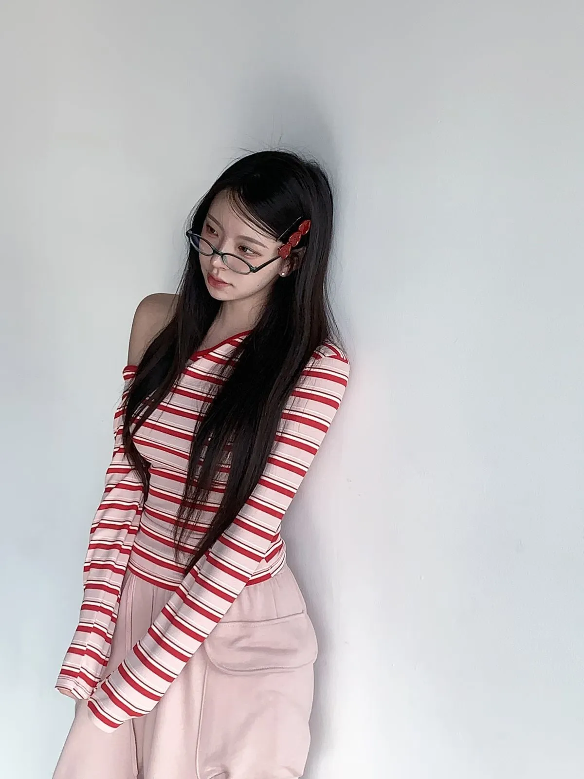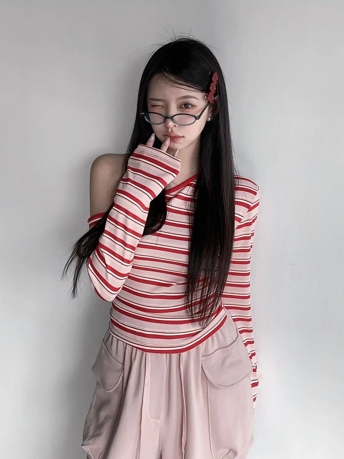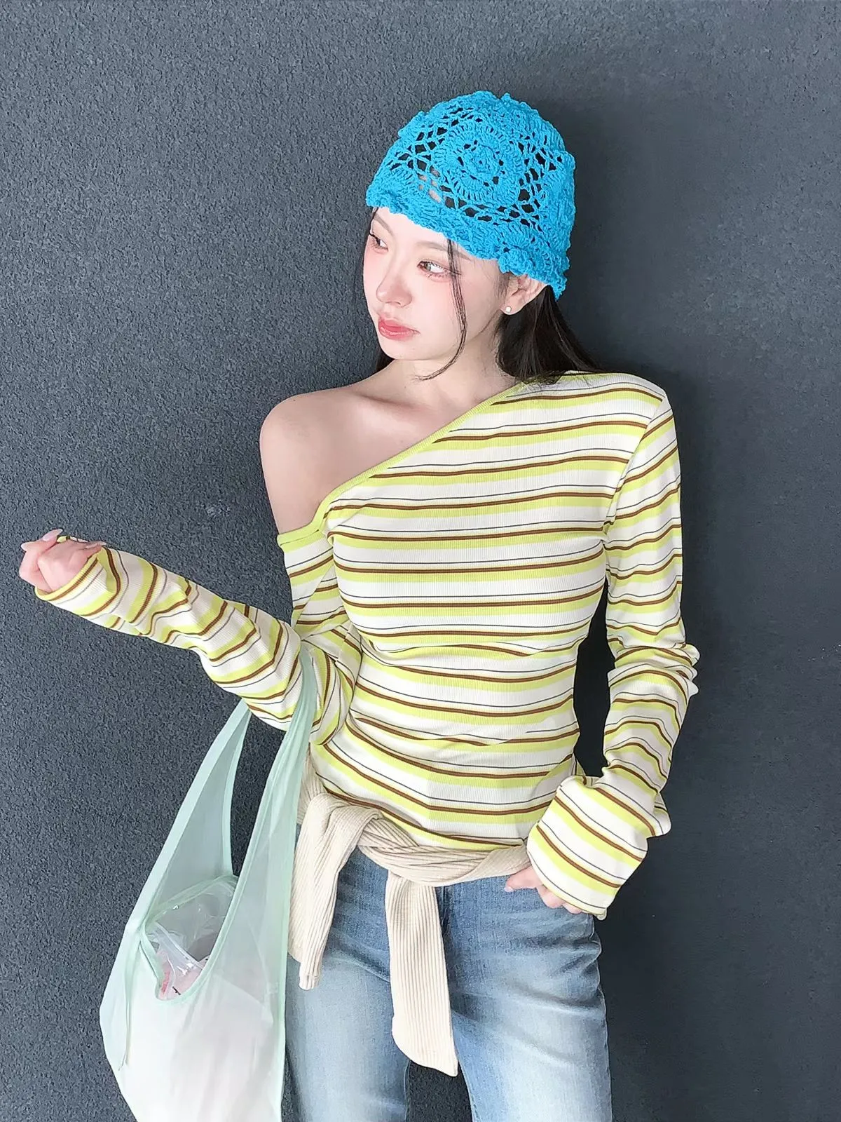 26CH01 撞色條紋斜肩羅紋長T 4色