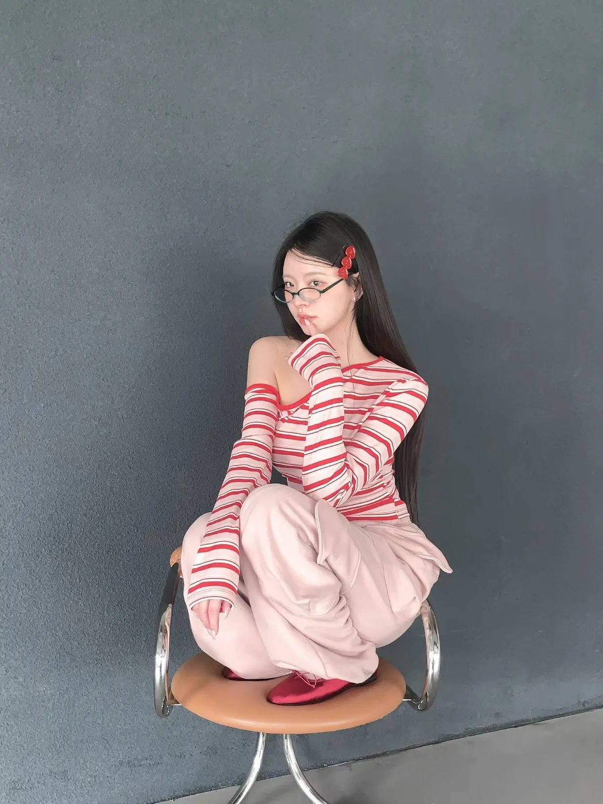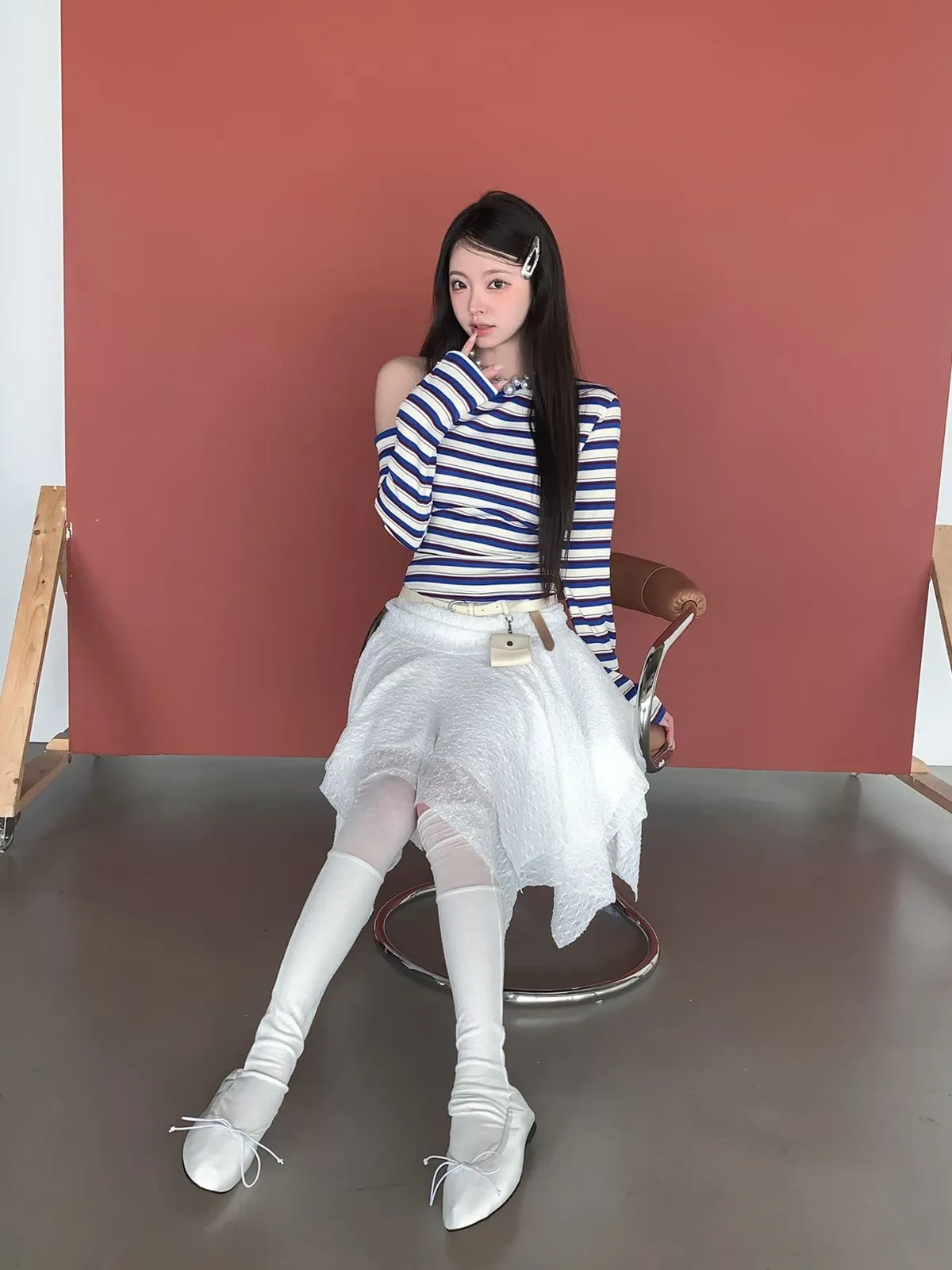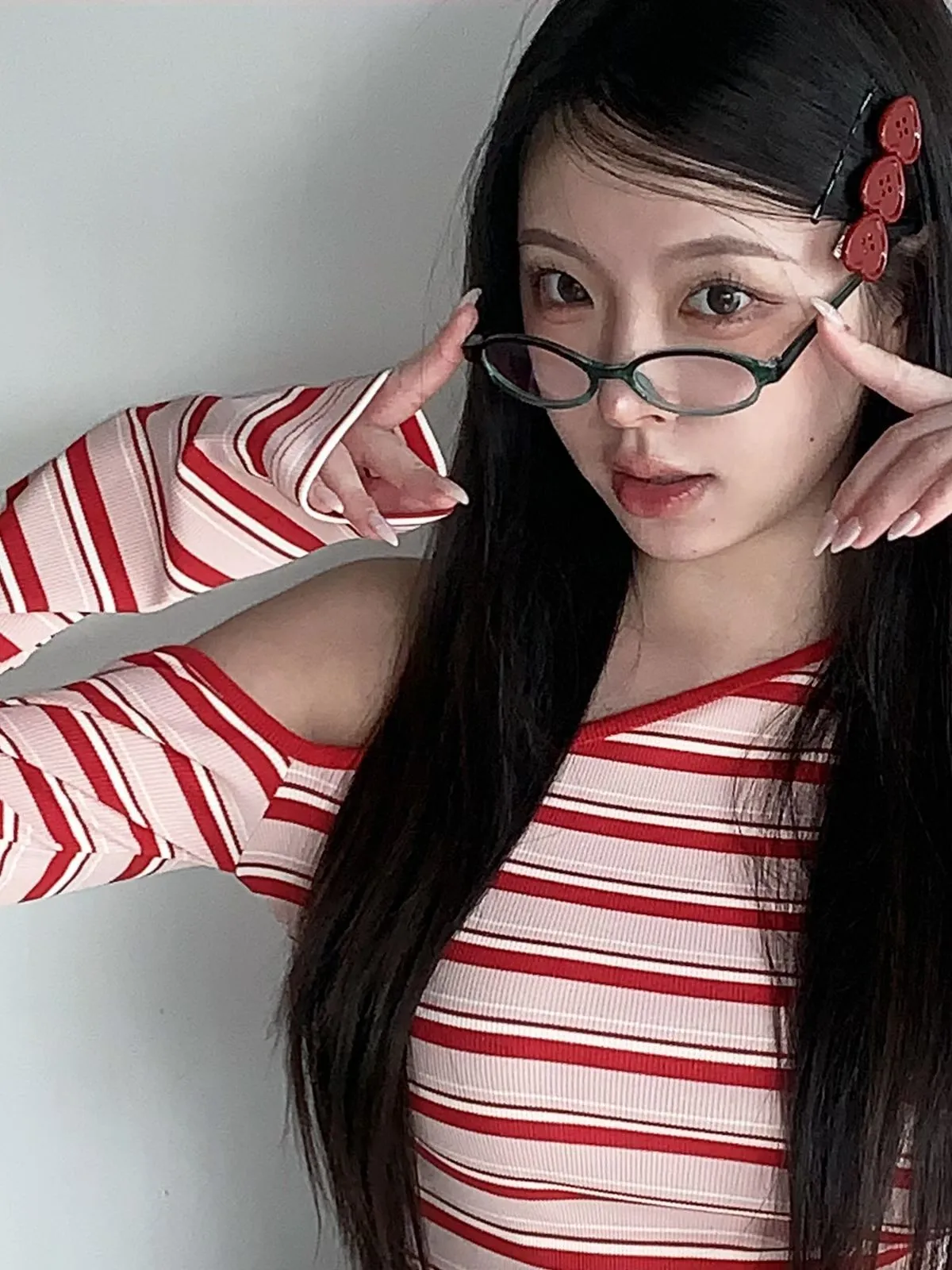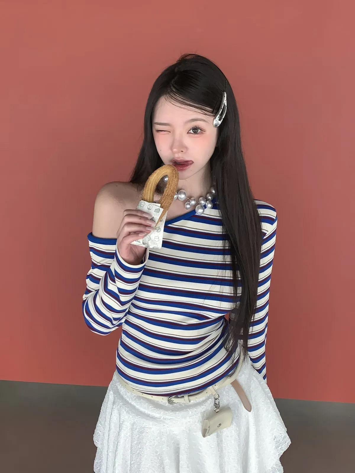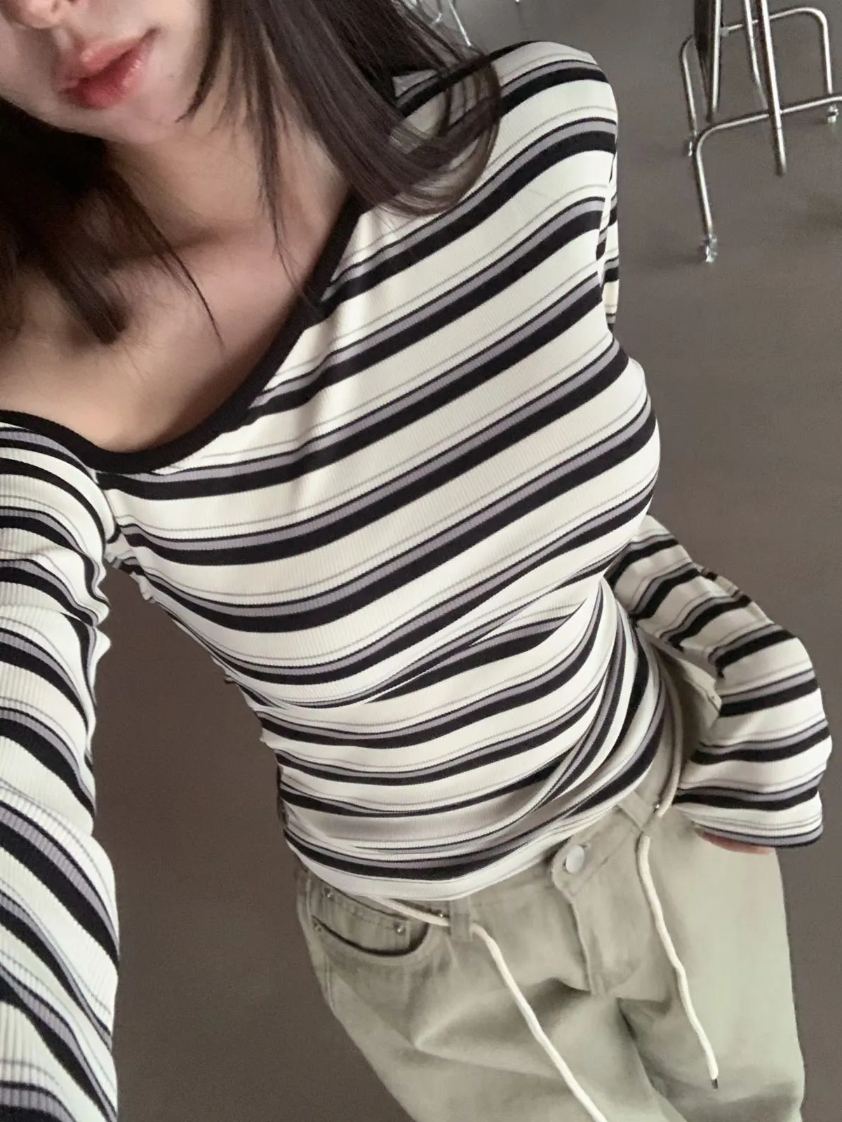 26CH01 撞色條紋斜肩羅紋長T 4色