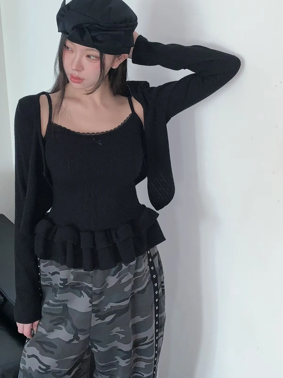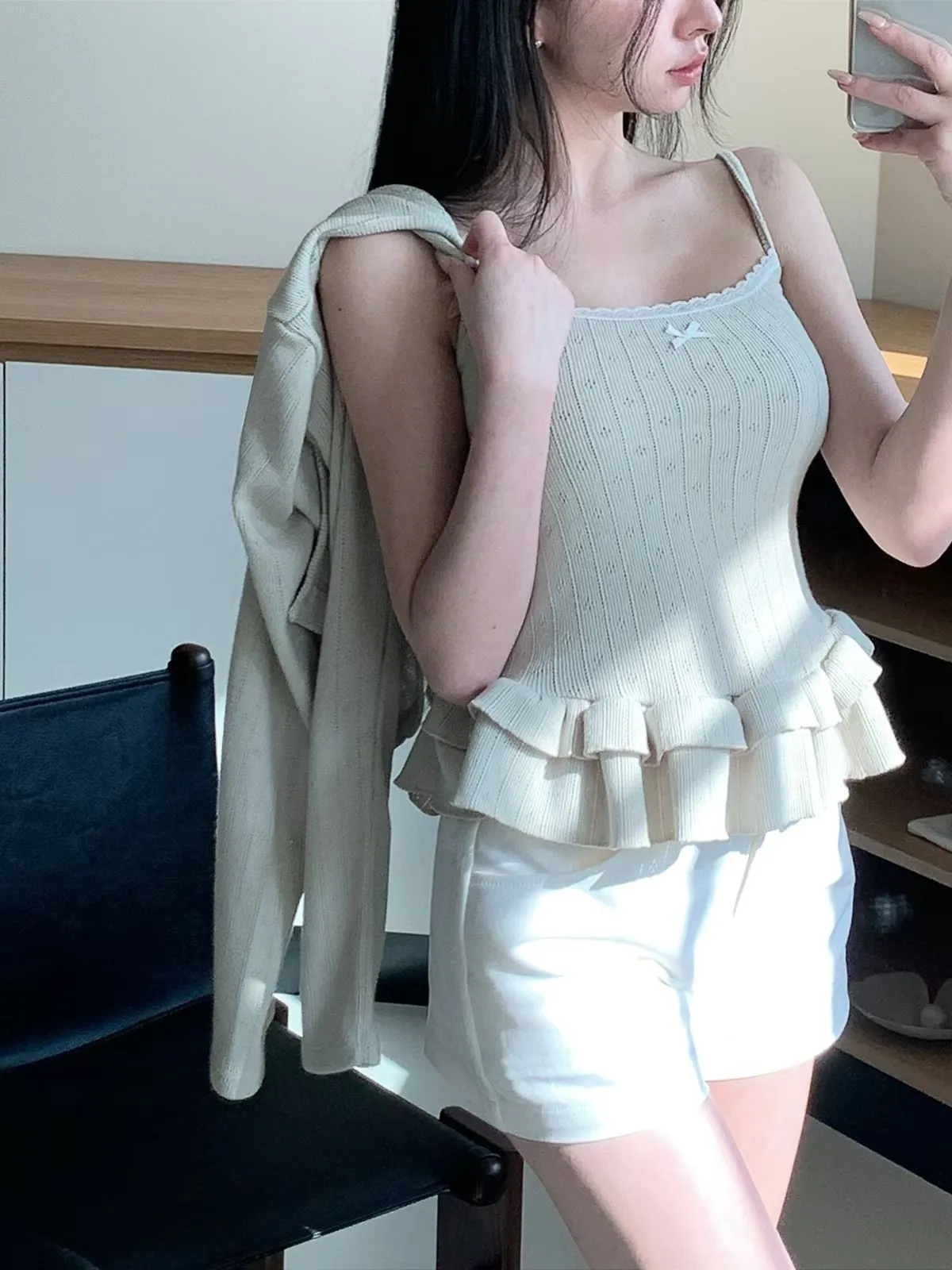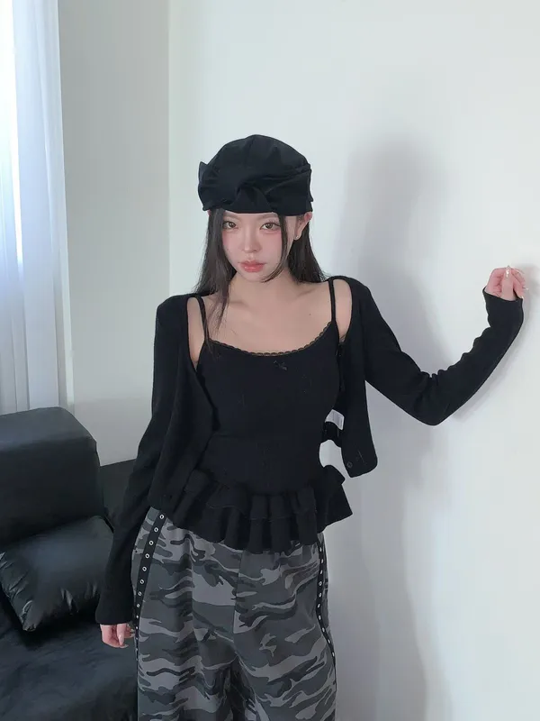 26CH03 (闆娘自留)洞洞織線荷葉下擺背心+短版外罩 set 3色