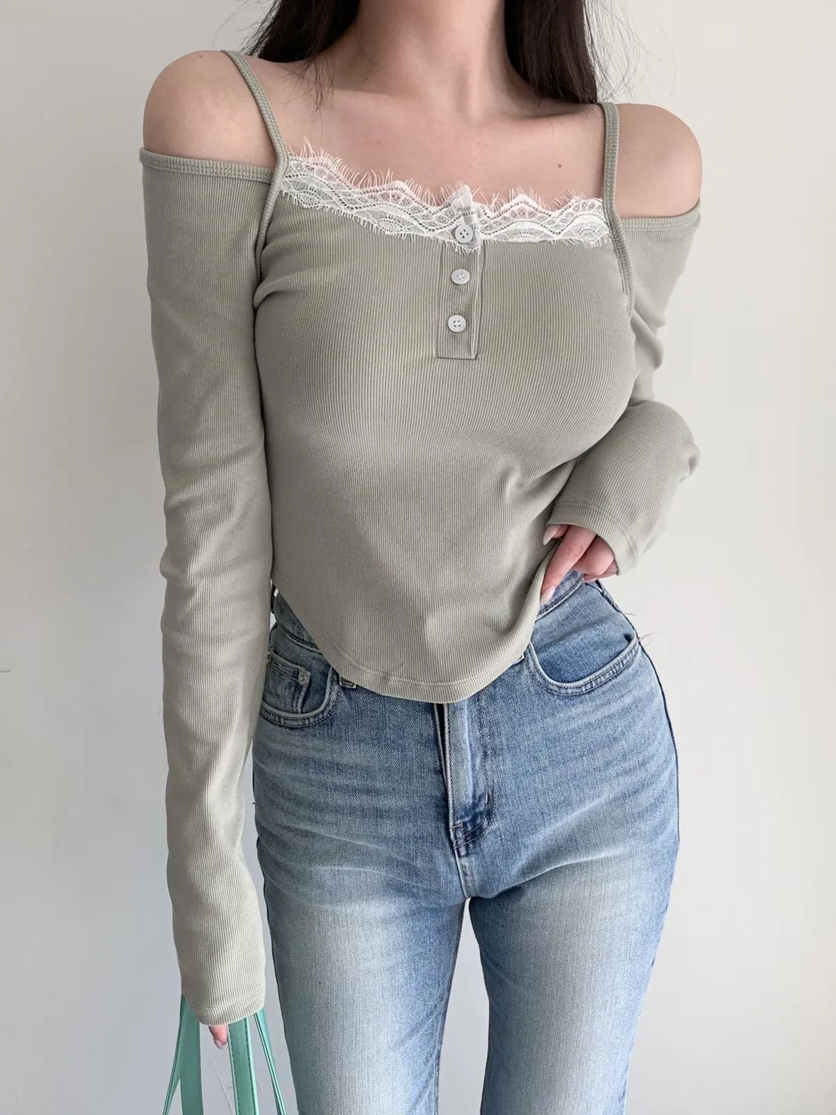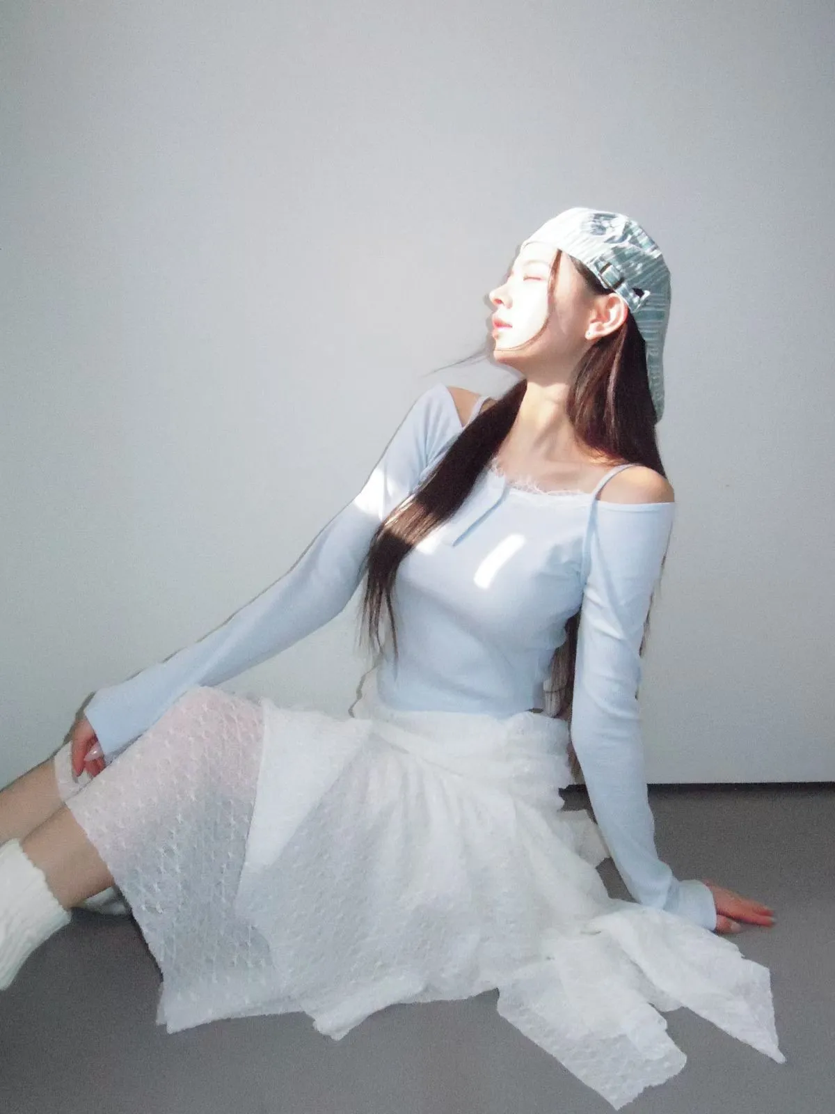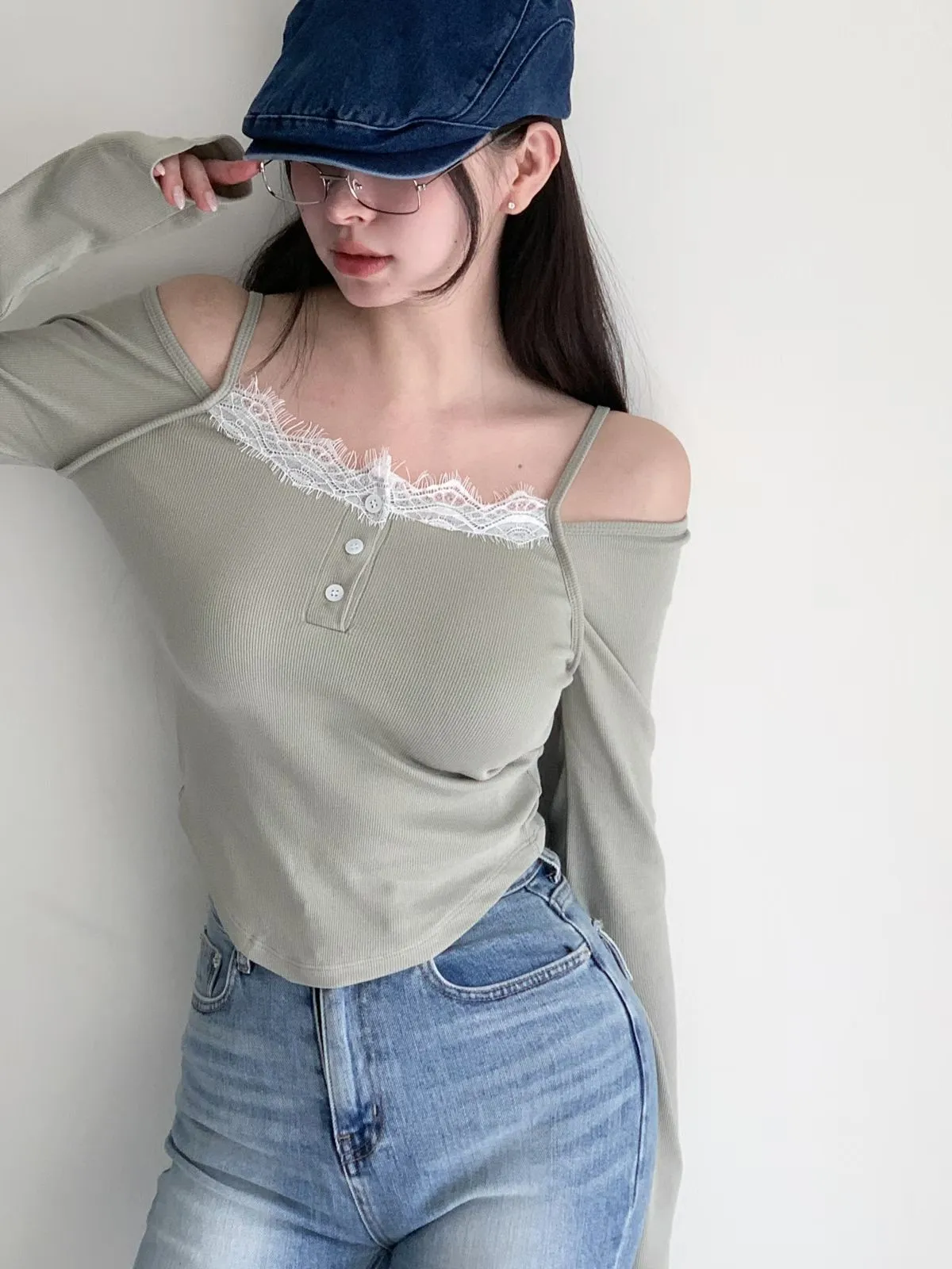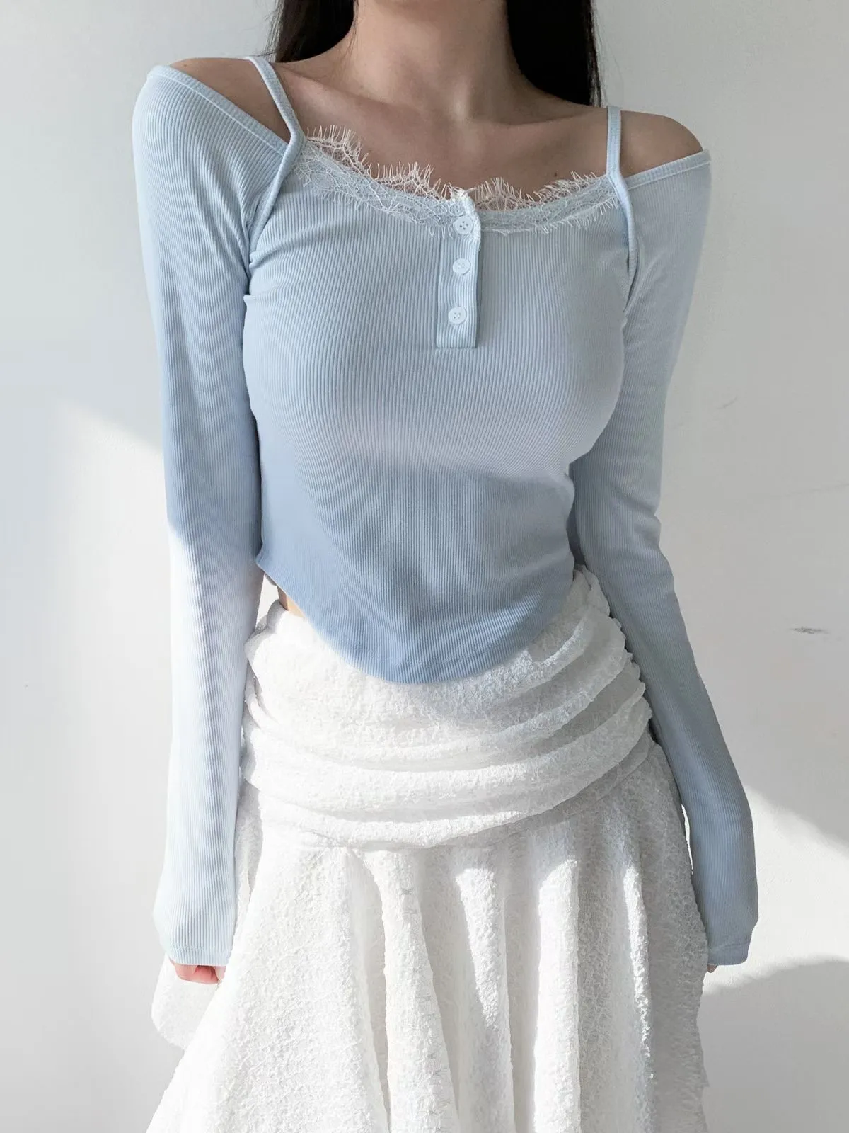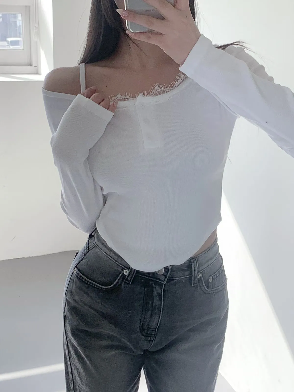 26CH08 睫毛蕾絲背心假兩件平口上衣 4色
