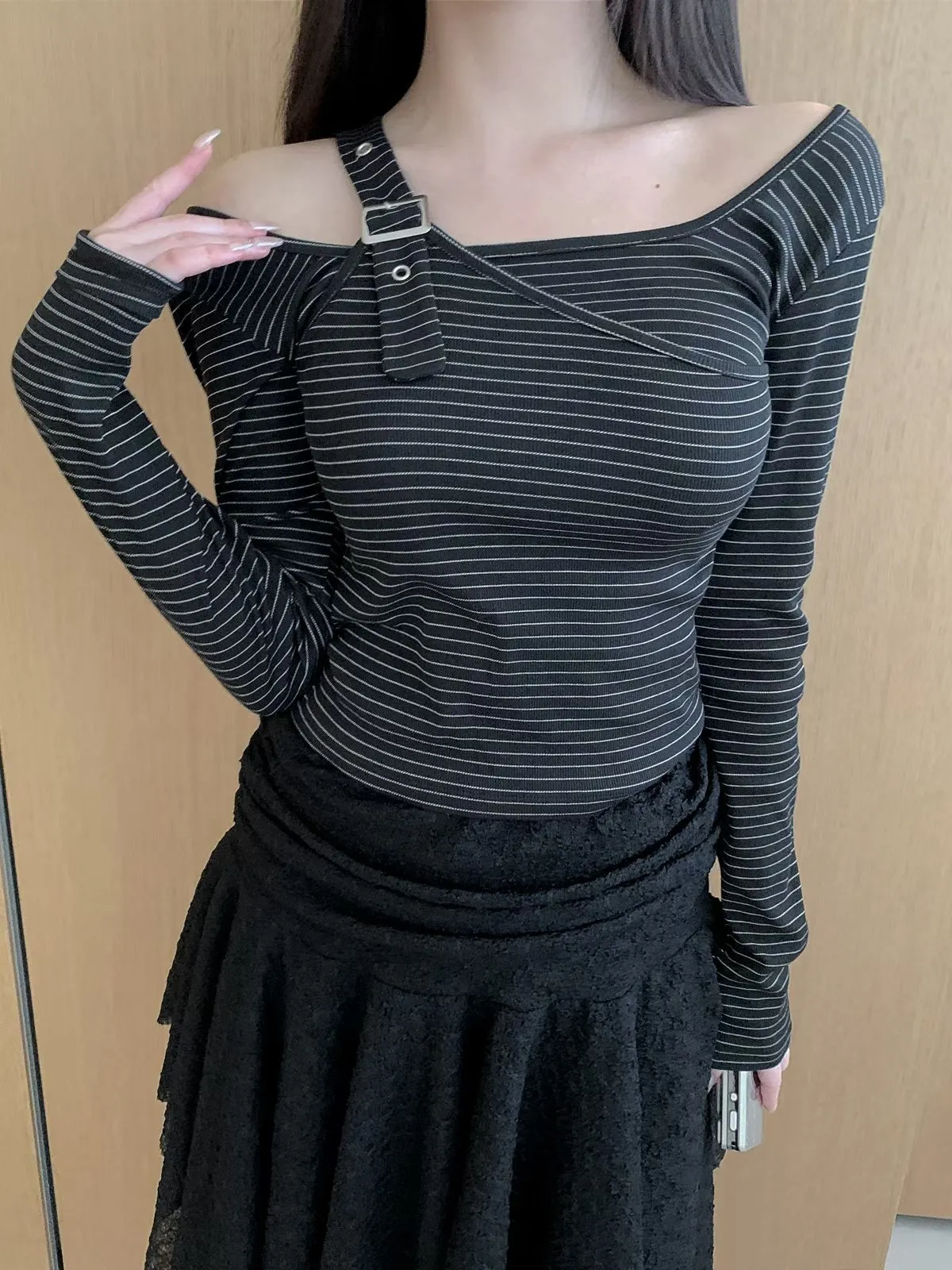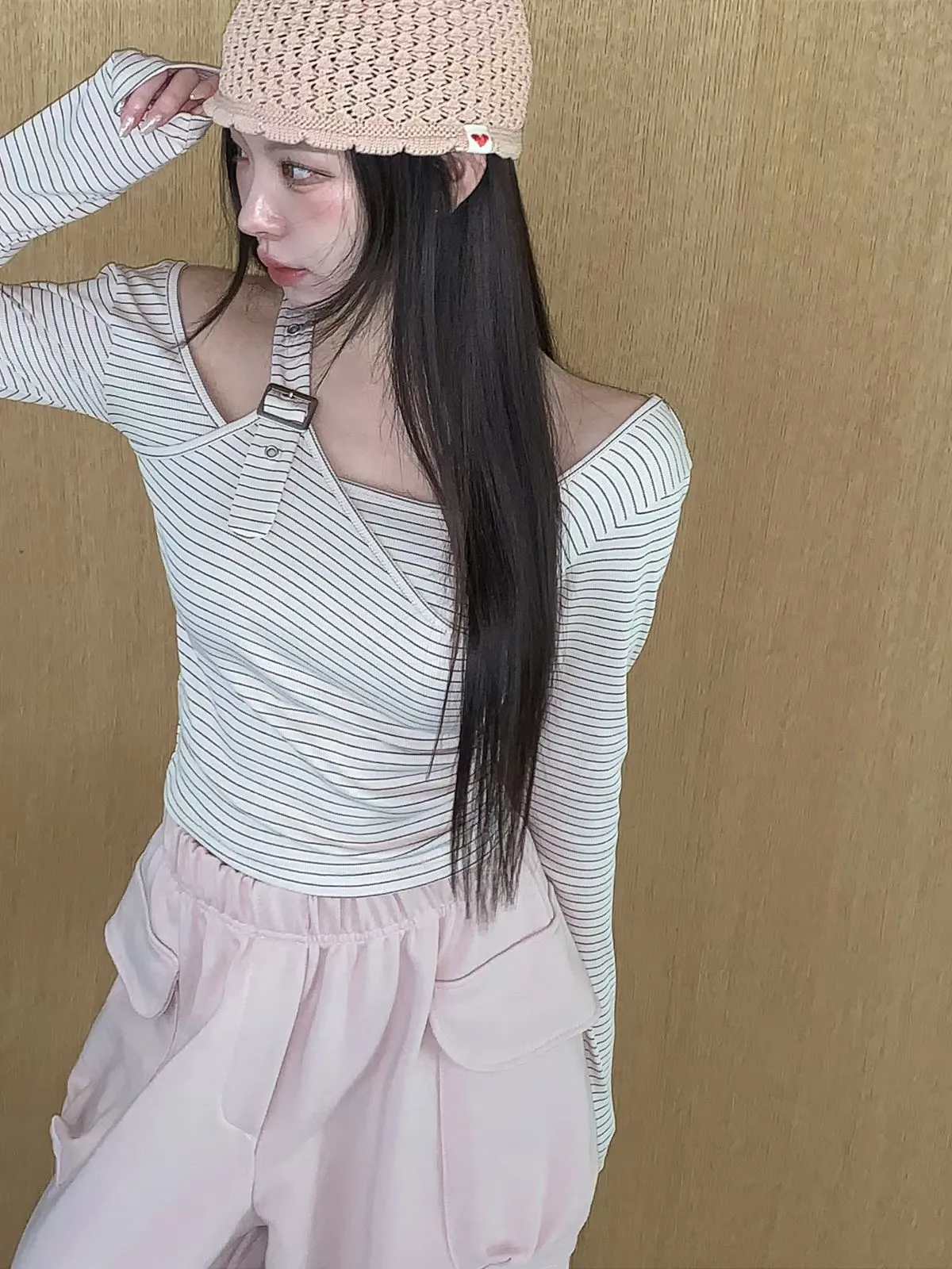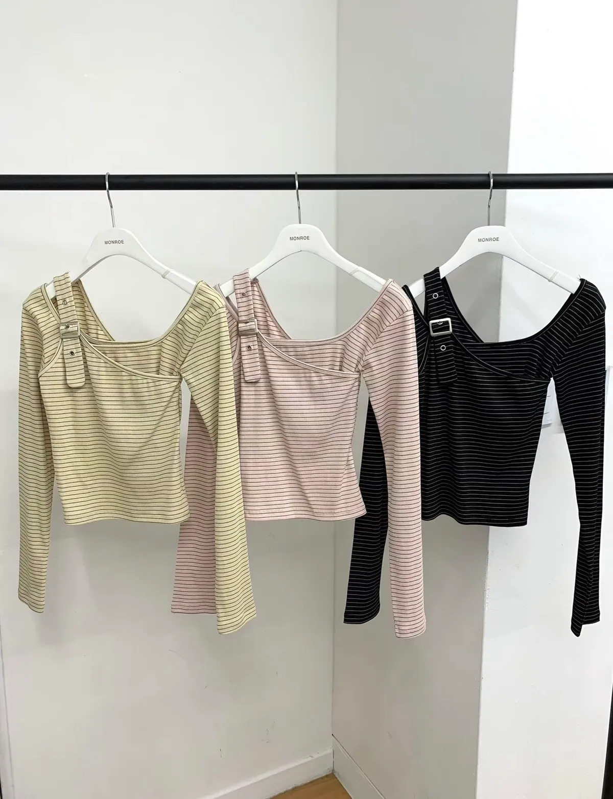 26CH13 細條紋調扣肩帶上衣 3色