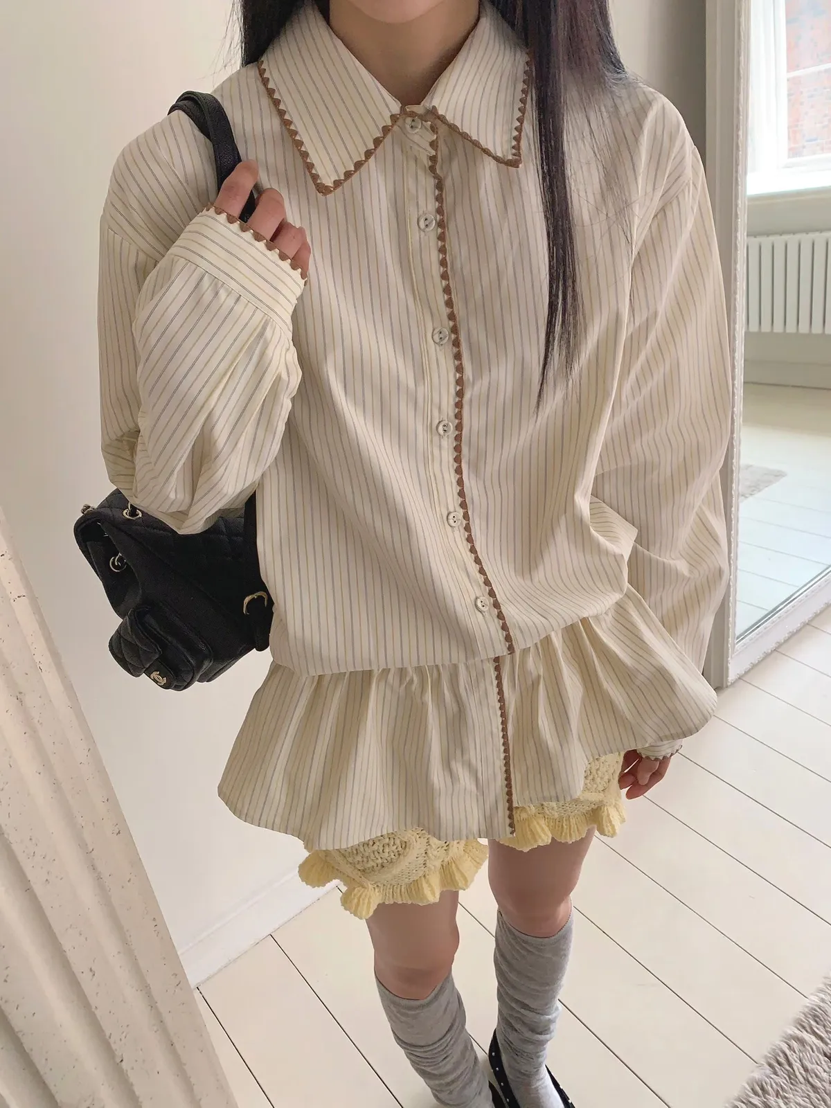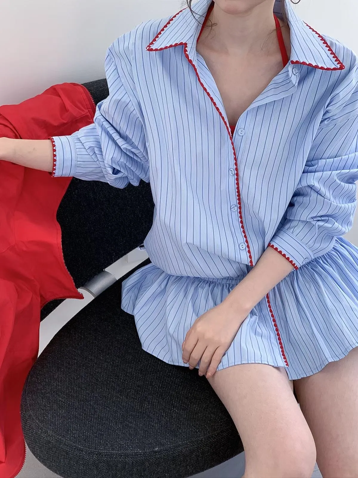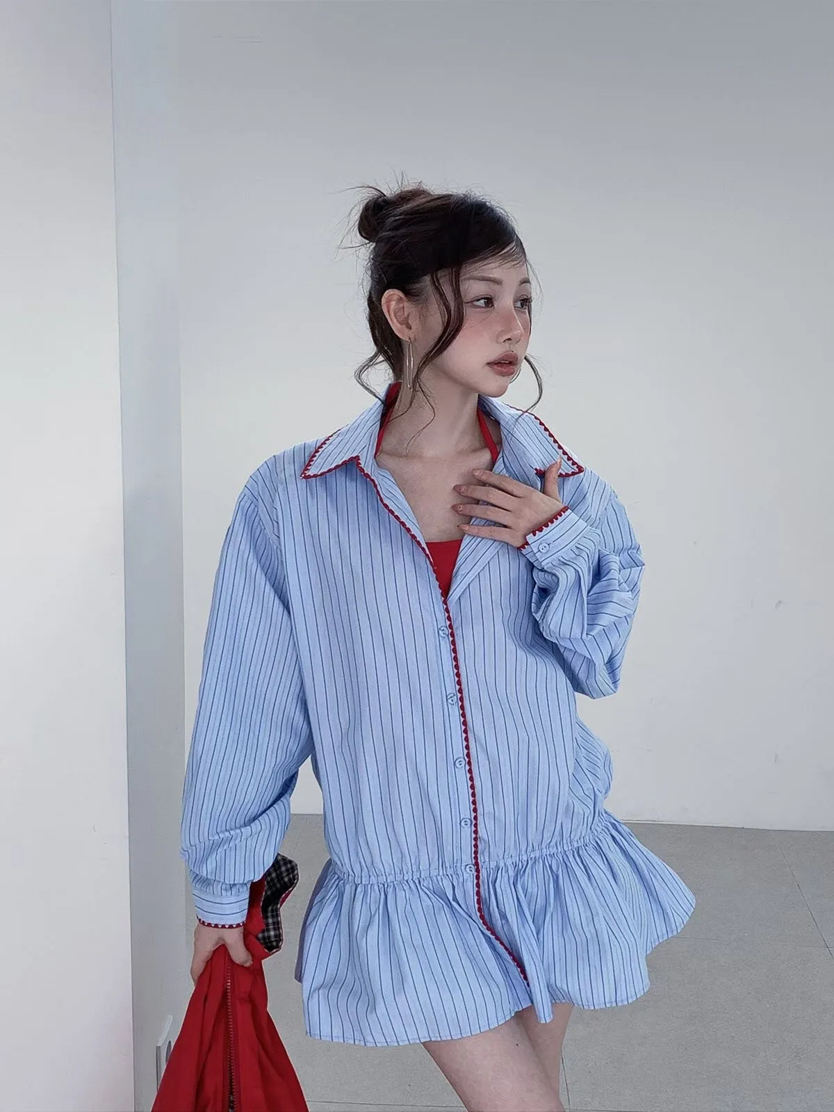 26DA05 條紋襯衫刺繡滾邊鬆緊上衣裙 2色