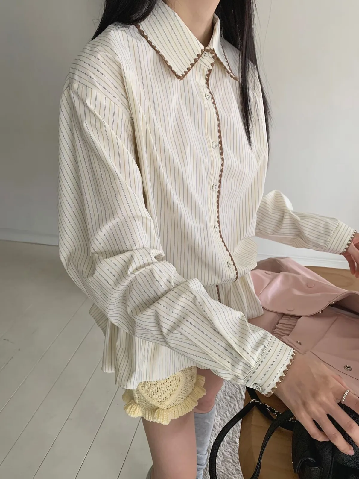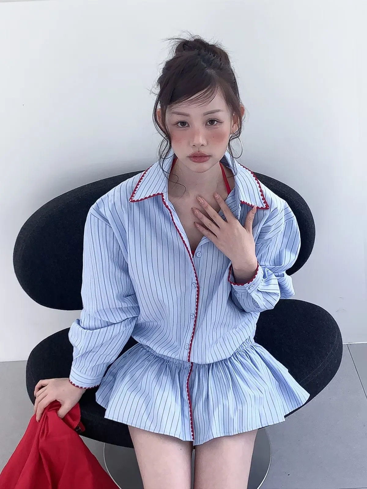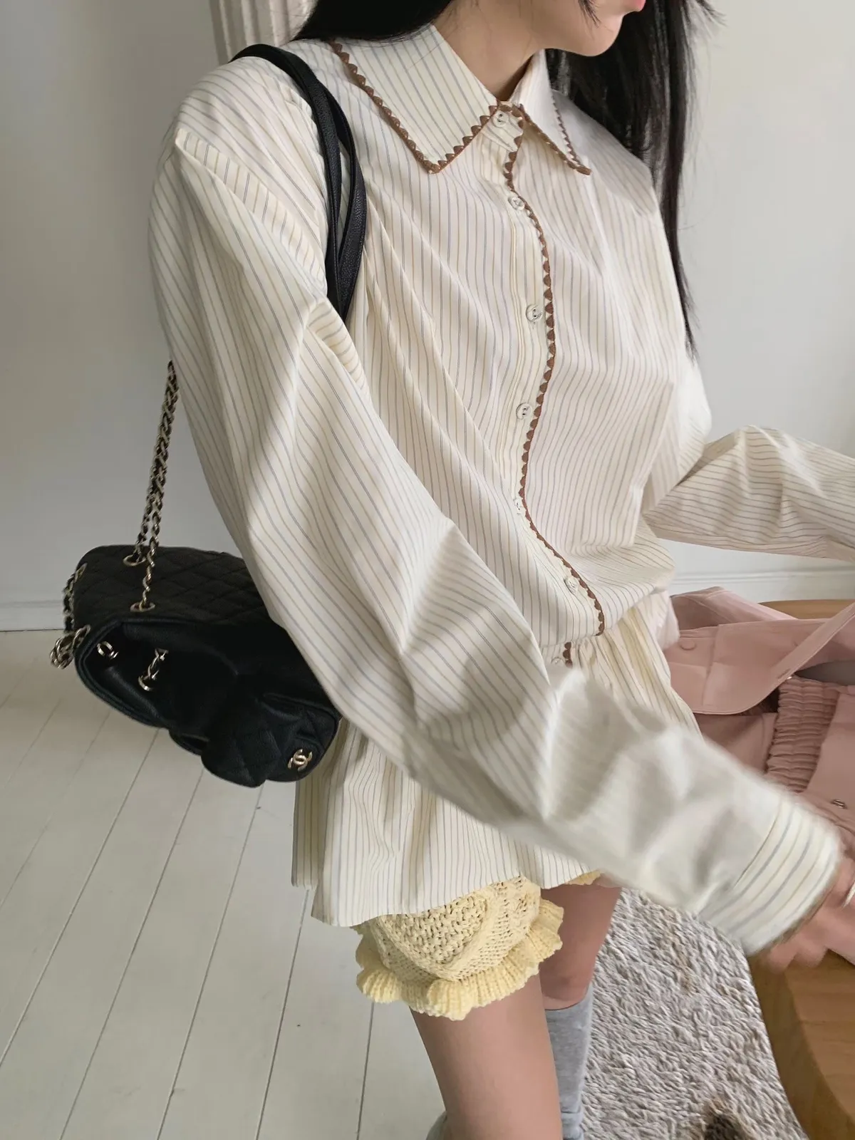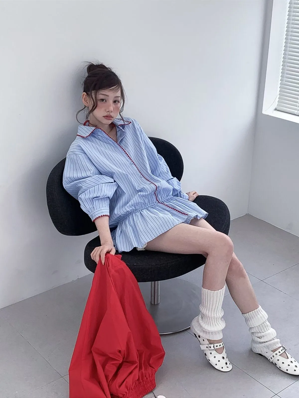 26DA05 條紋襯衫刺繡滾邊鬆緊上衣裙 2色