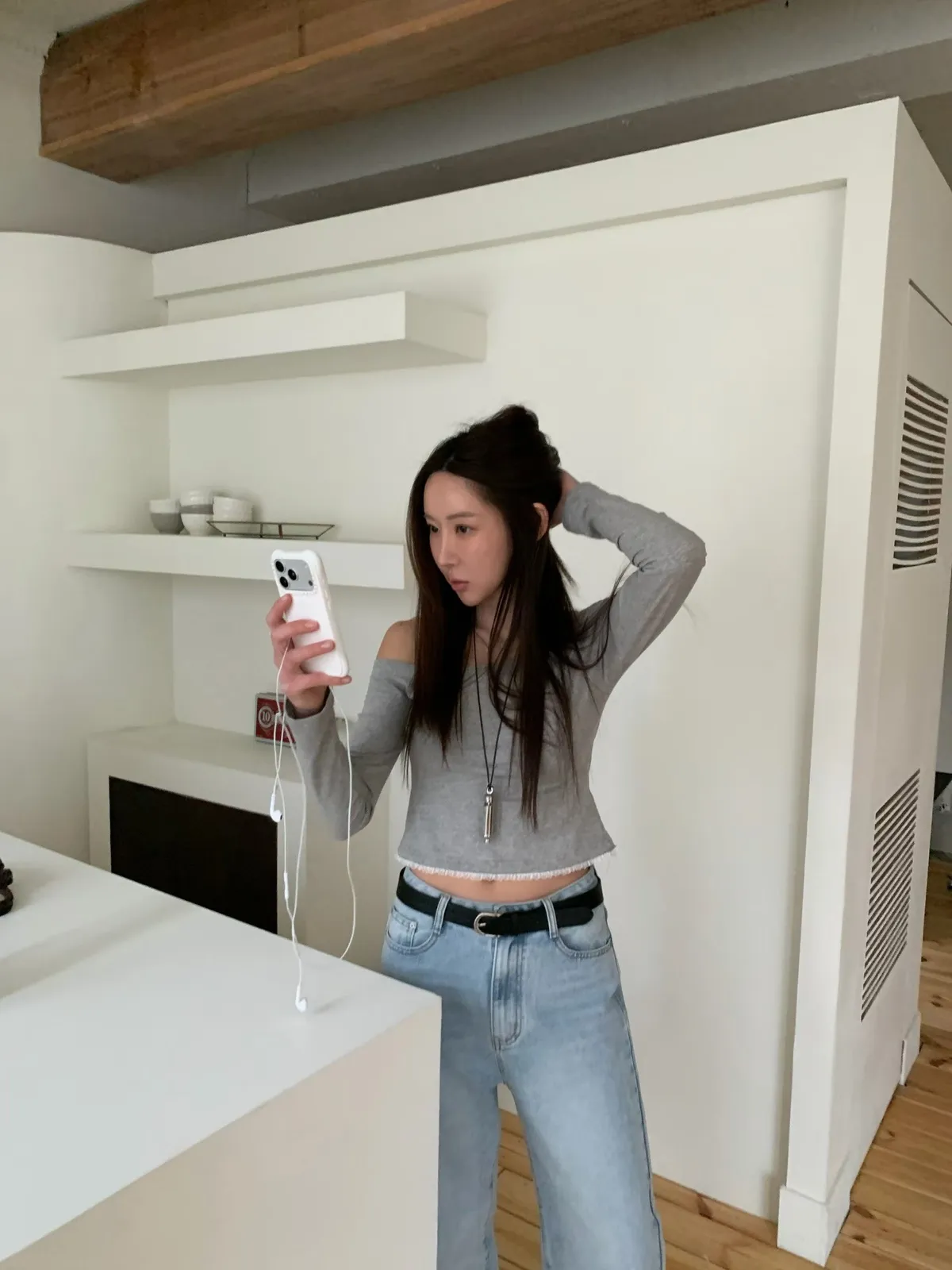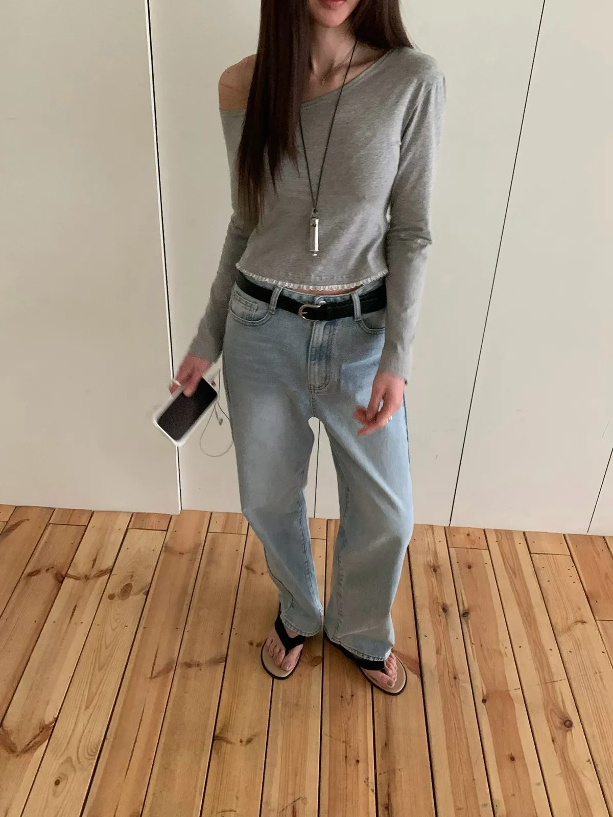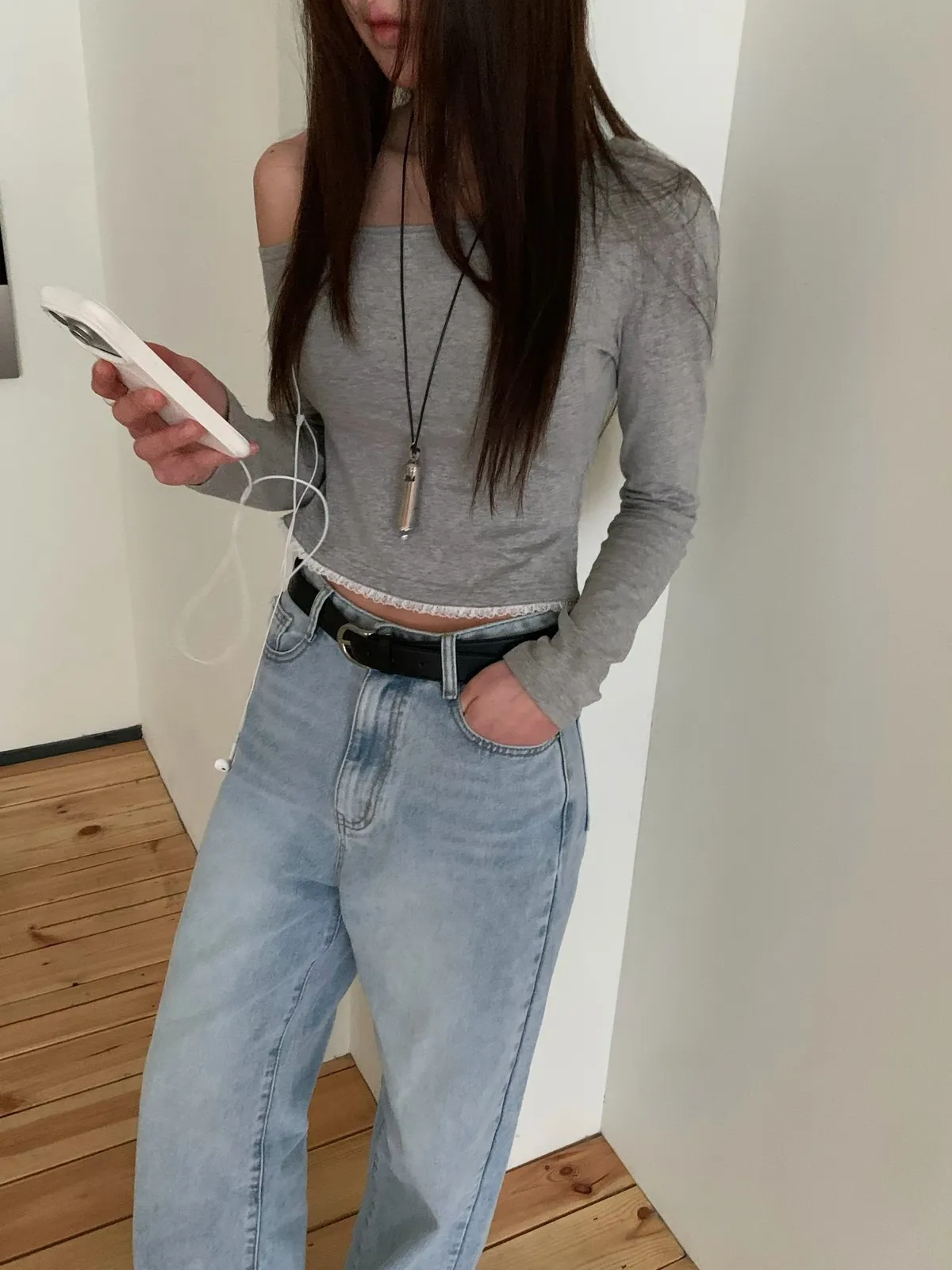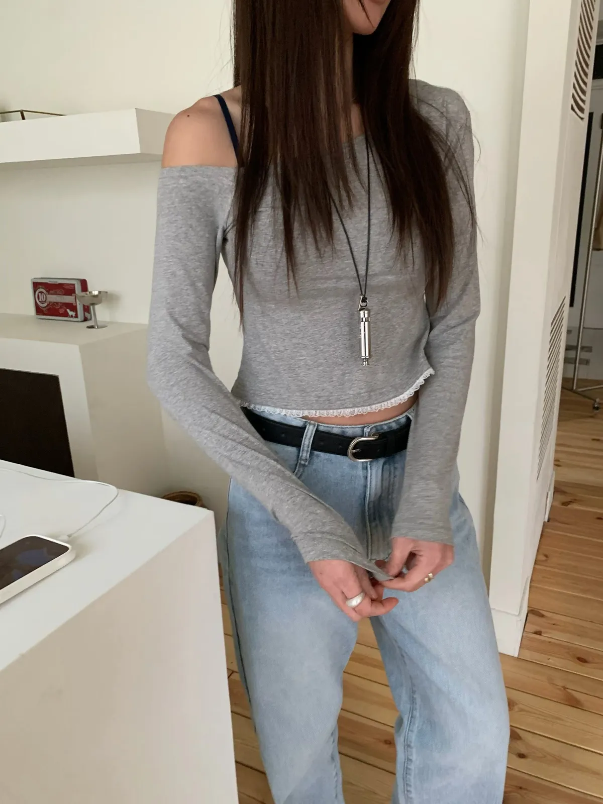 26DB01 斜肩拼蕾絲下擺長T 3色