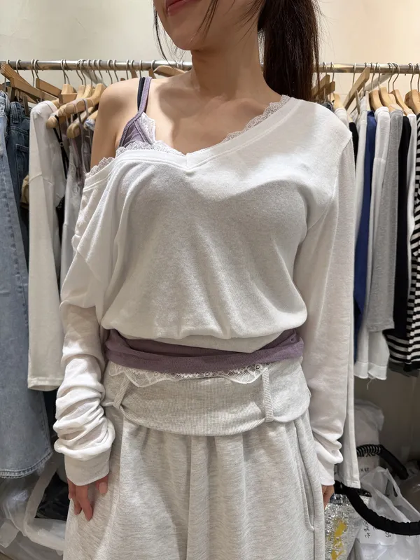 26DB24 V領軟針織棉拼蕾絲短版上衣 2色