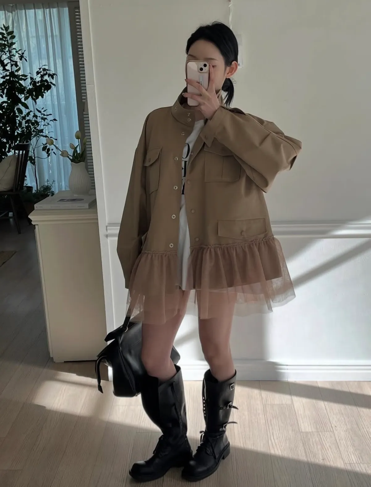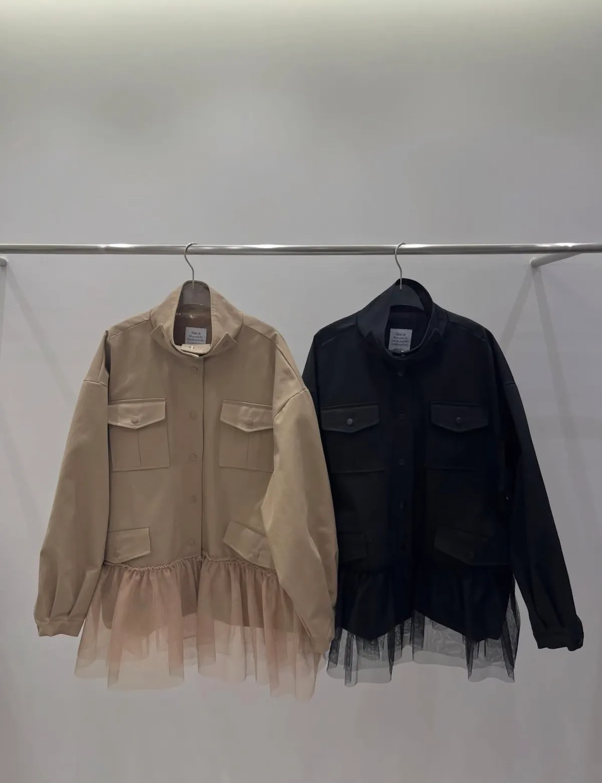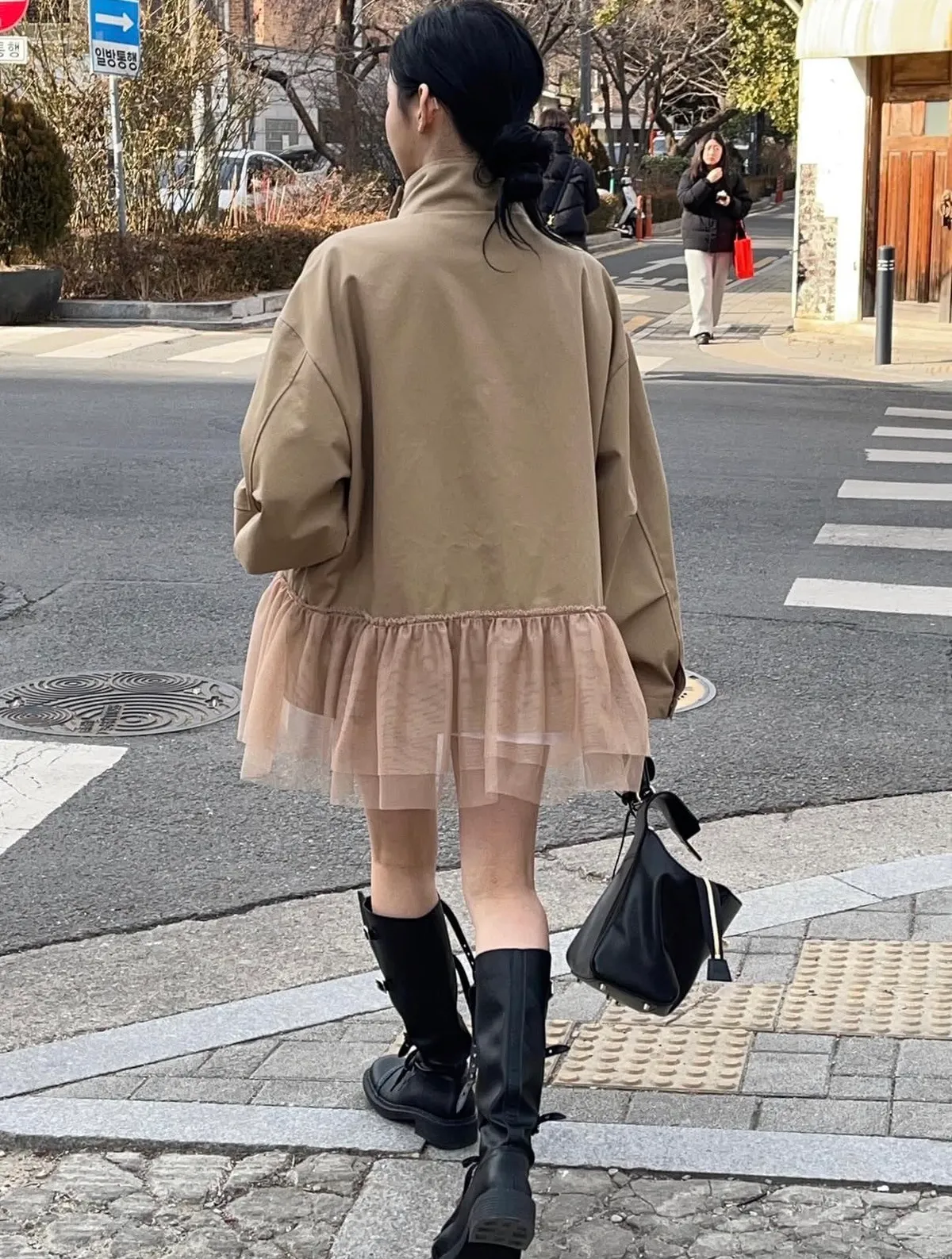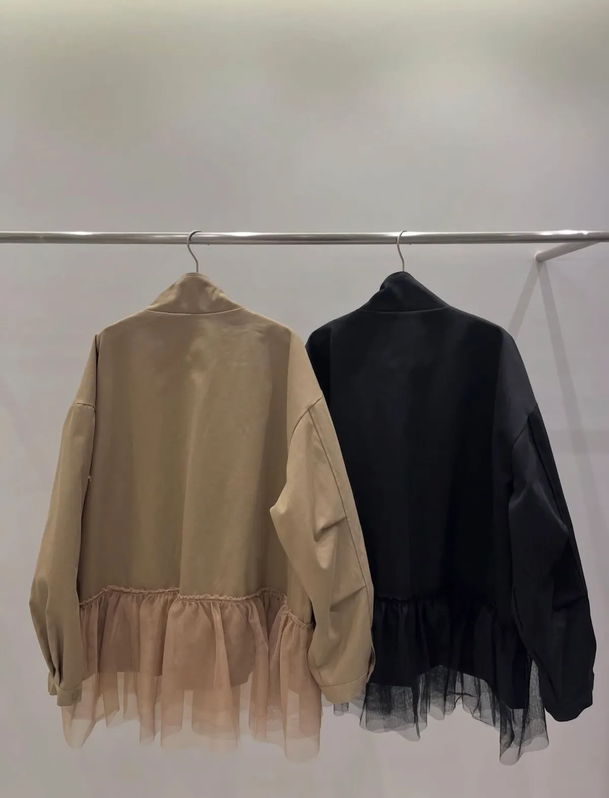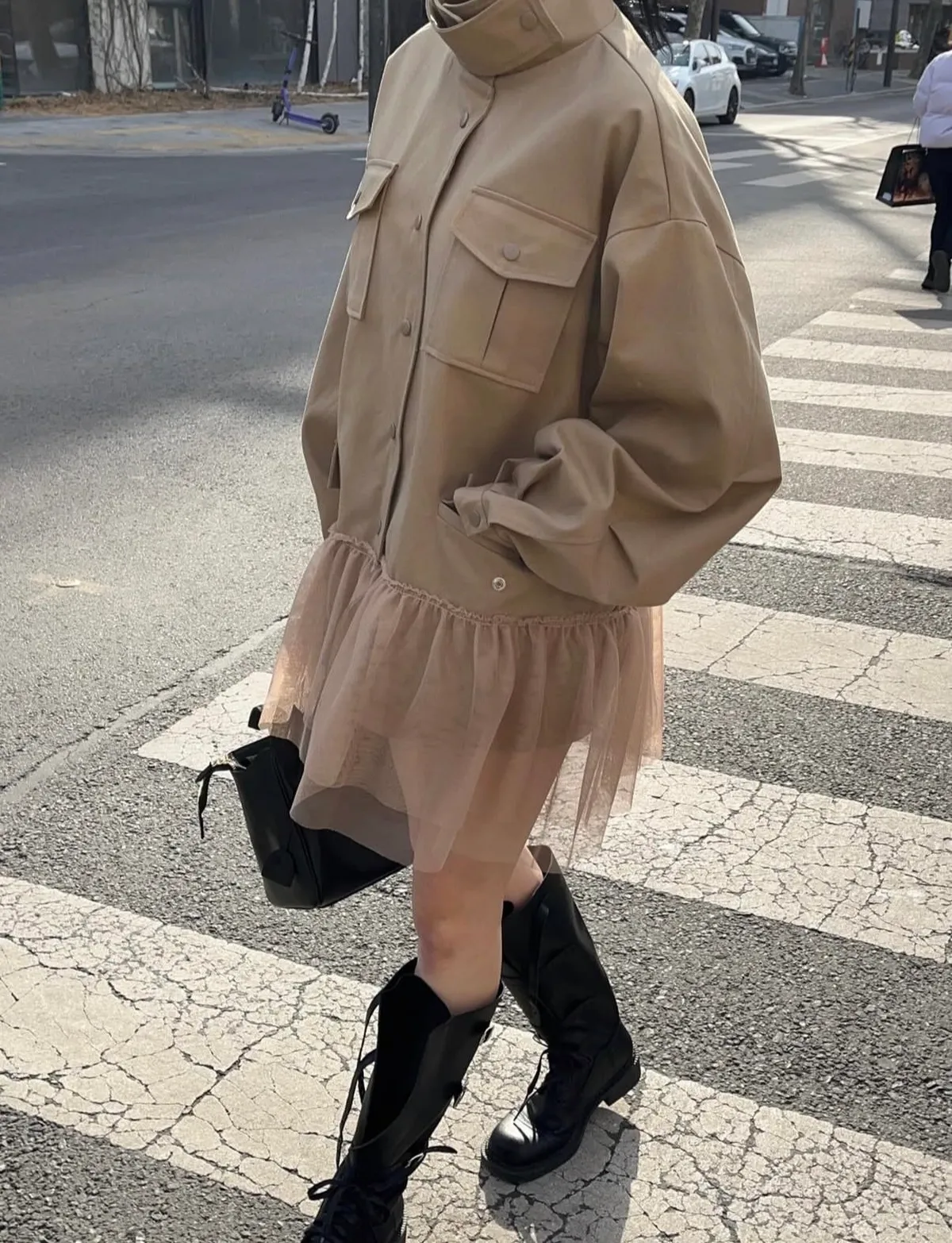 26DC20 下擺拼接紗裙立領薄斜紋外套/洋裝 2色