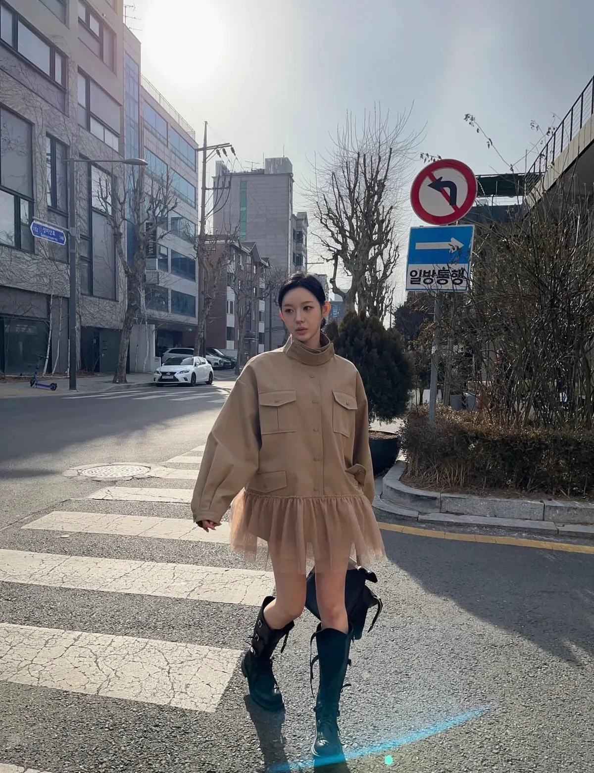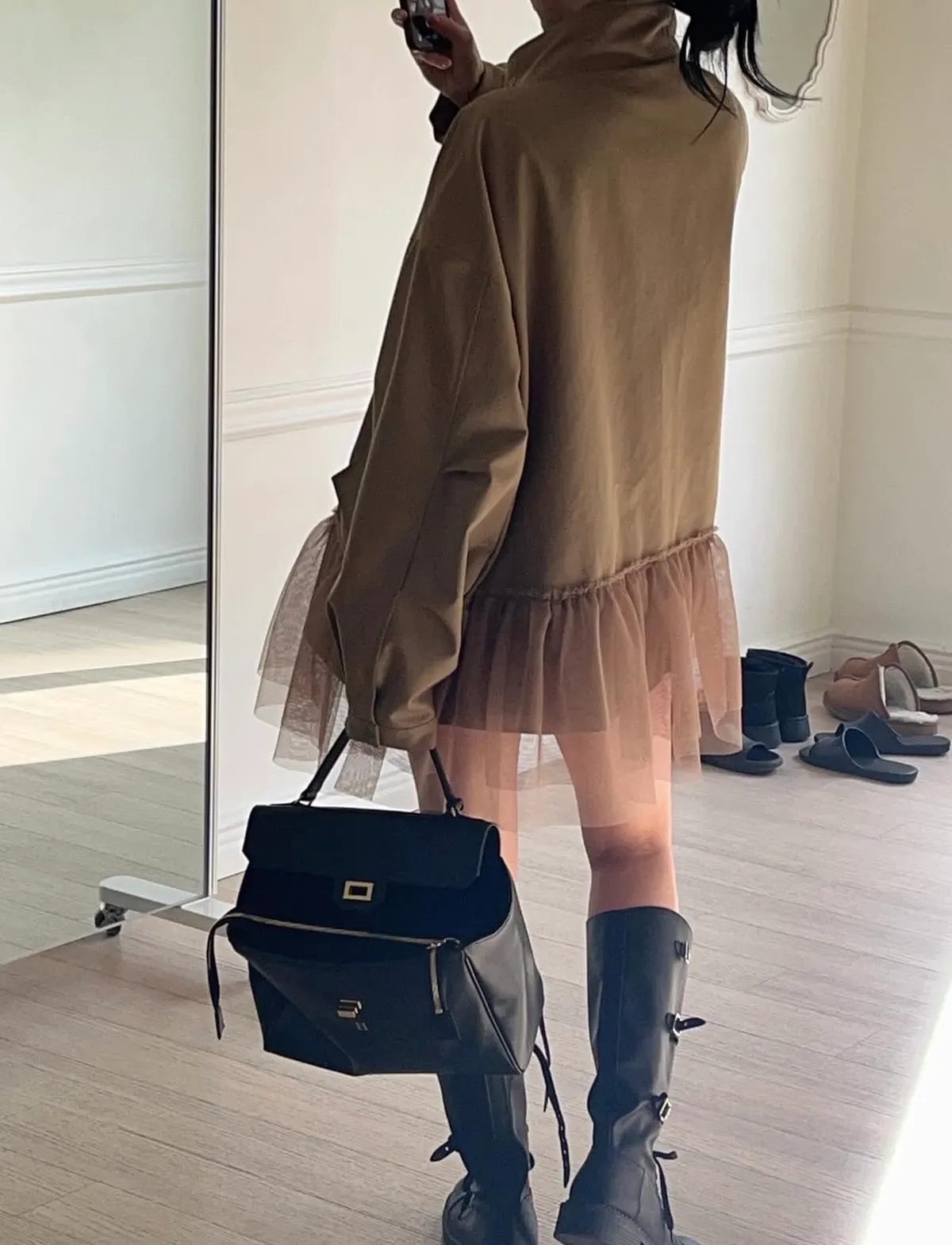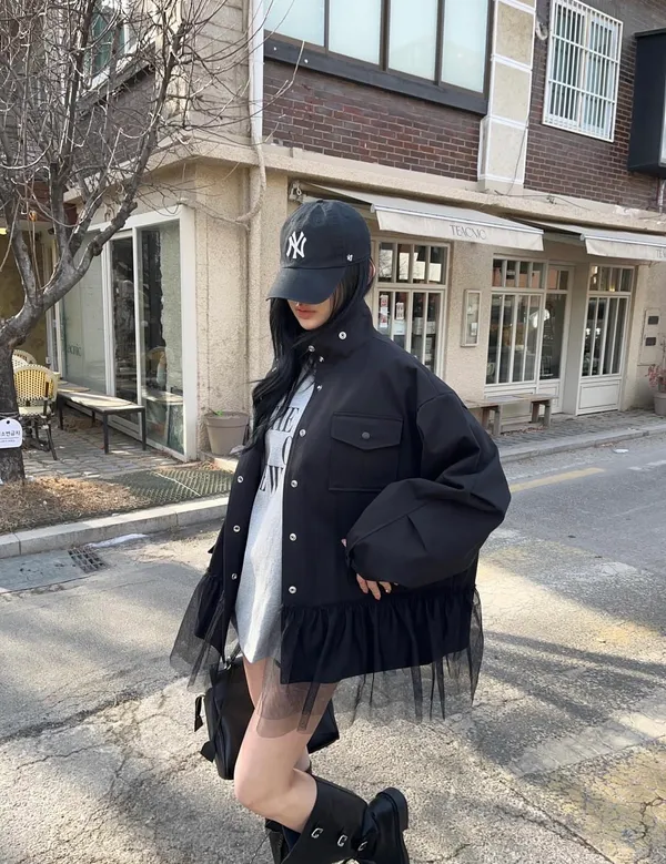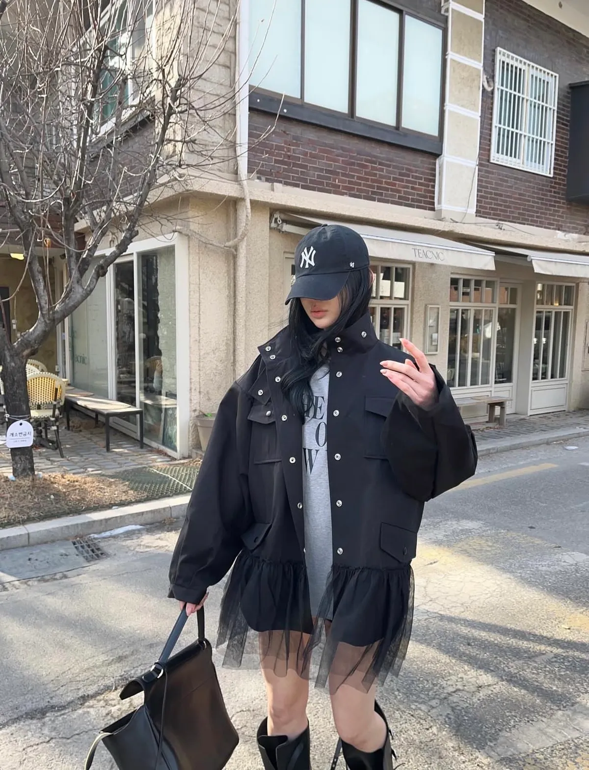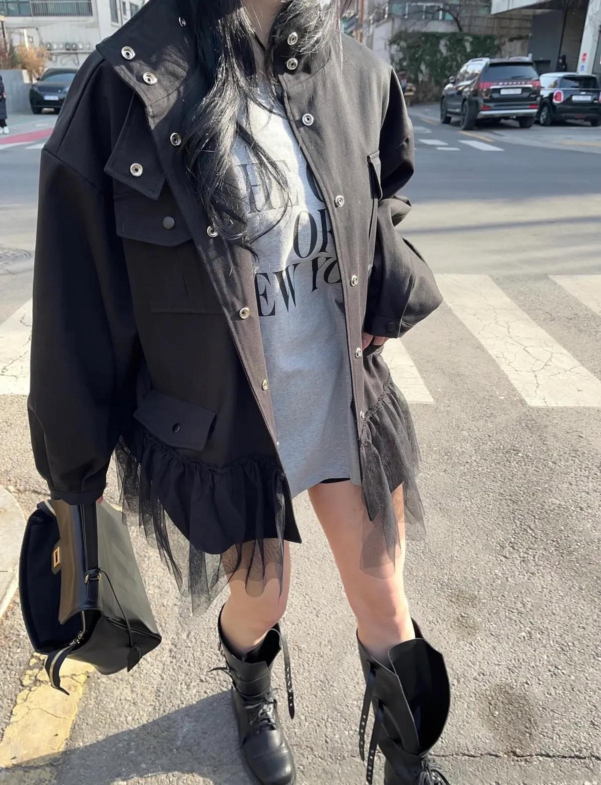 26DC20 下擺拼接紗裙立領薄斜紋外套/洋裝 2色