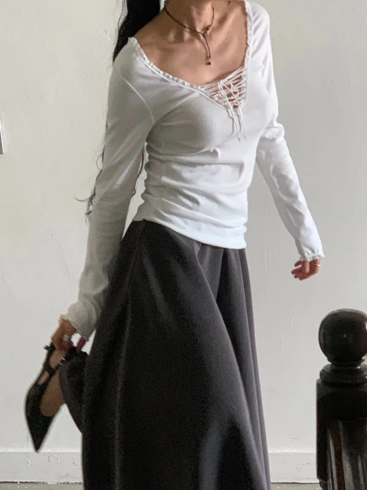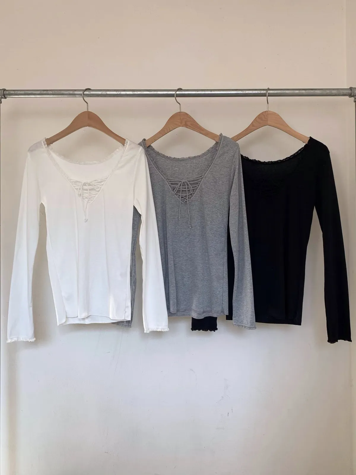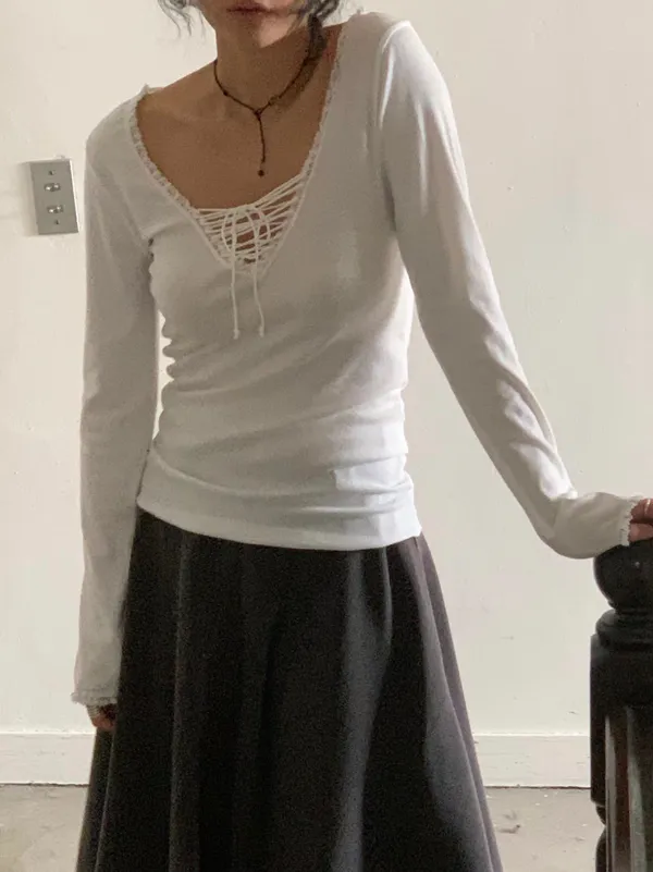 26DE13 綁繩V領花邊長T 3色