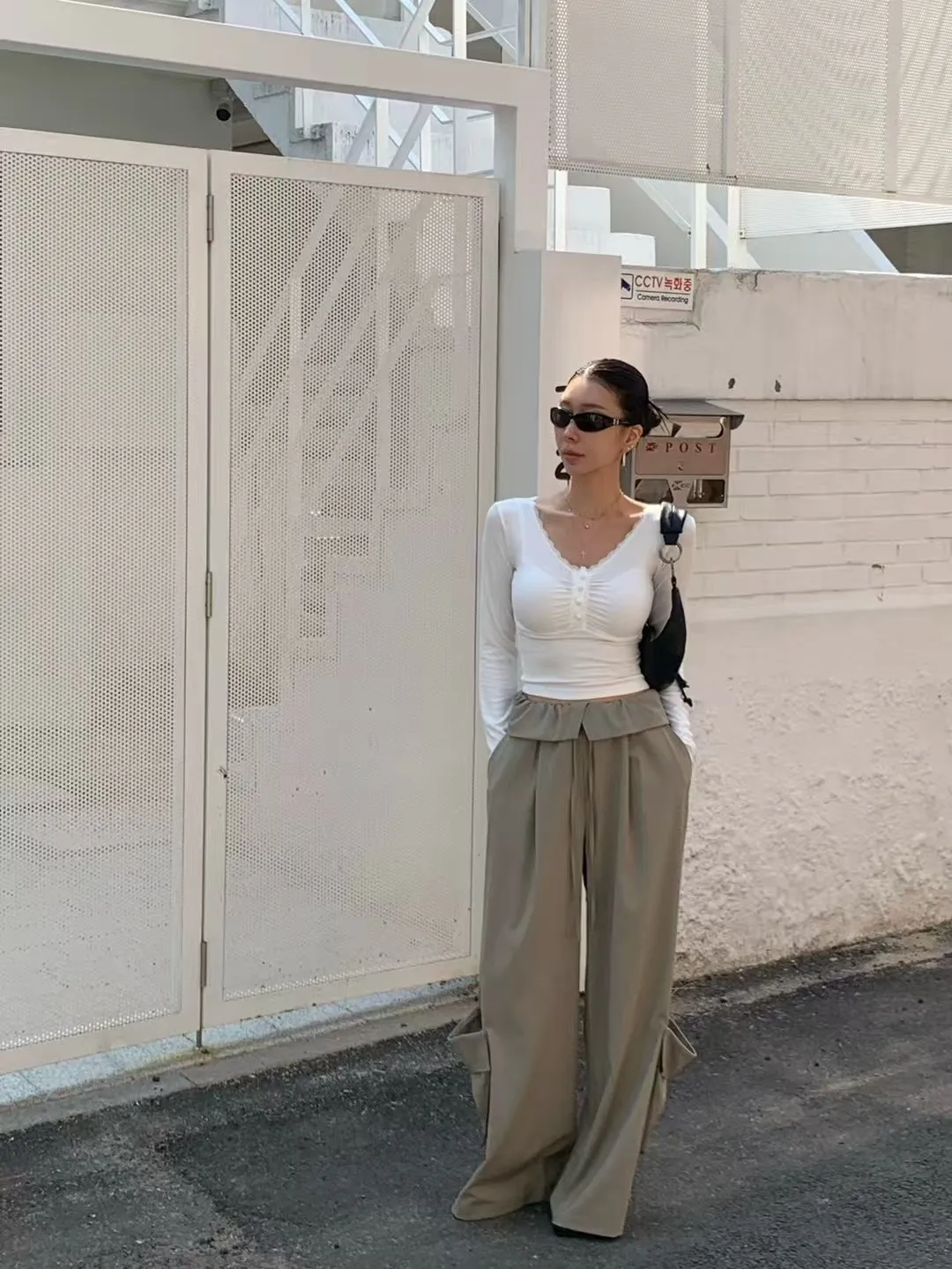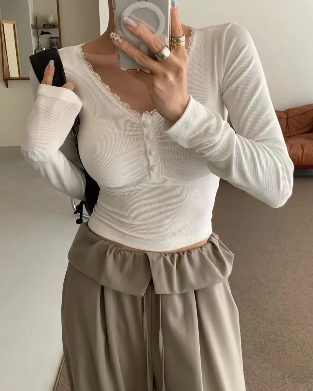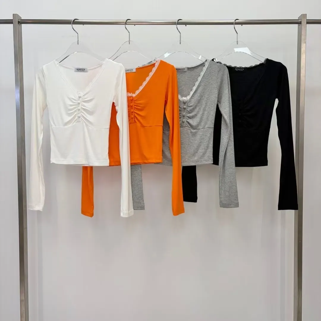 26DG09 V領蕾絲花邊抓皺合身上衣 4色