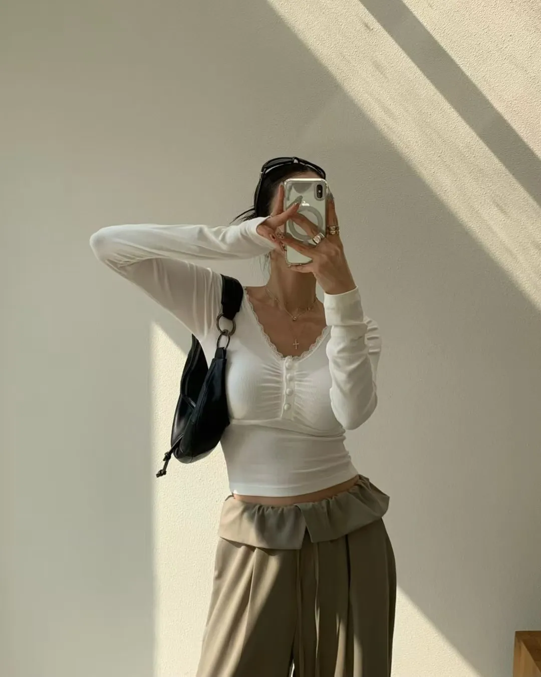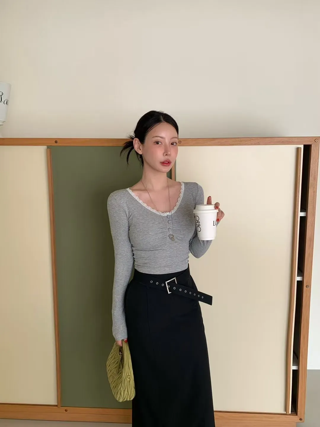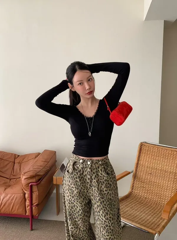 26DG09 V領蕾絲花邊抓皺合身上衣 4色
