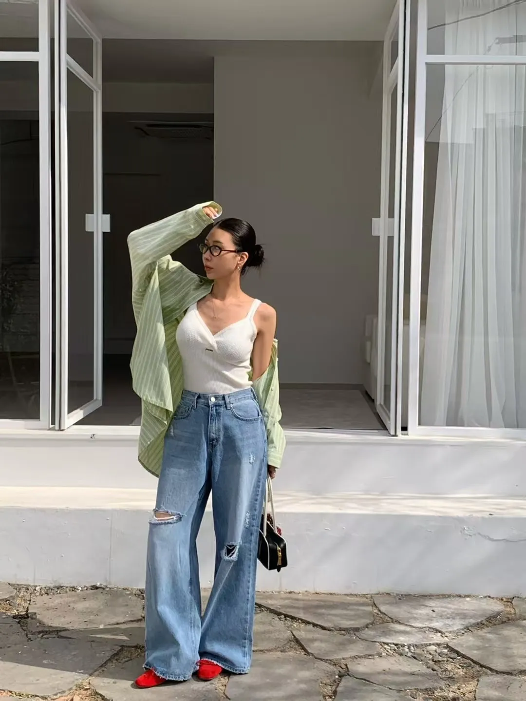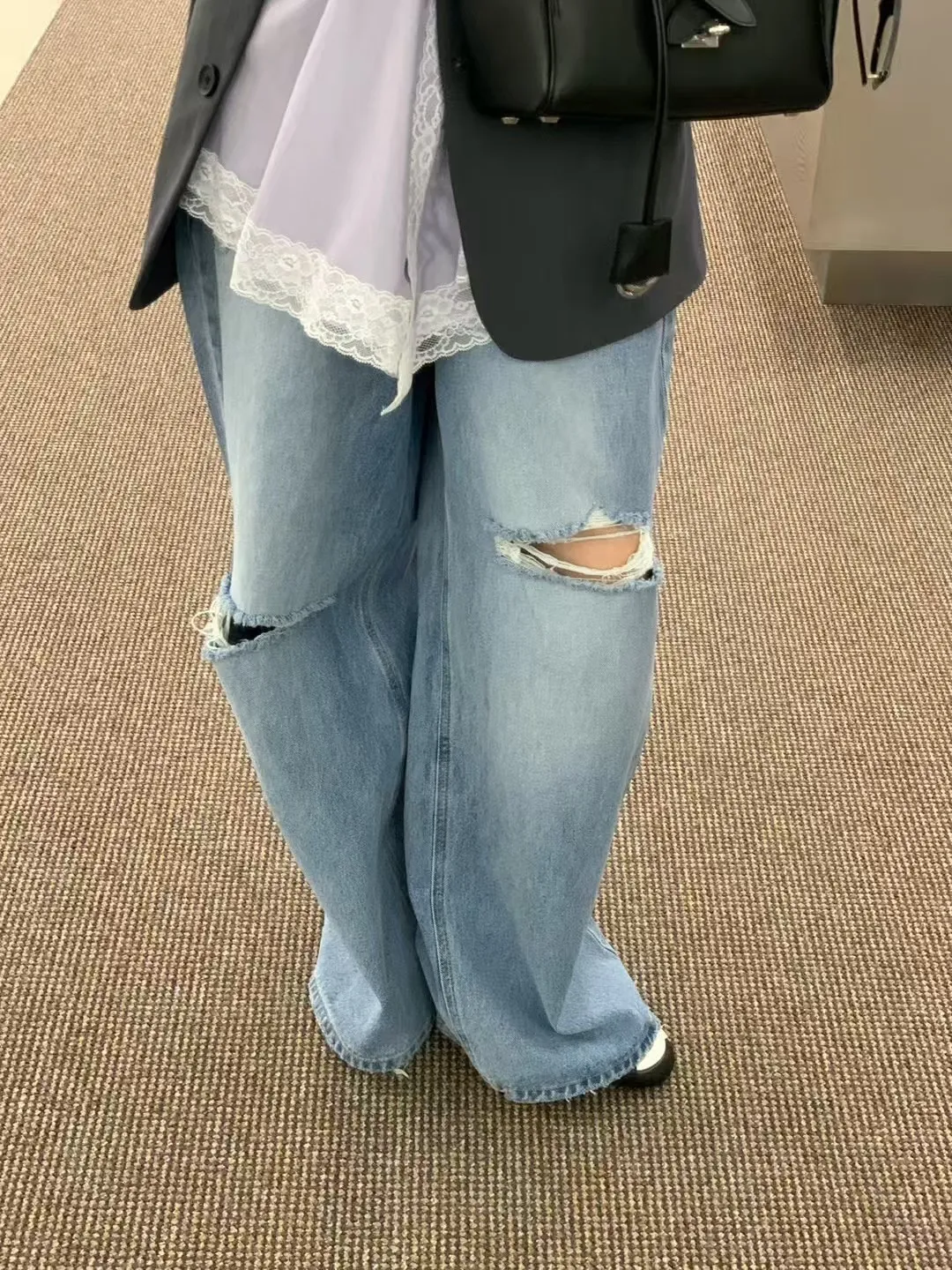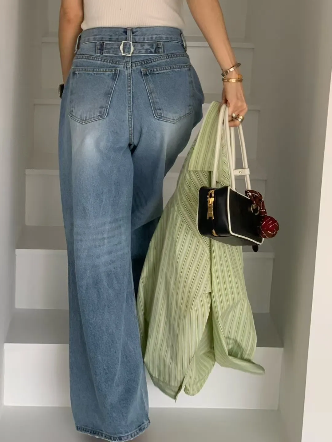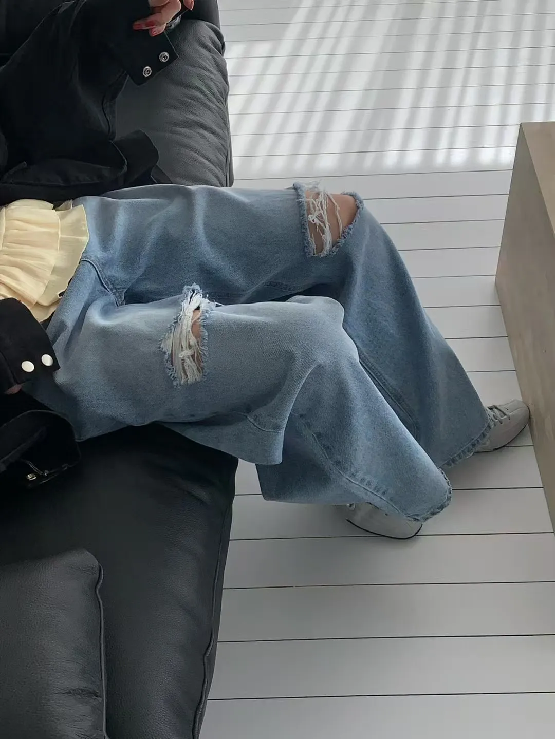 26DG21 破膝後臀扣中腰牛仔長褲 SML