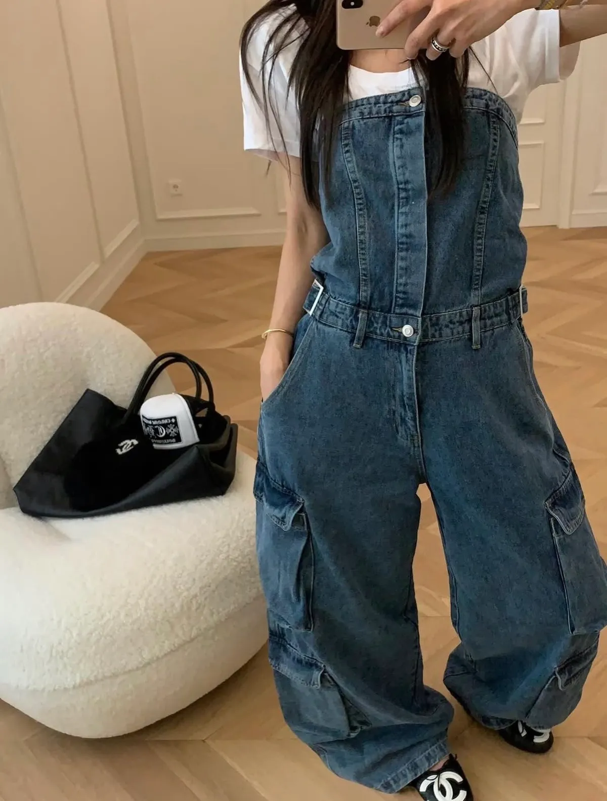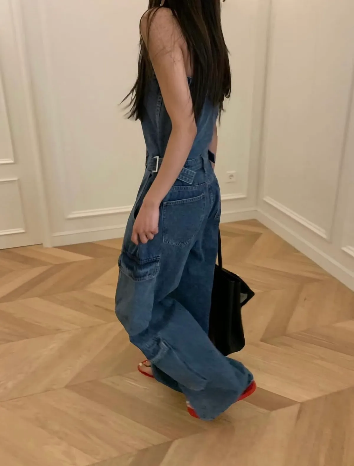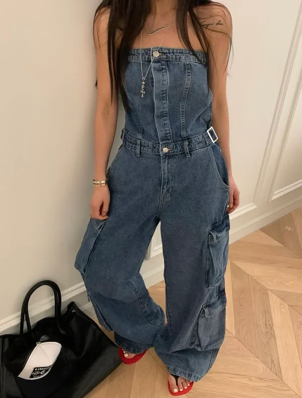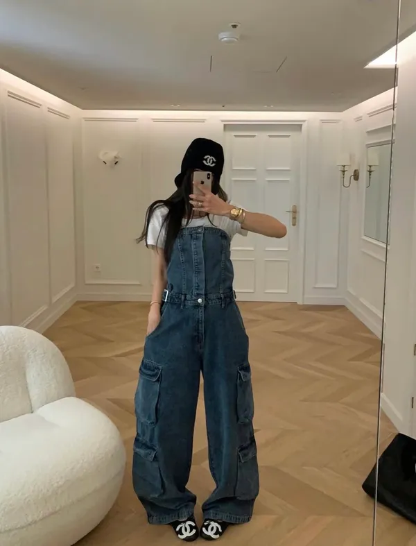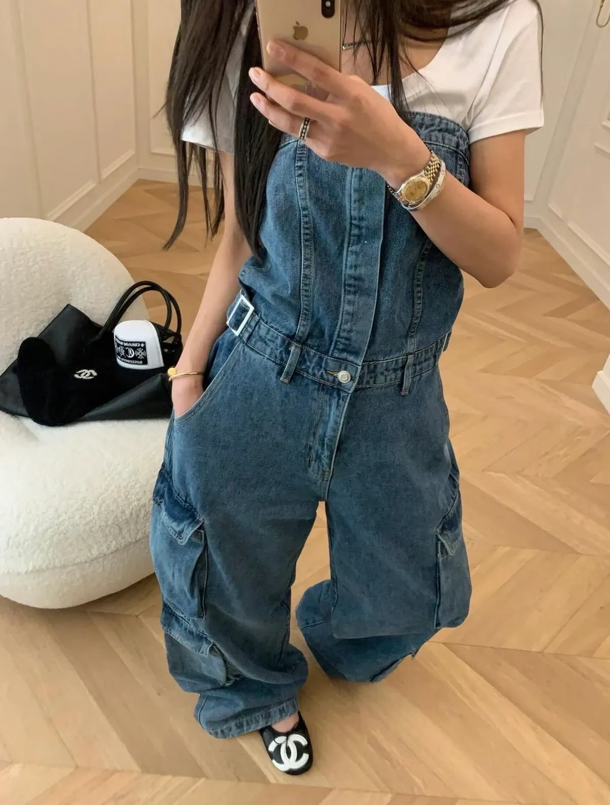 26DI32 平口連身收腰扣斜紋牛仔長褲 2色 SM
