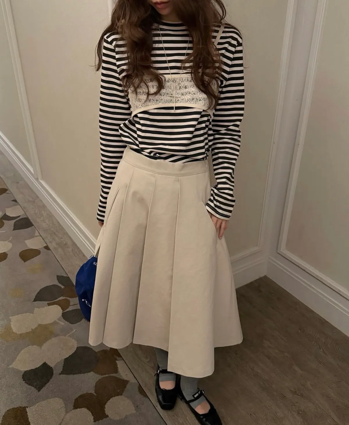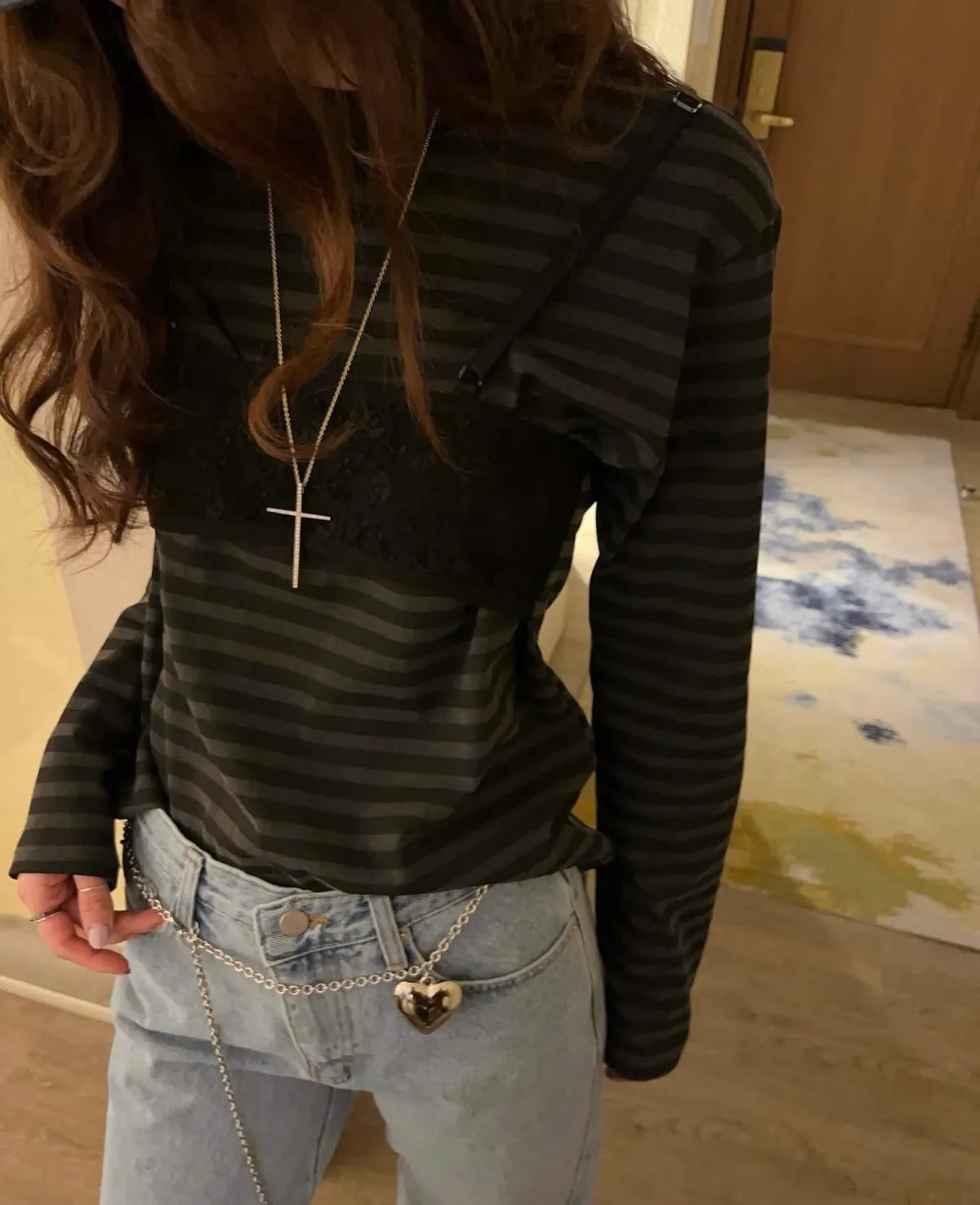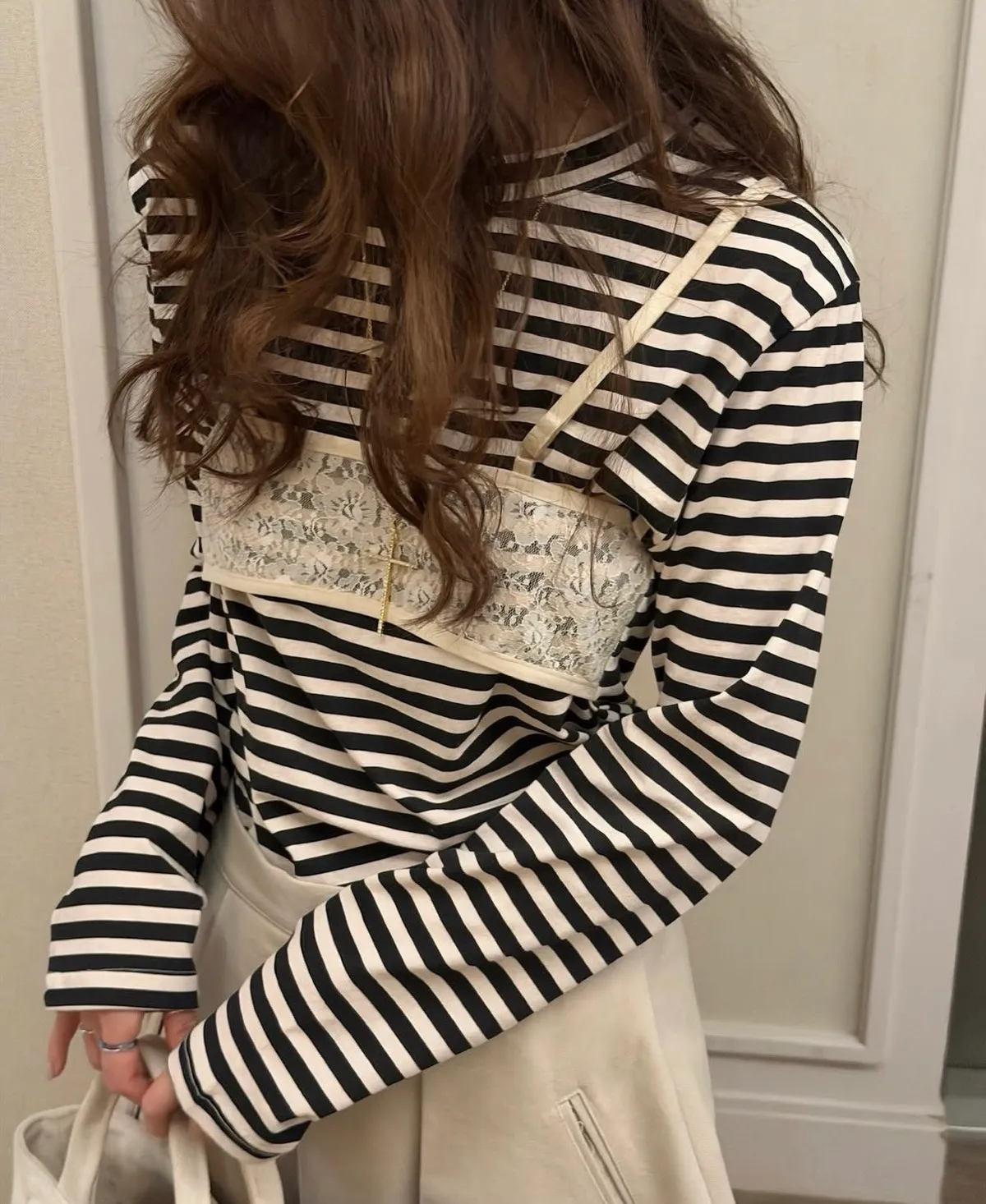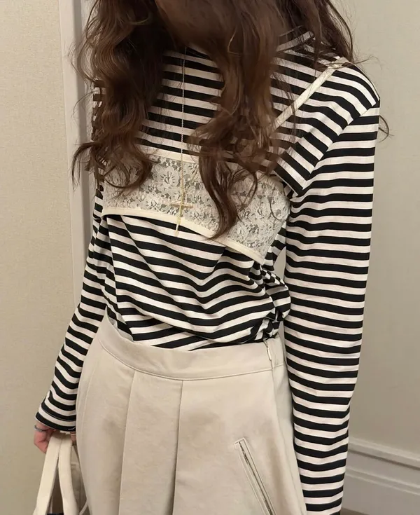 26DJ08 假兩蕾絲背心條紋長T 2色