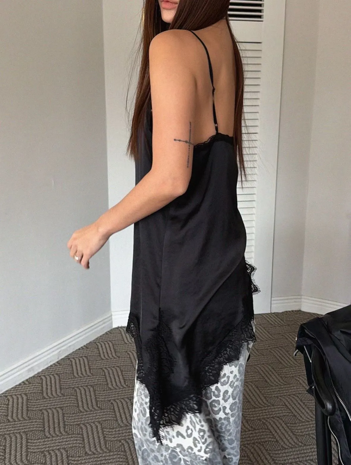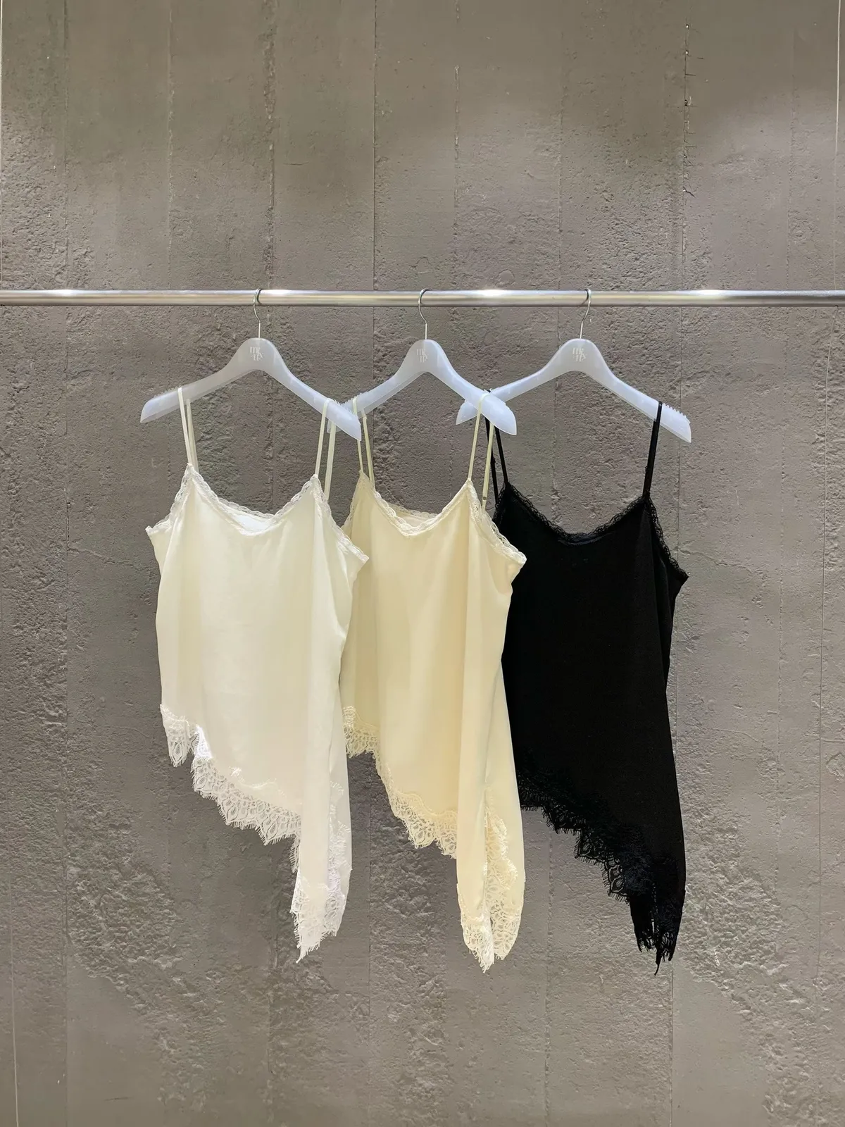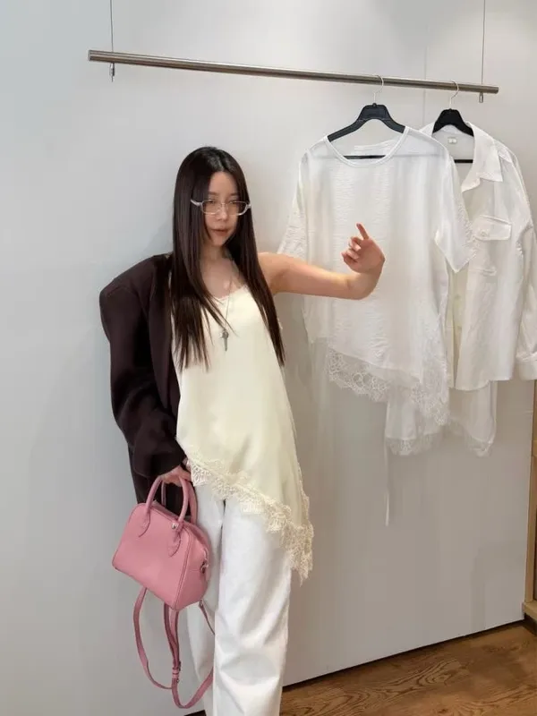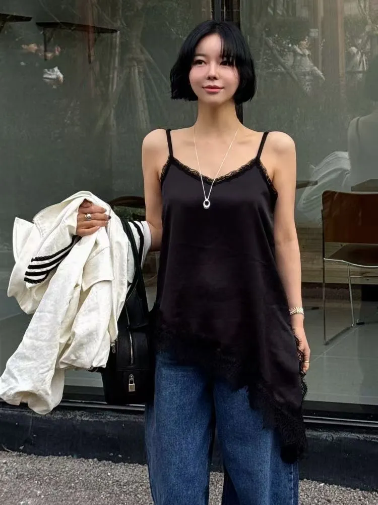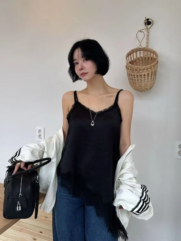 26DS07 斜邊開岔拚蕾絲緞面背心 3色
