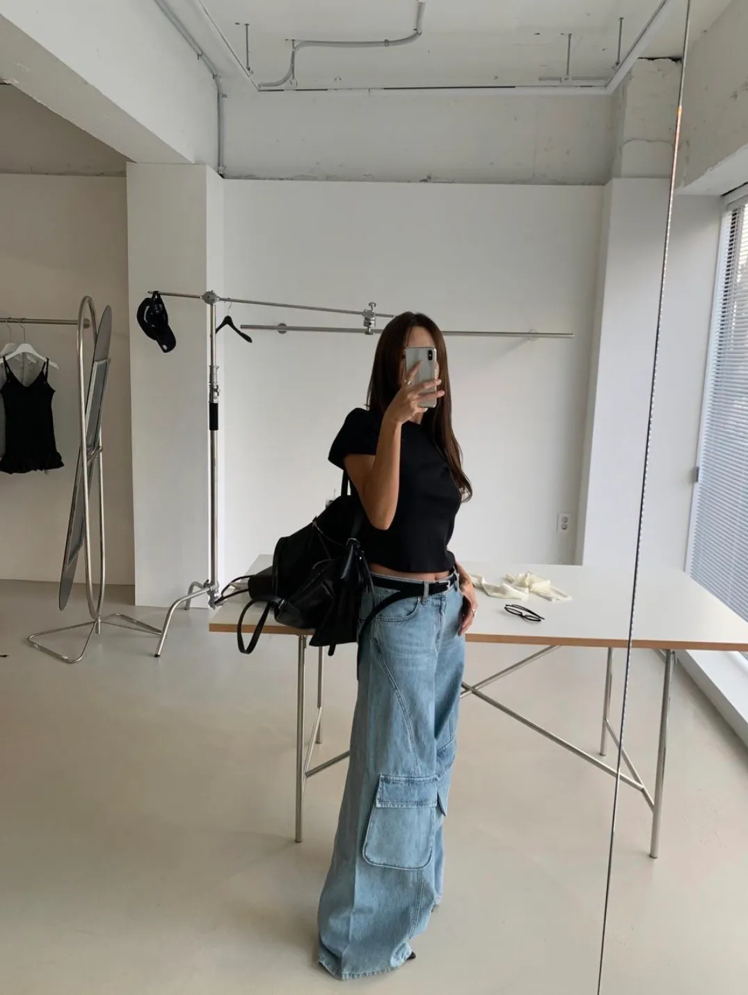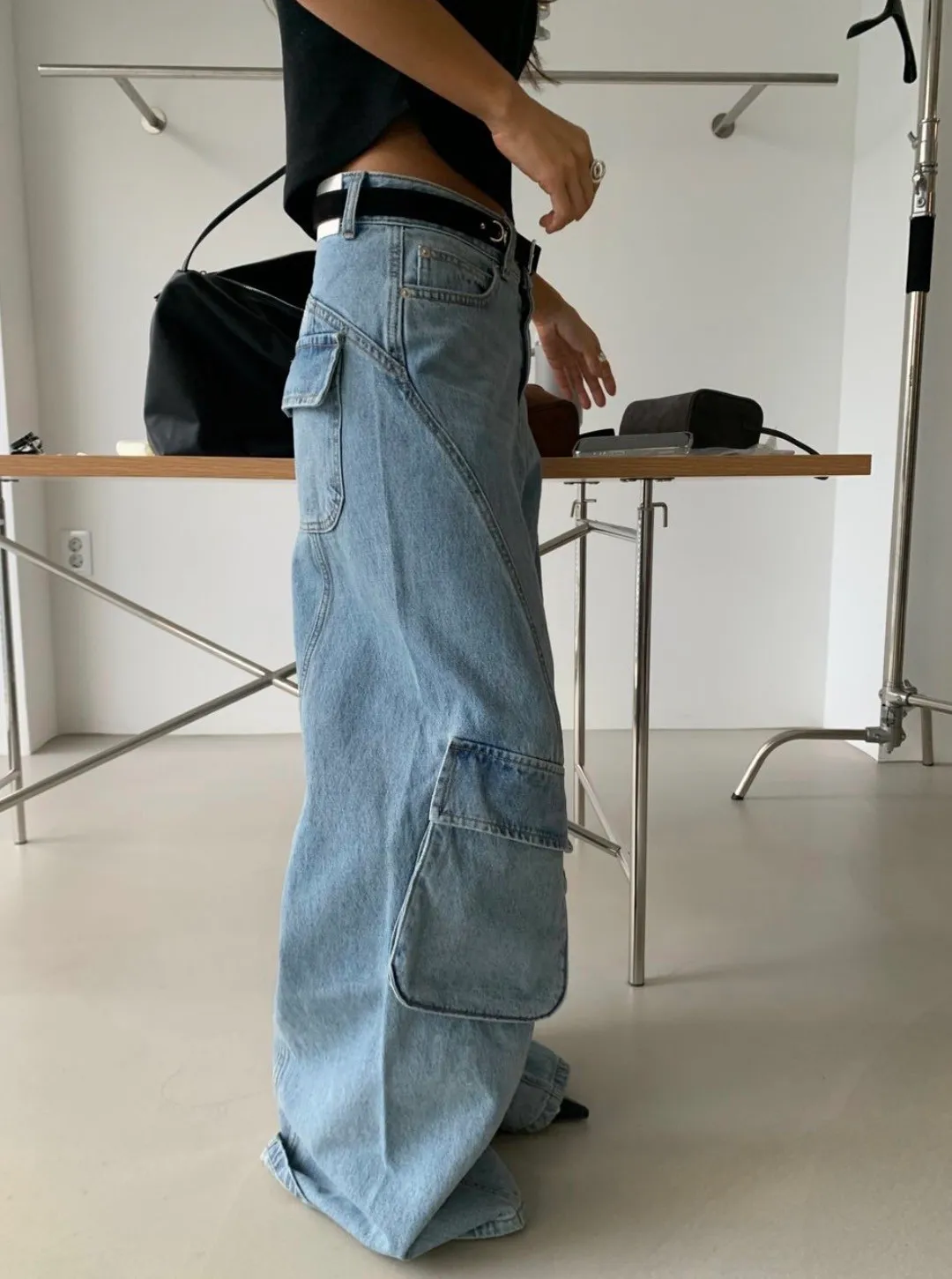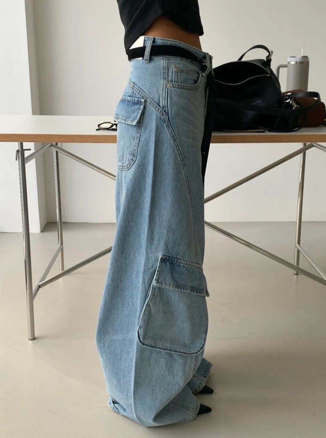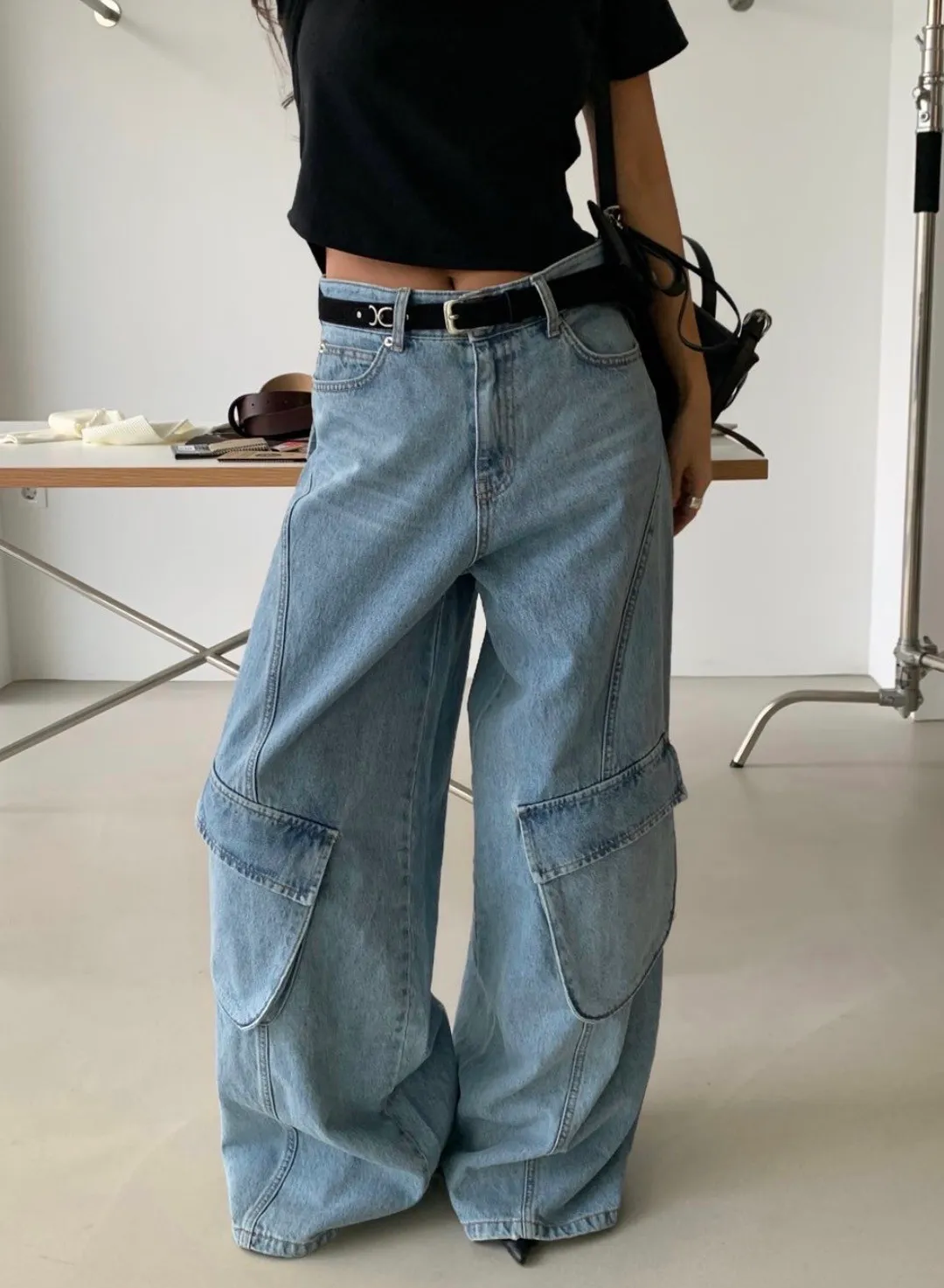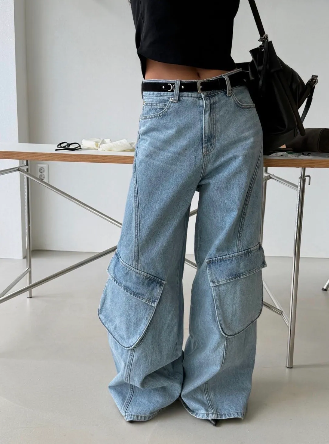 26DS18 斜工裝口袋寬管牛仔長褲 SM