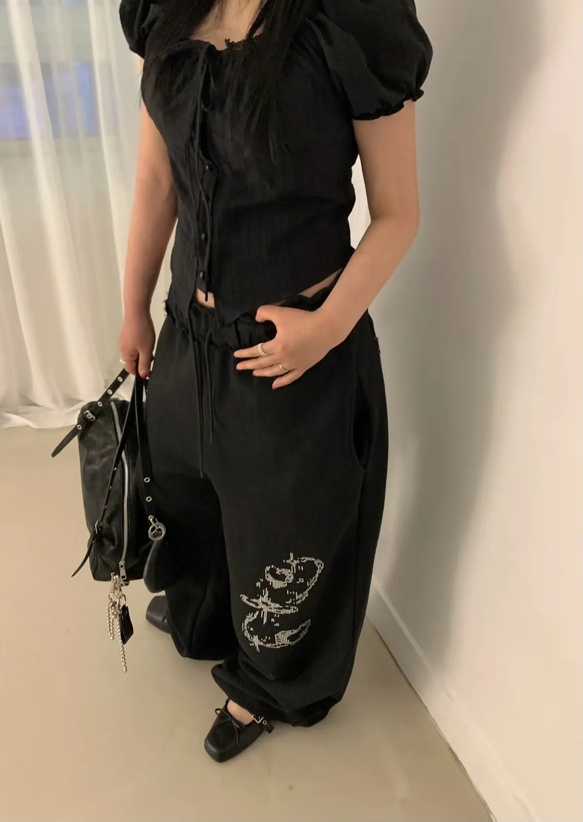 26DS26 排扣綁帶布蕾短袖上衣 2色