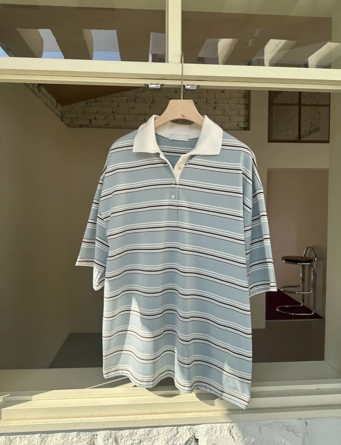 26DS51 粉藍橫條紋polo中長版上衣