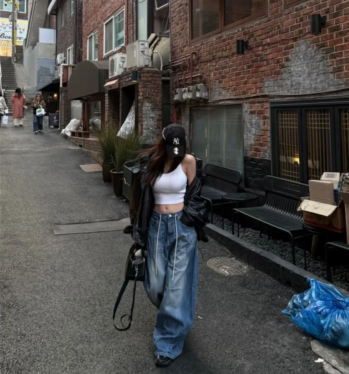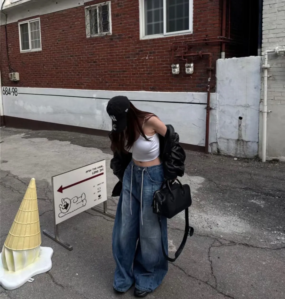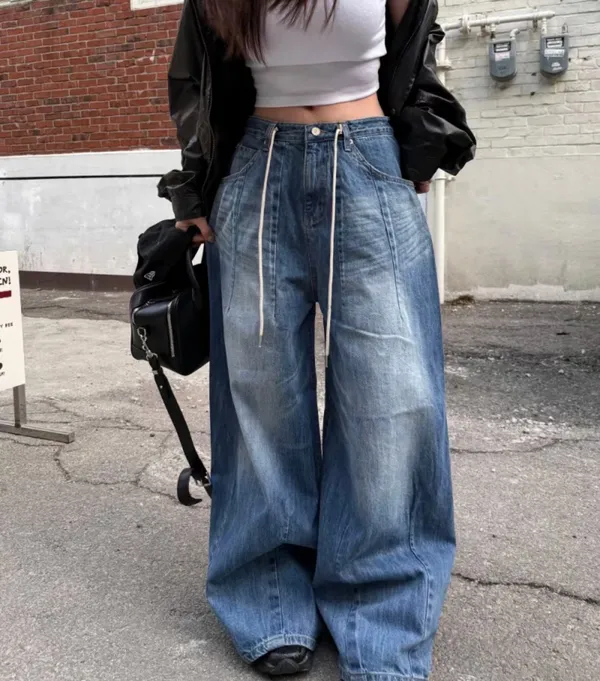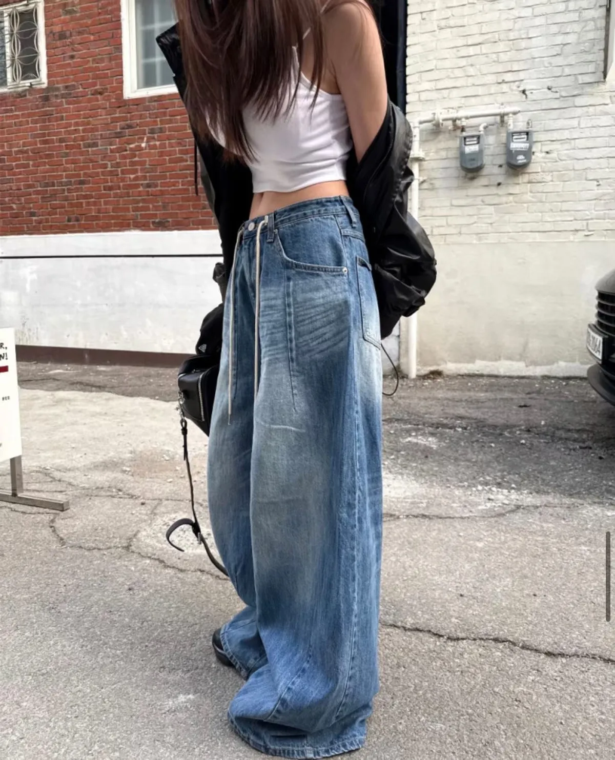 26EA09 腰快調繩打褶縫線彎彎牛仔長褲 SML