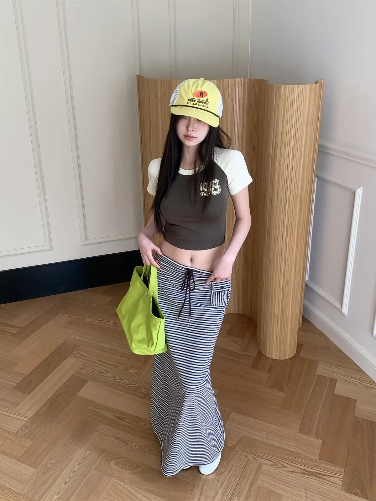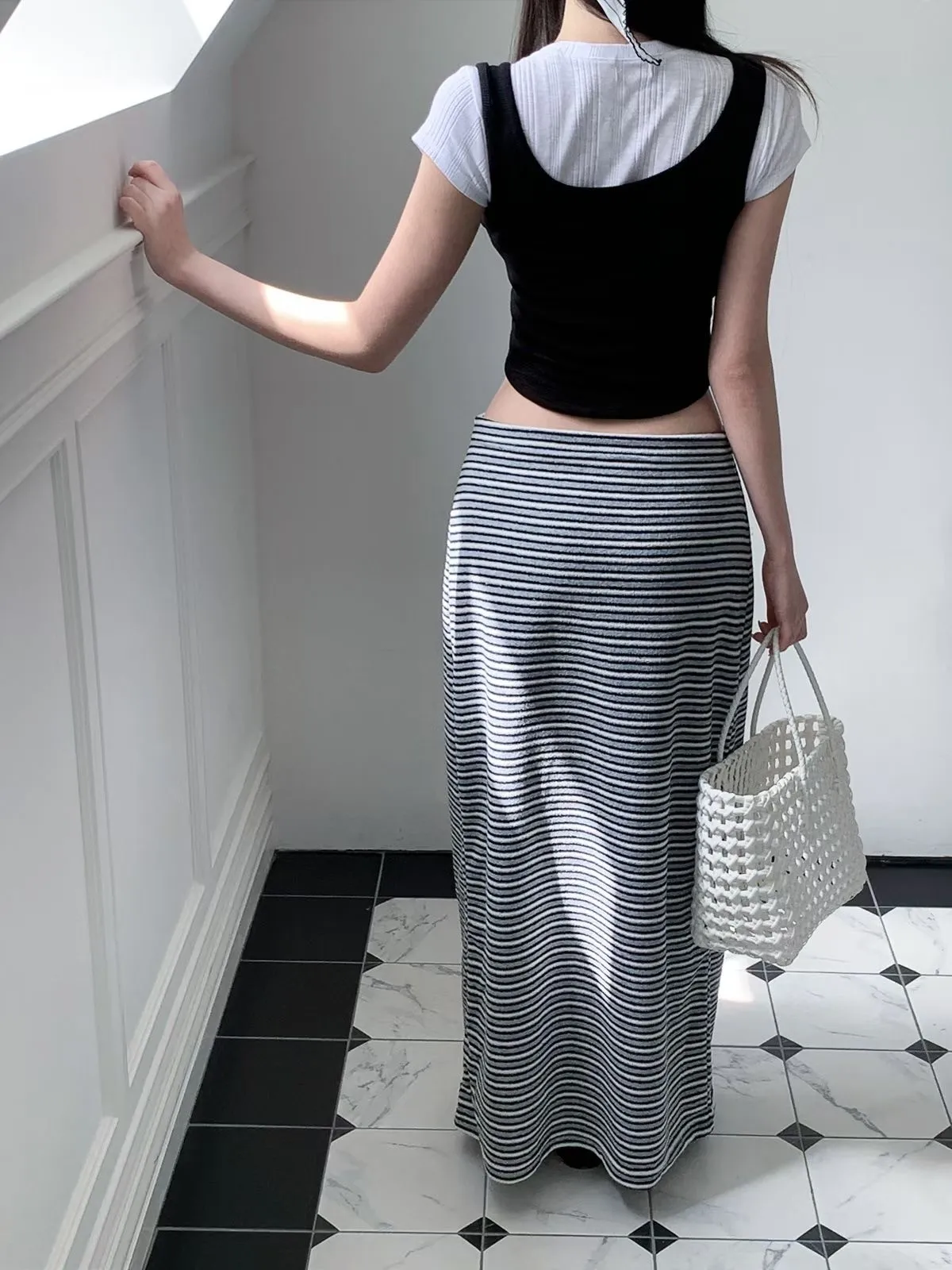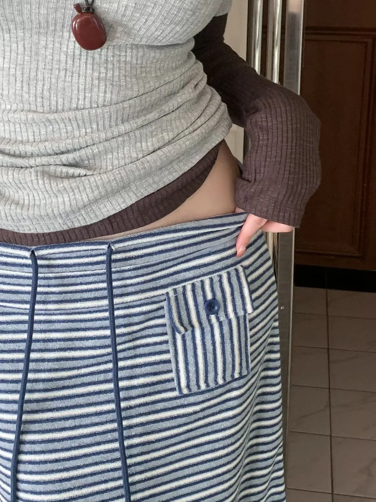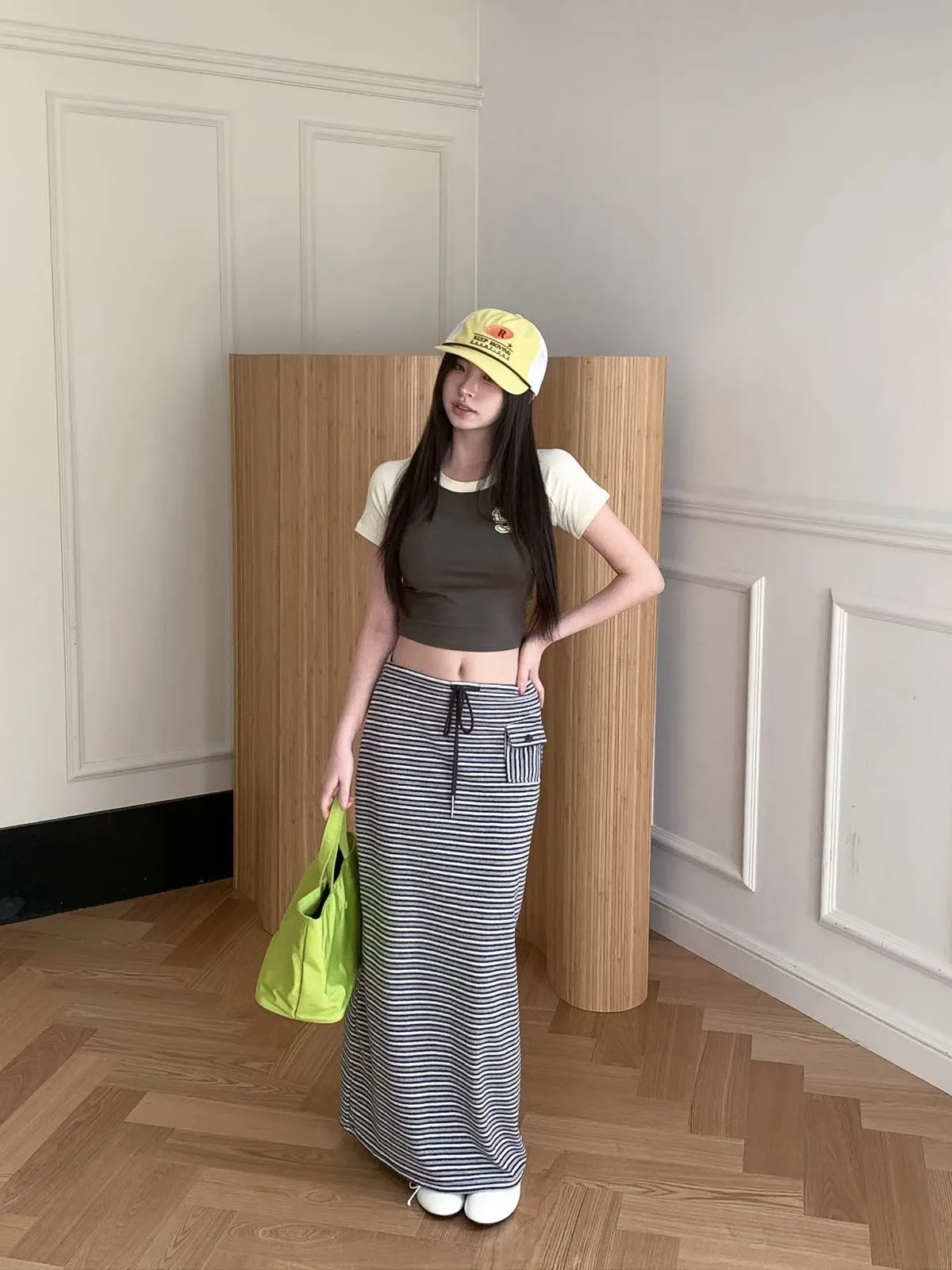 26EB02 翻毛巾條紋長裙 3色