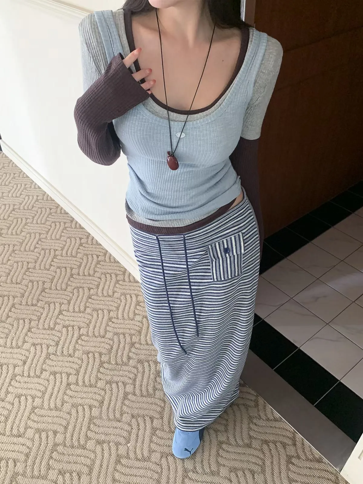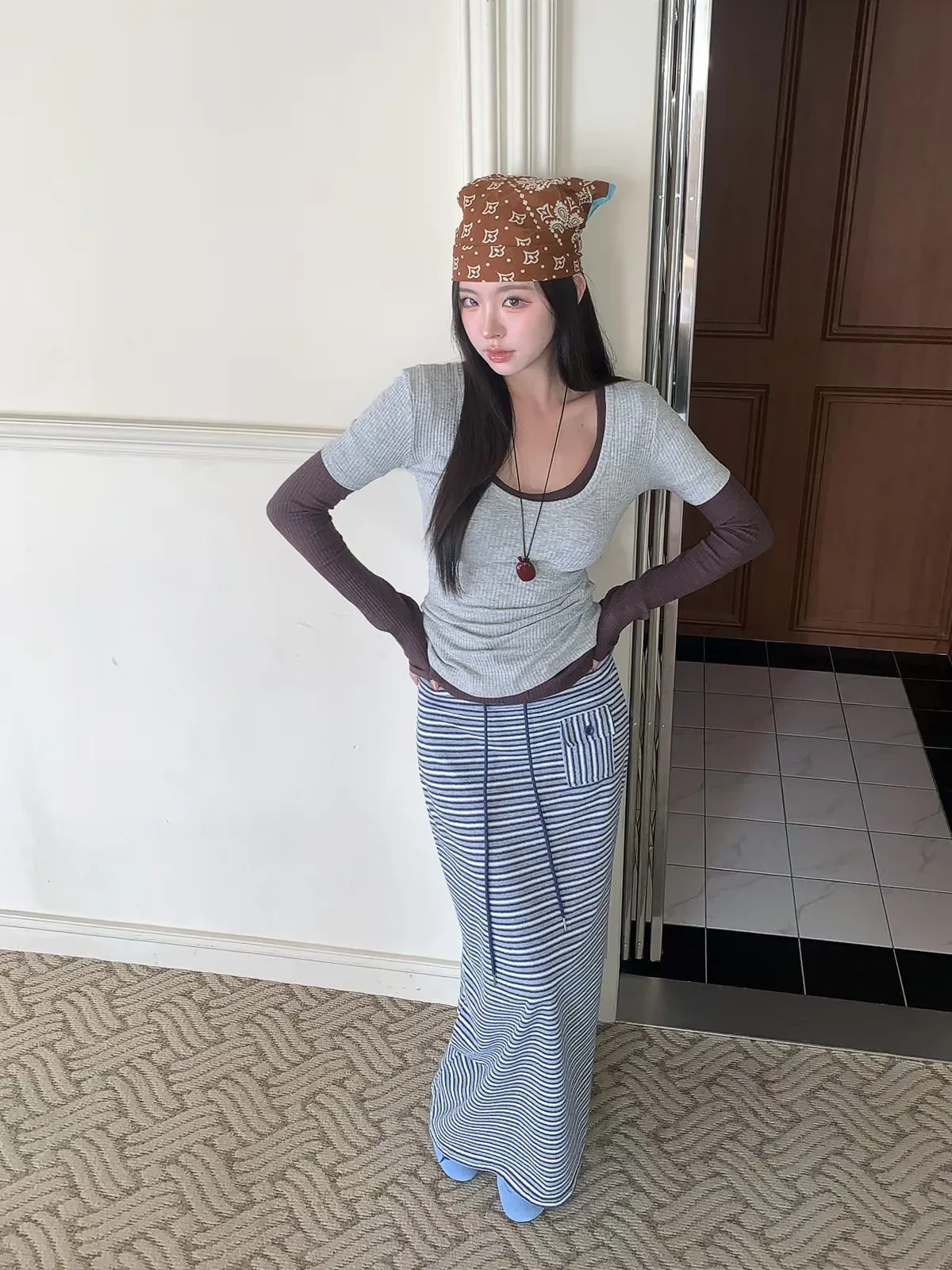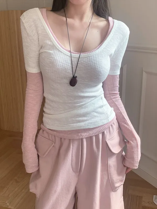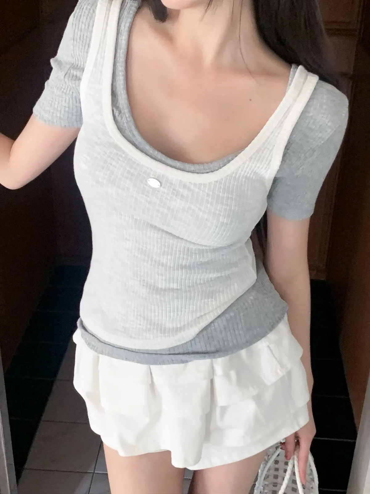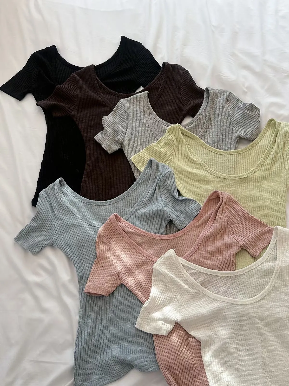 26EB16 正反穿U領坑條白搭層次短T 7色