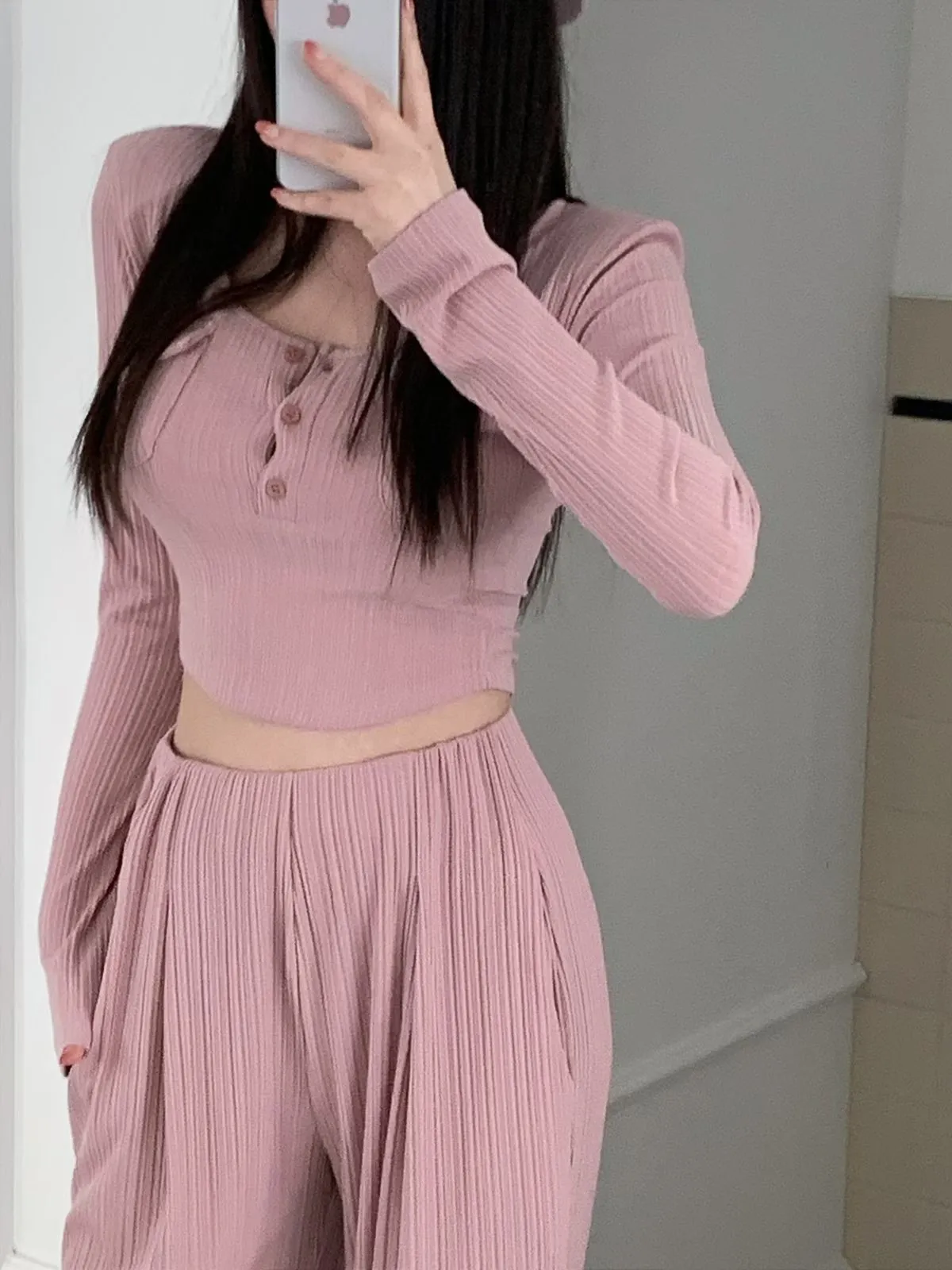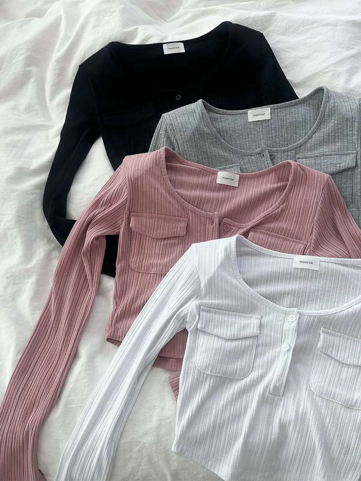 26EB21 雙口袋U領排扣短版長T 4色